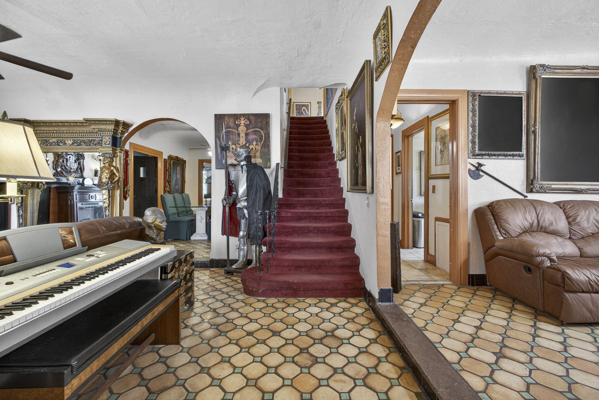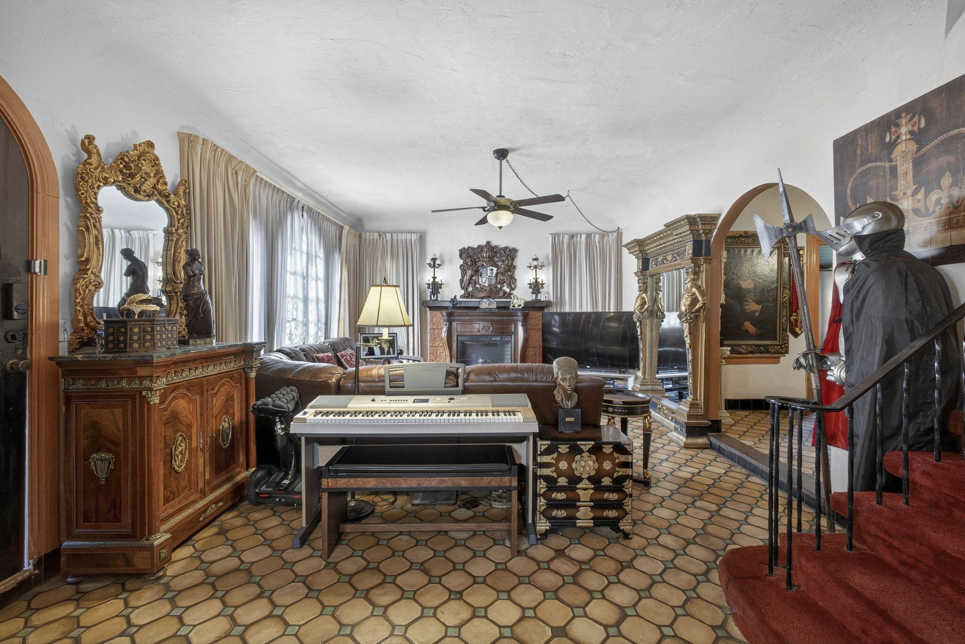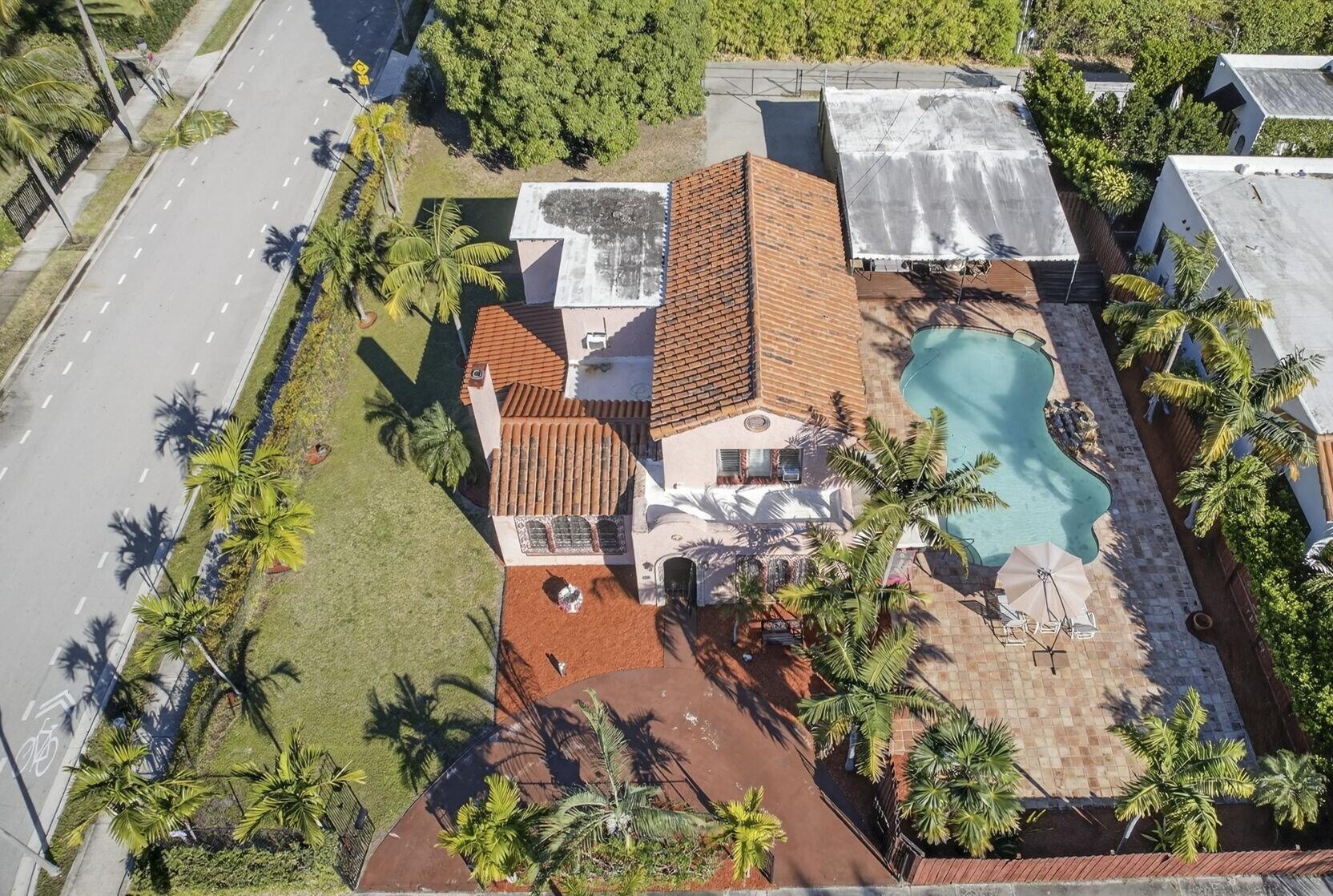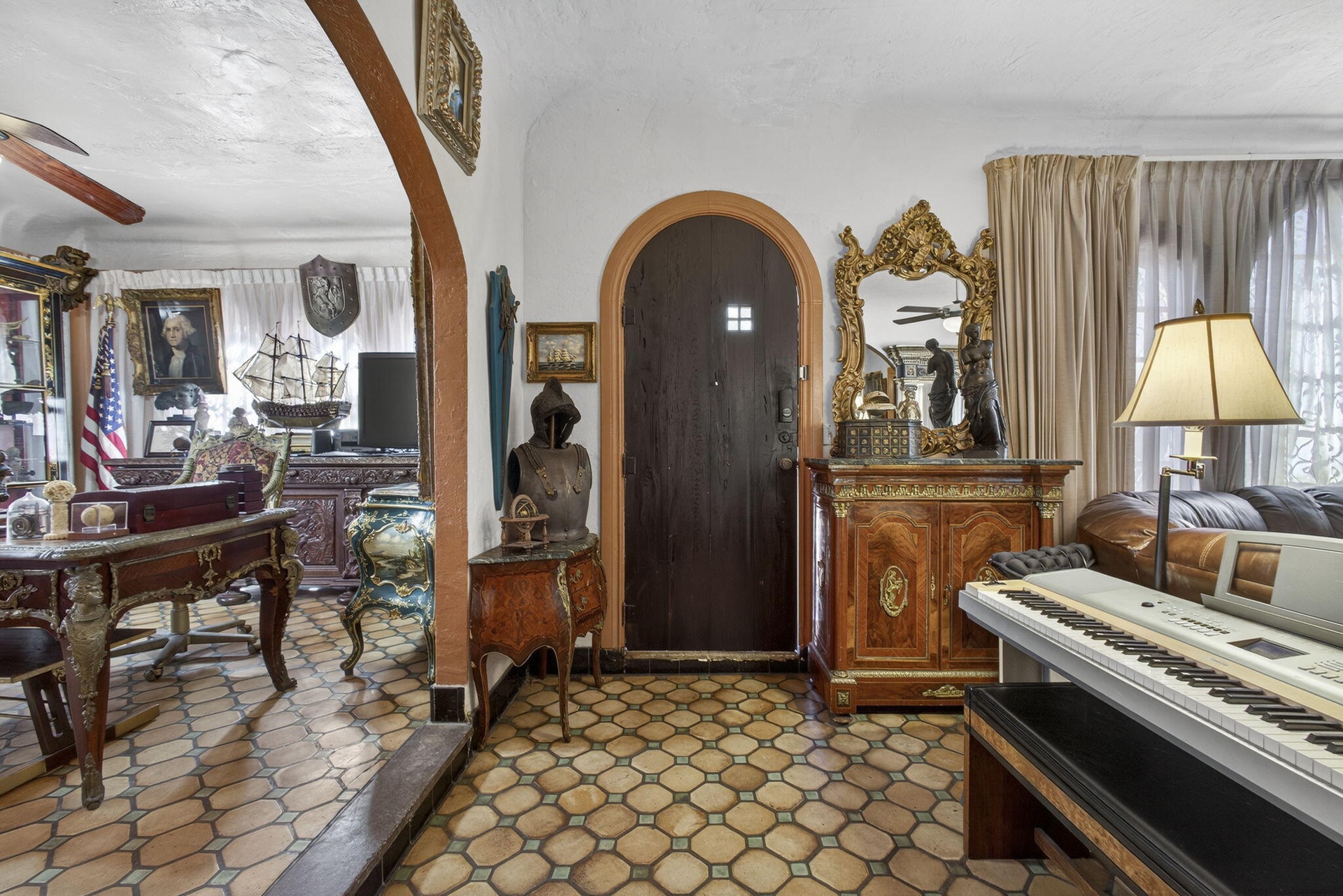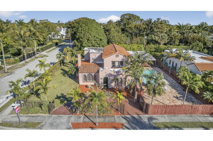 This distinguished two-story fully fenced residence offers five bedrooms and two bathrooms, with large and flexible living areas, spacious bedrooms, authentic Spanish-style flooring, and rich architectural details that reflect Volk's enduring influence on South Florida's most admired historic homes. Natural light, proportion, and craftsmanship define the interior, creating an atmosphere that is both elegant and inviting. Set on a generously sized lot, the outdoor environment features a large pool, lush landscaping, and ample space for entertaining, recreation, or quiet retreat. A detached cottage/casita with infrastructure for kitchen and bathroom already in place. This space provides exceptional flexibility for guests, extended family, or private work-from-home or office accommodations. The cottage faces one of the rare alleyways of the neighborhood, which allows for additional parking for guests to main home or cottage.