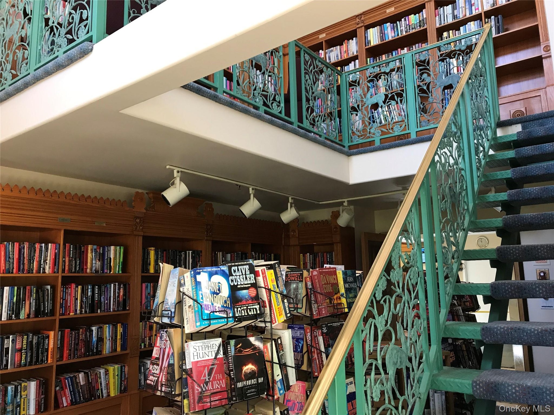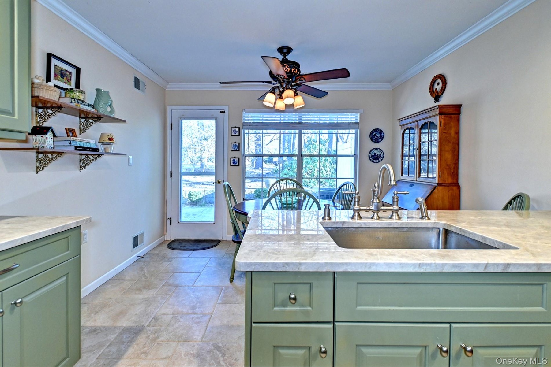 Inside, the home feels bright and expansive with a formal living room featuring a wood-burning fireplace, a formal dining room with cathedral ceilings, skylights, and abundant natural light throughout. The custom kitchen by NDA Kitchens features custom cabinetry, a built-in pantry, stainless steel appliances, quartz countertops, tumbled travertine backsplash tile and a porcelain tile floor.