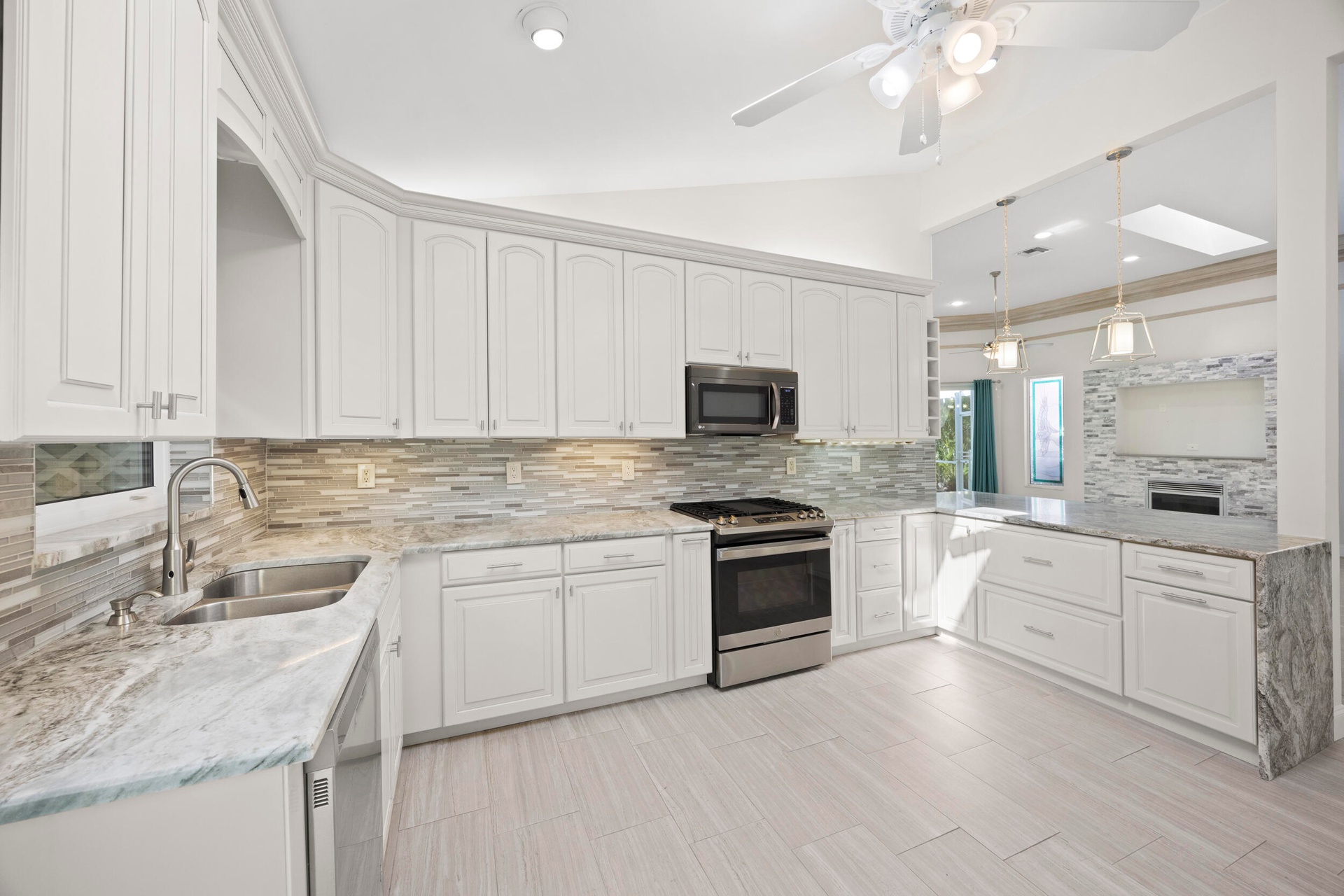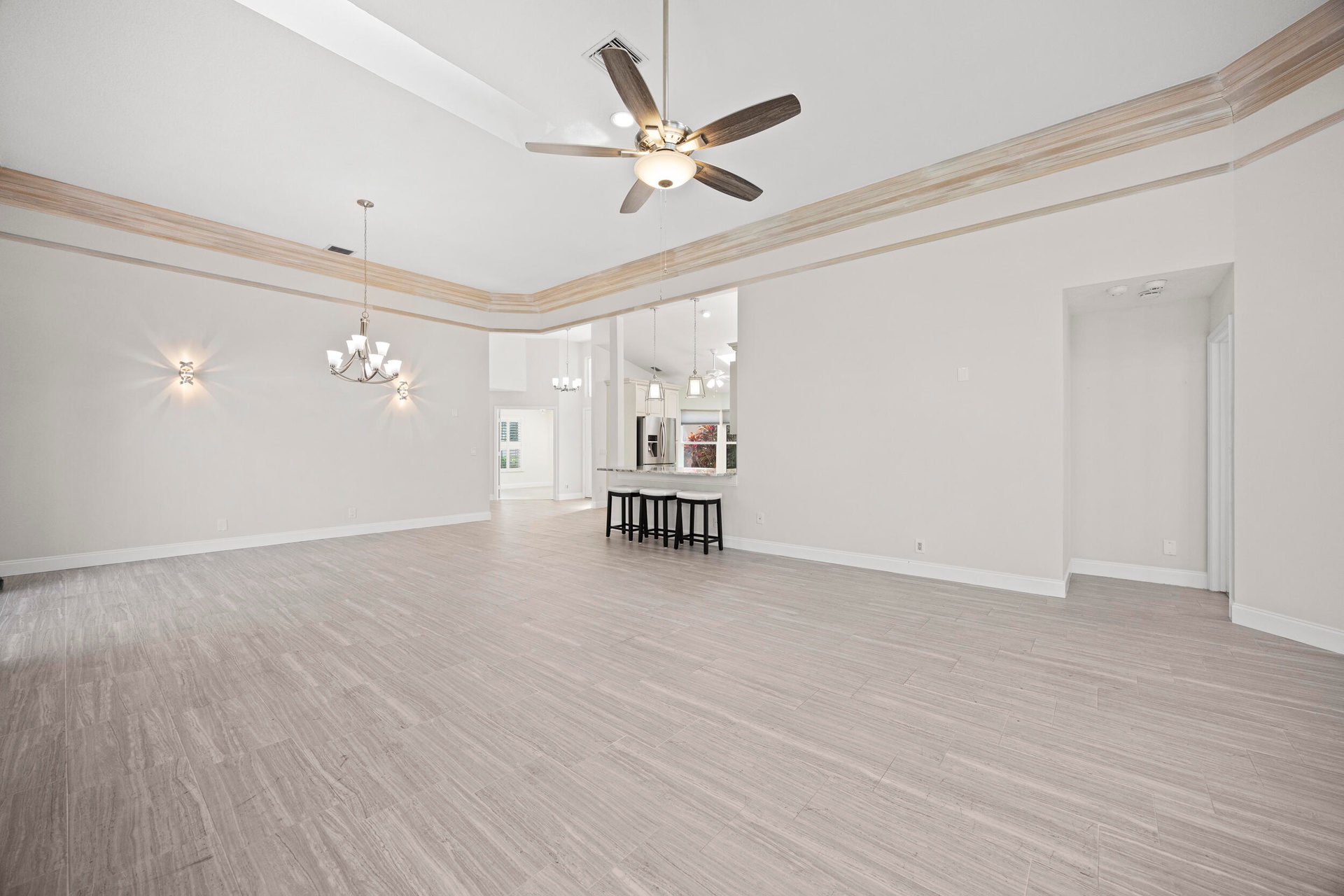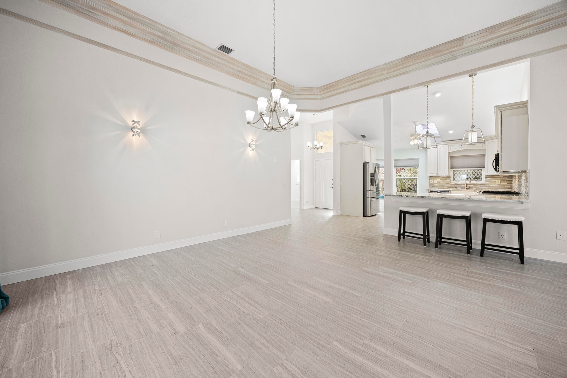 Natural light fills the home through its desirable northwest exposure, accentuating soaring ceilings, custom crown molding, and a striking stacked-stone fireplace with a built-in media wall that creates a warm and inviting focal point. READ MORE... The open-concept kitchen features granite countertops, stainless steel appliances, and seamless flow into the living and dining areas, making the home perfect for both everyday living and entertaining.