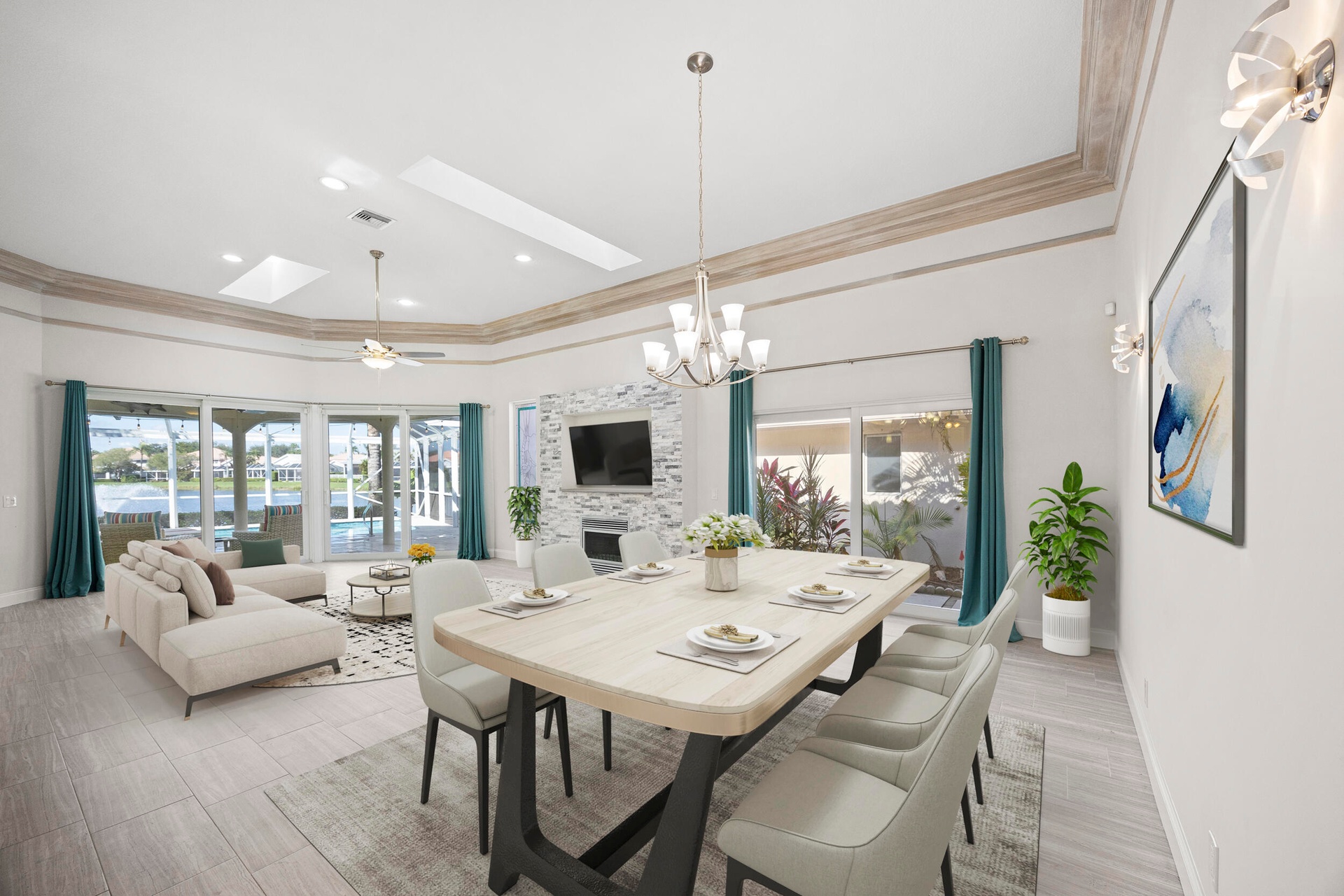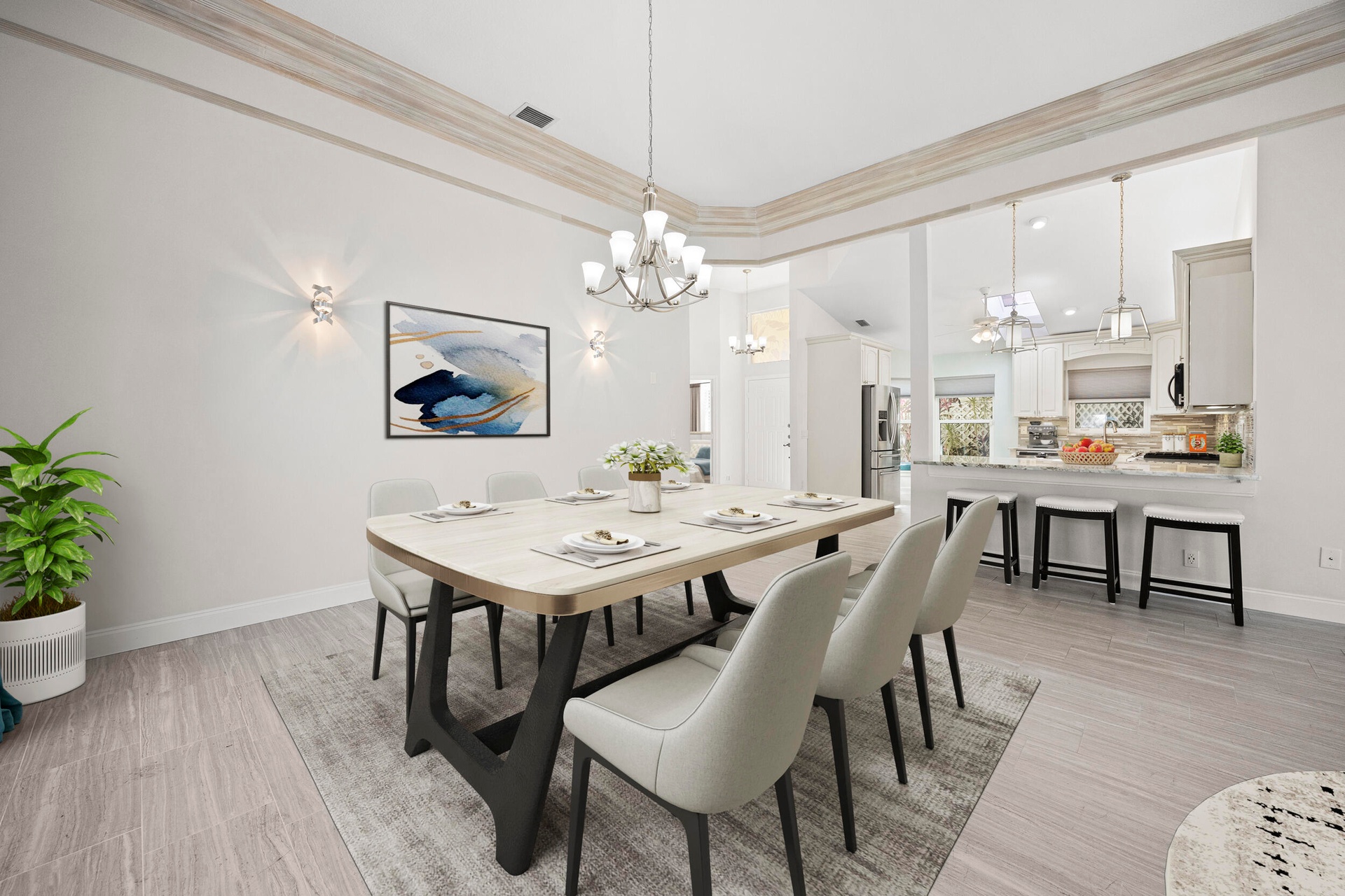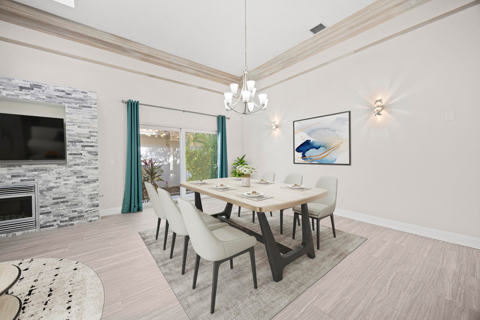 Natural light fills the home through its desirable northwest exposure, accentuating soaring ceilings, custom crown molding, and a striking stacked-stone fireplace with a built-in media wall that creates a warm and inviting focal point. READ MORE... The open-concept kitchen features granite countertops, stainless steel appliances, and seamless flow into the living and dining areas, making the home perfect for both everyday living and entertaining.