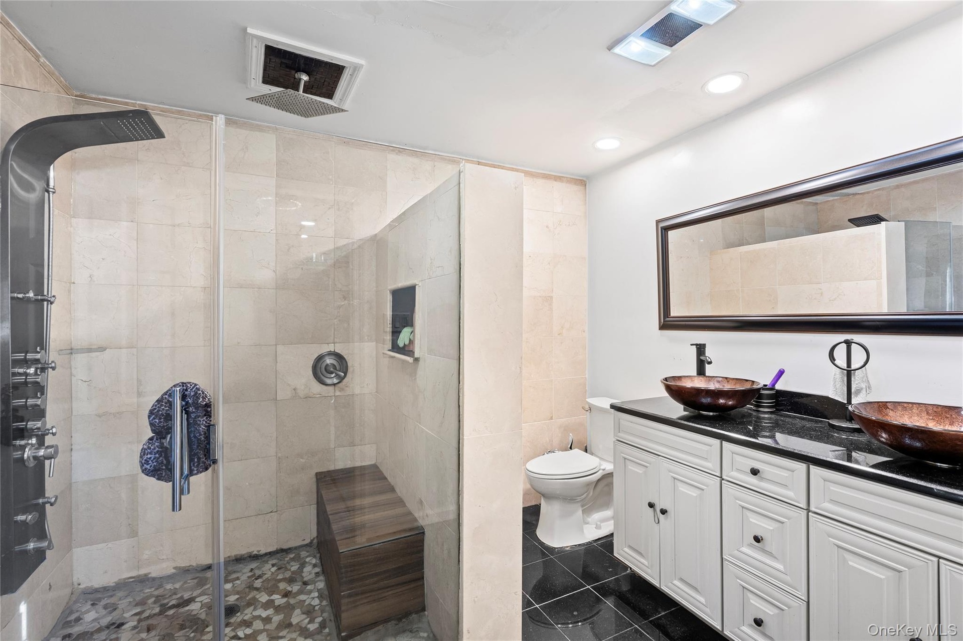 All 2.5 bathrooms have been tastefully updated, including the serene primary bath, which boasts radiant heated granite floors, a stylish vessel sinks, and a walk-in shower with a built-in bench for added comfort. The primary bedroom also features a cozy electric fireplace, creating the perfect private retreat.