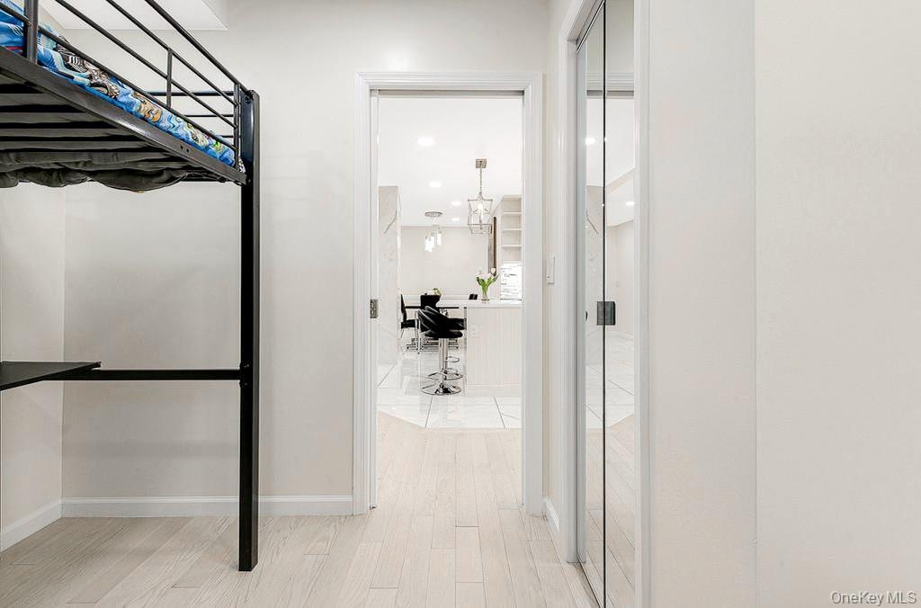The entry foyer works perfectly as a formal dining area and has an expansive walk in closet. Connecting effortlessly to your sun drenched living room, the apt features an open floor plan to accommodate a home office and modern work life balance, designed specifically for a sanctuary of productivity. Desirable southern exposure as the apt bathes in all-day sunlight, gently filtering through large windows framing lush green garden views. A convenient island w/a beautiful candlelight chandelier is centered in your well appointed kitchen featuring a French drawer 23 cubic ft refrigerator, ultimate stainless steel quiet dishwasher, self-cleaning ovens, large custom built in microwave, exterior venting exhaust system, farm size stainless steel sink with contemporary solid wood self-closing American made designer cabinetry, finished with solid Corian counter tops, high tech under cabinet and ceiling LED lighting and beautiful glass mosaic backsplash. Truly a chef’s dream with an abundance of cabinets for your storage needs. The 3 sizable bedrooms have well-designed closets & shelf lighting. Clean and efficient modern pocket door entry systems are used to maximize floor space. The primary bedroom has an on-suite bathroom w/a double sink, large drawers and ample storage. Contrasting marble-vein porcelain white tiles accented w/matte black hardware and a rainfall 2 way shower system. The 2nd full bath is lined w/marble-vein porcelain tiles, finished w/a modern olive tone vanity and gold tone hardware. Flawless design throughout. Flat modern led high-hats, efficient and quiet air conditioners, new plumbing & electrical throughout. The apartments flooring is hand-laid solid white oak renowned for its timeless beauty and durability.