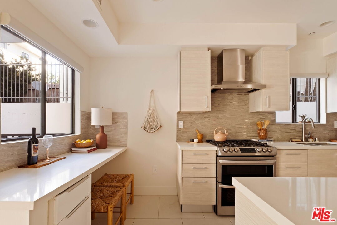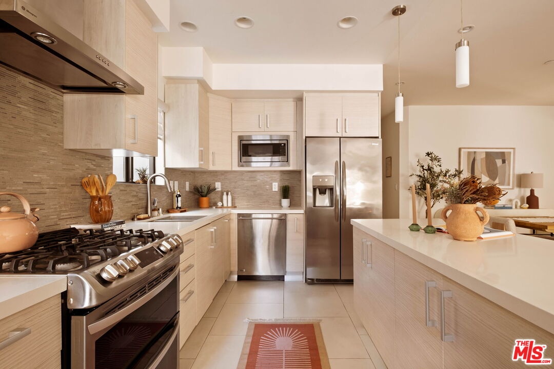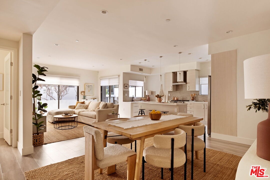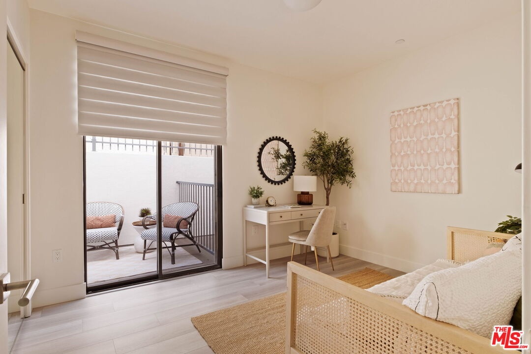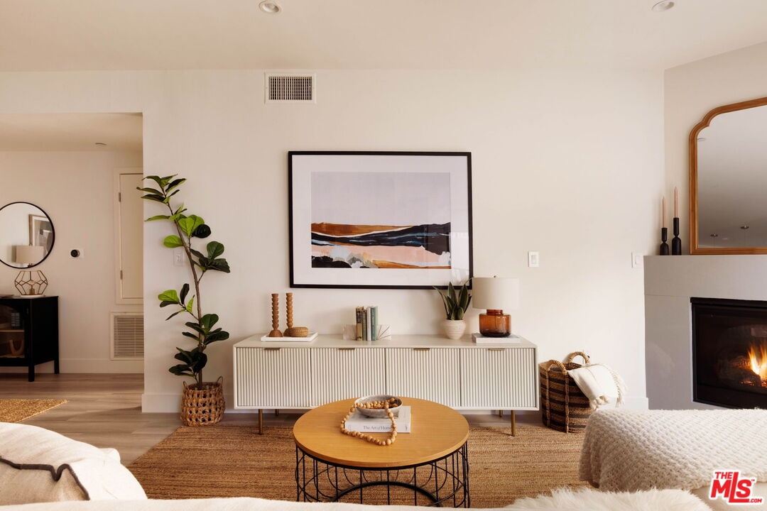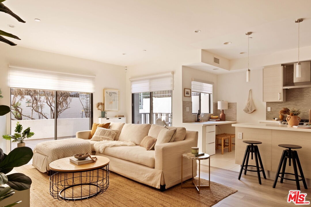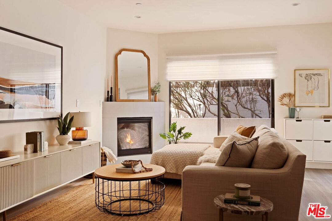 Welcome to this contemporary single-level condo located in the heart of Brentwood, one of Los Angeles' most sought-after neighborhoods. Set within an intimate nine-unit building, this three-bedroom, three-bathroom residence spans a single level, and is tucked into the rear of the building for optimal privacy. The home's high ceilings, abundant natural light, and thoughtfully designed floor plan effortlessly balances everyday comfort with stylish finishes. Step inside to newer flooring that carries throughout the home, creating a clean and cohesive feel. The main living area is inviting and refined, featuring recessed lighting and a charming gas fireplace that anchors the space. Floor-to-ceiling sliding glass doors fill the home with natural light seamlessly blending indoor and outdoor living. The chef's kitchen is both beautiful and functional, appointed with sleek cabinetry, quartz countertops, upgraded stainless steel appliances, and a generous center island. Open to the living and dining areas, it's perfectly suited for casual gatherings or hosting friends and family. Just outside, the private patio provides a peaceful place for morning coffee or relaxed evenings dining al fresco. The primary suite is privately positioned at one end of the home, offering a true retreat. It features a spacious walk-in closet, access to a second private patio, and a spa-inspired en-suite bath with dual vanities, a deep soaking tub, and a separate shower. The second bedroom offers flexibility for a guest room, nursery, gym, or home office, with a full bath conveniently located across the hall. On the opposite end of the hallway, the third bedroom enjoys its own en-suite bathroom with a walk-in shower, dedicated linen closet, and direct access to the outdoors. Additional highlights include an in-unit laundry closet with washer and dryer, central heating and air conditioning, custom shelving, and automated Wi-Fi enabled Hunter Douglas Pirouette shades throughout. Building amenities include controlled entry, elevator access, a gated underground garage with two dedicated parking spaces, and guest parking. Ideally located moments from the Brentwood Farmers Market and the shops and restaurants along San Vicente Boulevard and Wilshire, this move-in-ready condo offers the perfect blend of privacy, convenience, and Brentwood lifestyle.