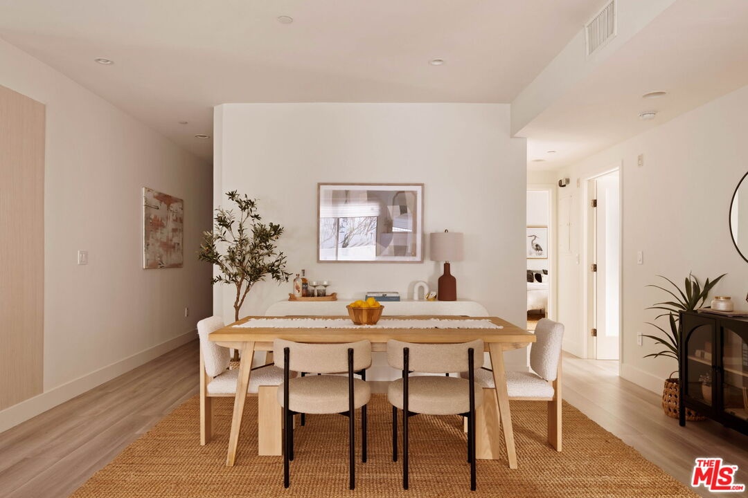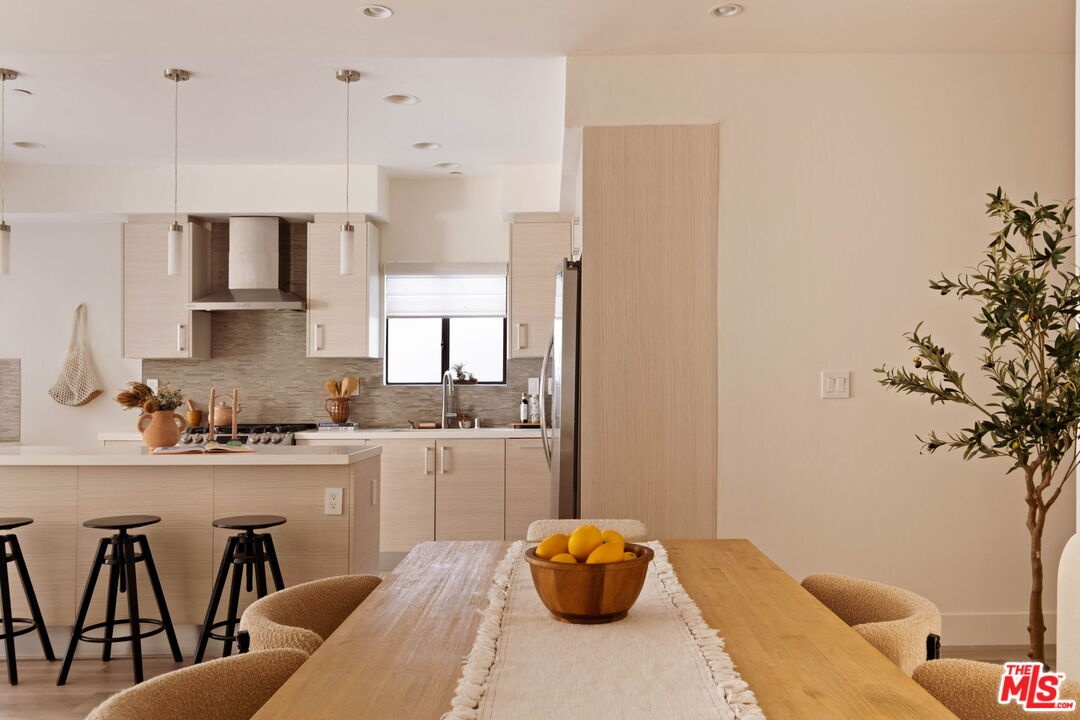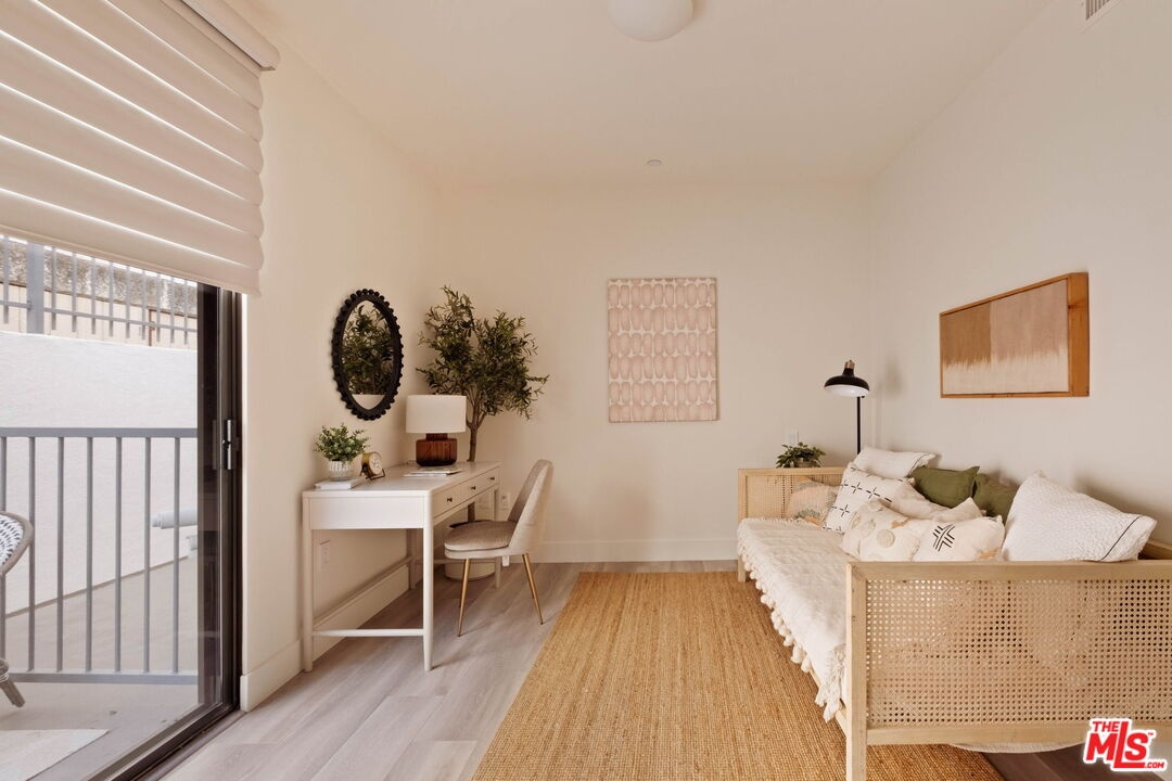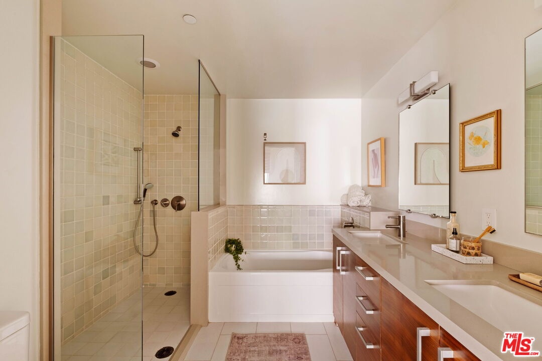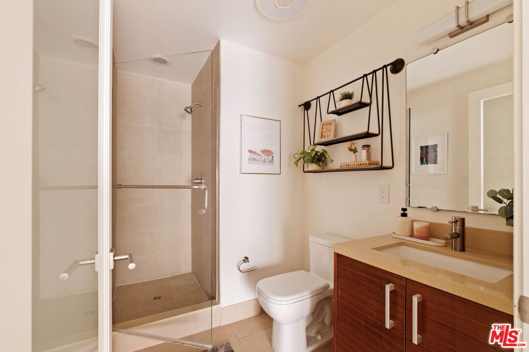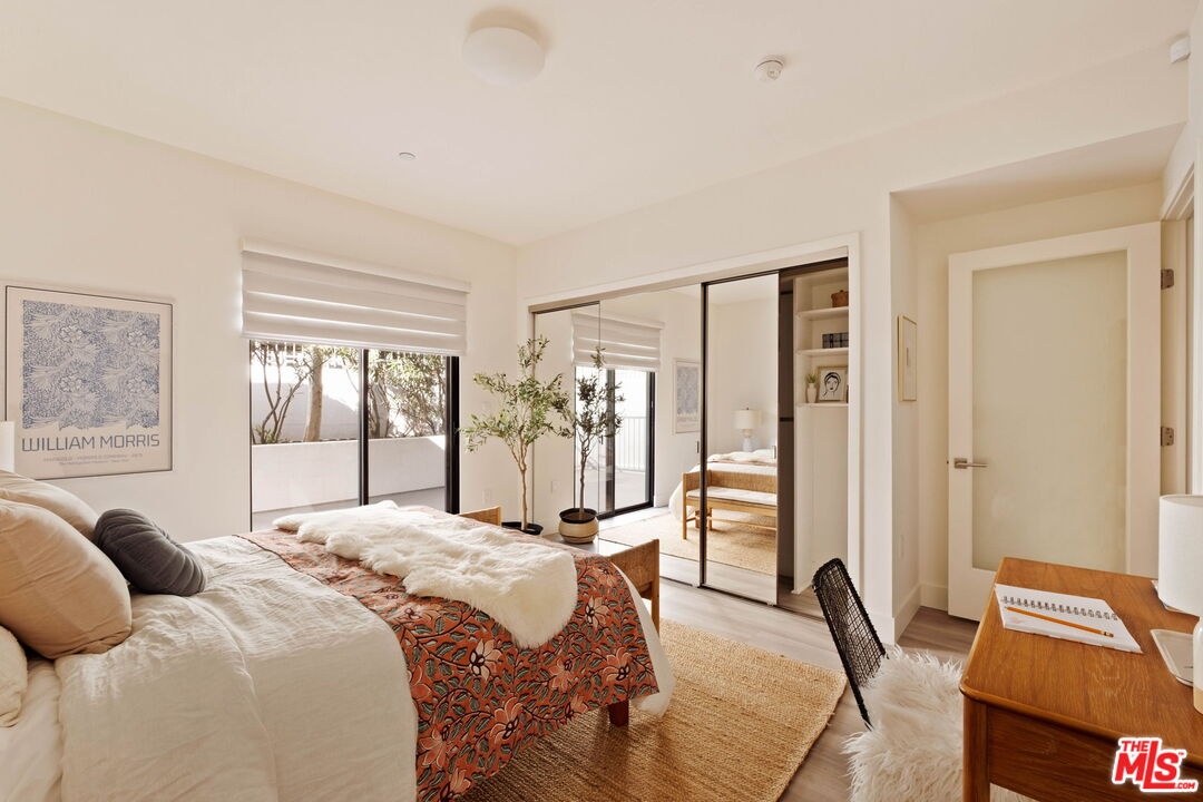 Welcome to this contemporary single-level condo located in the heart of Brentwood, one of Los Angeles' most sought-after neighborhoods. Set within an intimate nine-unit building, this three-bedroom, three-bathroom residence spans a single level, and is tucked into the rear of the building for optimal privacy. The home's high ceilings, abundant natural light, and thoughtfully designed floor plan effortlessly balances everyday comfort with stylish finishes. Step inside to newer flooring that carries throughout the home, creating a clean and cohesive feel. The main living area is inviting and refined, featuring recessed lighting and a charming gas fireplace that anchors the space. Floor-to-ceiling sliding glass doors fill the home with natural light seamlessly blending indoor and outdoor living. The chef's kitchen is both beautiful and functional, appointed with sleek cabinetry, quartz countertops, upgraded stainless steel appliances, and a generous center island. Open to the living and dining areas, it's perfectly suited for casual gatherings or hosting friends and family. Just outside, the private patio provides a peaceful place for morning coffee or relaxed evenings dining al fresco. The primary suite is privately positioned at one end of the home, offering a true retreat. It features a spacious walk-in closet, access to a second private patio, and a spa-inspired en-suite bath with dual vanities, a deep soaking tub, and a separate shower. The second bedroom offers flexibility for a guest room, nursery, gym, or home office, with a full bath conveniently located across the hall. On the opposite end of the hallway, the third bedroom enjoys its own en-suite bathroom with a walk-in shower, dedicated linen closet, and direct access to the outdoors. Additional highlights include an in-unit laundry closet with washer and dryer, central heating and air conditioning, custom shelving, and automated Wi-Fi enabled Hunter Douglas Pirouette shades throughout. Building amenities include controlled entry, elevator access, a gated underground garage with two dedicated parking spaces, and guest parking. Ideally located moments from the Brentwood Farmers Market and the shops and restaurants along San Vicente Boulevard and Wilshire, this move-in-ready condo offers the perfect blend of privacy, convenience, and Brentwood lifestyle.