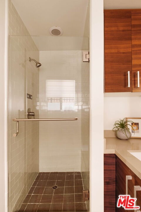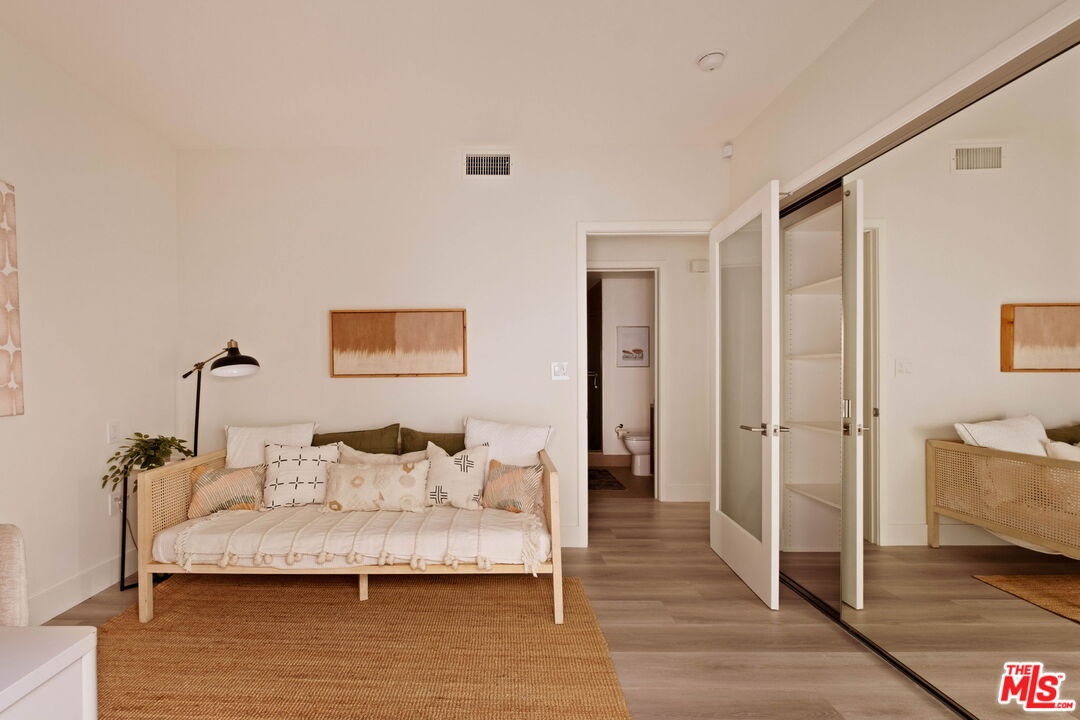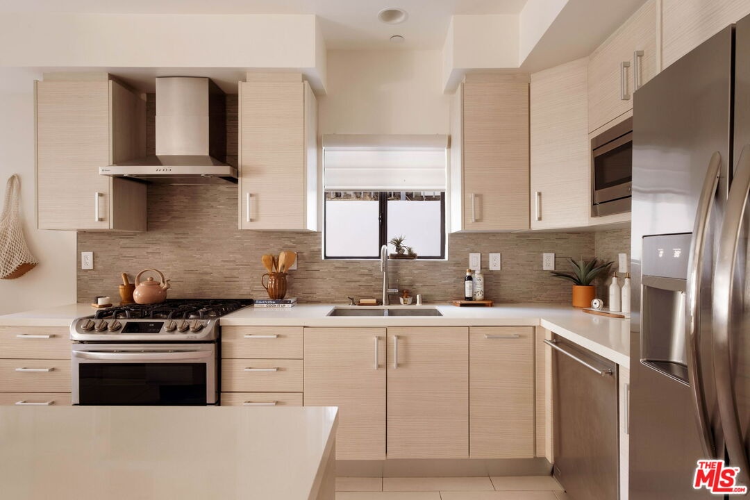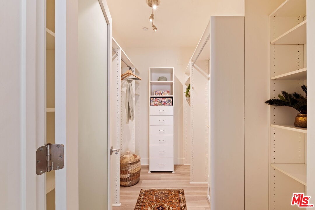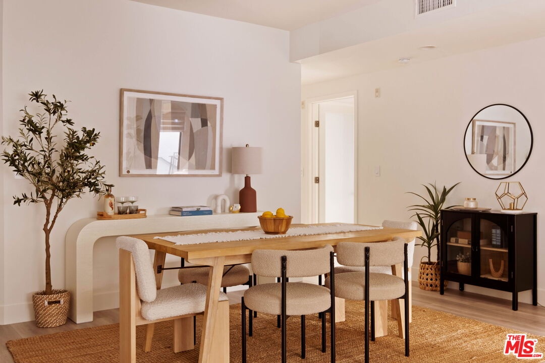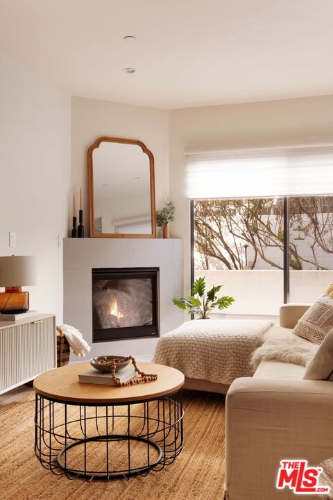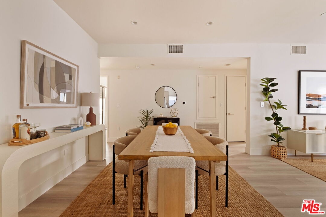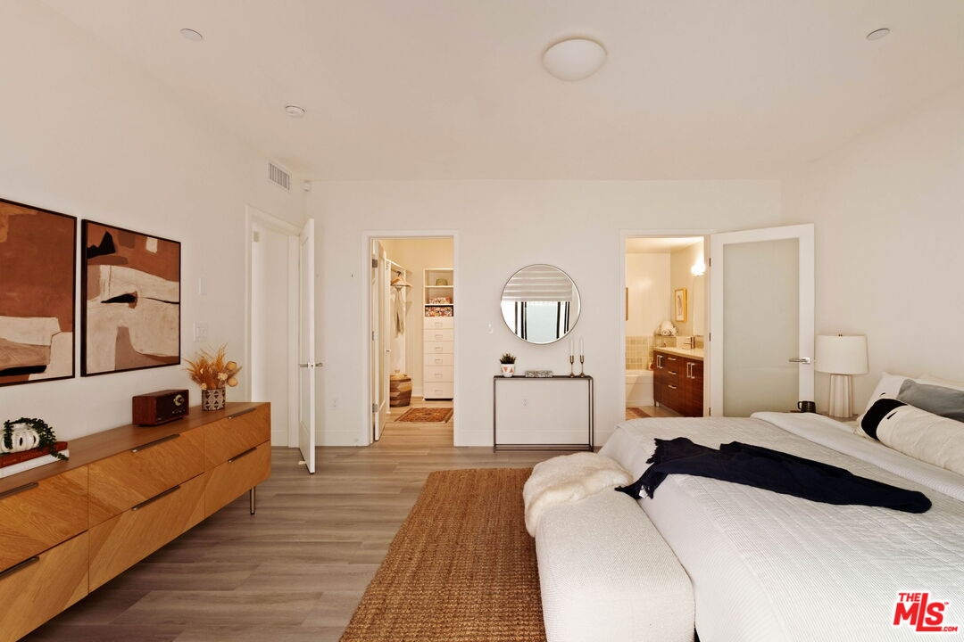 Welcome to this contemporary single-level condo located in the heart of Brentwood, one of Los Angeles' most sought-after neighborhoods. Set within an intimate nine-unit building, this three-bedroom, three-bathroom residence spans a single level, and is tucked into the rear of the building for optimal privacy. The home's high ceilings, abundant natural light, and thoughtfully designed floor plan effortlessly balances everyday comfort with stylish finishes. Step inside to newer flooring that carries throughout the home, creating a clean and cohesive feel. The main living area is inviting and refined, featuring recessed lighting and a charming gas fireplace that anchors the space. Floor-to-ceiling sliding glass doors fill the home with natural light seamlessly blending indoor and outdoor living. The chef's kitchen is both beautiful and functional, appointed with sleek cabinetry, quartz countertops, upgraded stainless steel appliances, and a generous center island. Open to the living and dining areas, it's perfectly suited for casual gatherings or hosting friends and family. Just outside, the private patio provides a peaceful place for morning coffee or relaxed evenings dining al fresco. The primary suite is privately positioned at one end of the home, offering a true retreat. It features a spacious walk-in closet, access to a second private patio, and a spa-inspired en-suite bath with dual vanities, a deep soaking tub, and a separate shower. The second bedroom offers flexibility for a guest room, nursery, gym, or home office, with a full bath conveniently located across the hall. On the opposite end of the hallway, the third bedroom enjoys its own en-suite bathroom with a walk-in shower, dedicated linen closet, and direct access to the outdoors. Additional highlights include an in-unit laundry closet with washer and dryer, central heating and air conditioning, custom shelving, and automated Wi-Fi enabled Hunter Douglas Pirouette shades throughout. Building amenities include controlled entry, elevator access, a gated underground garage with two dedicated parking spaces, and guest parking. Ideally located moments from the Brentwood Farmers Market and the shops and restaurants along San Vicente Boulevard and Wilshire, this move-in-ready condo offers the perfect blend of privacy, convenience, and Brentwood lifestyle.