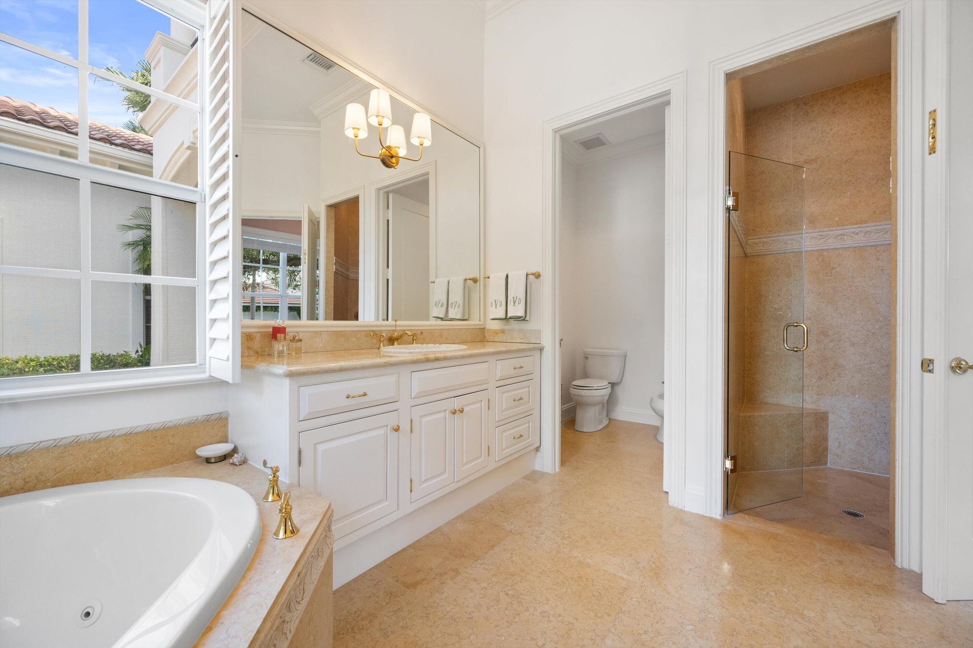 The powder and cabana baths feature Macchia Vecchia marble countertops and designer wallpaper, seamlessly continuing the home's elevated aesthetic. The primary suite, guest suite, and office are conveniently located on the main level, with two additional guest suites and a versatile loft upstairs. Additional enhancements include new carpeting in the primary and guest suites, all-new lighting and sconces throughout, and complete interior and exterior repainting in 2024.
