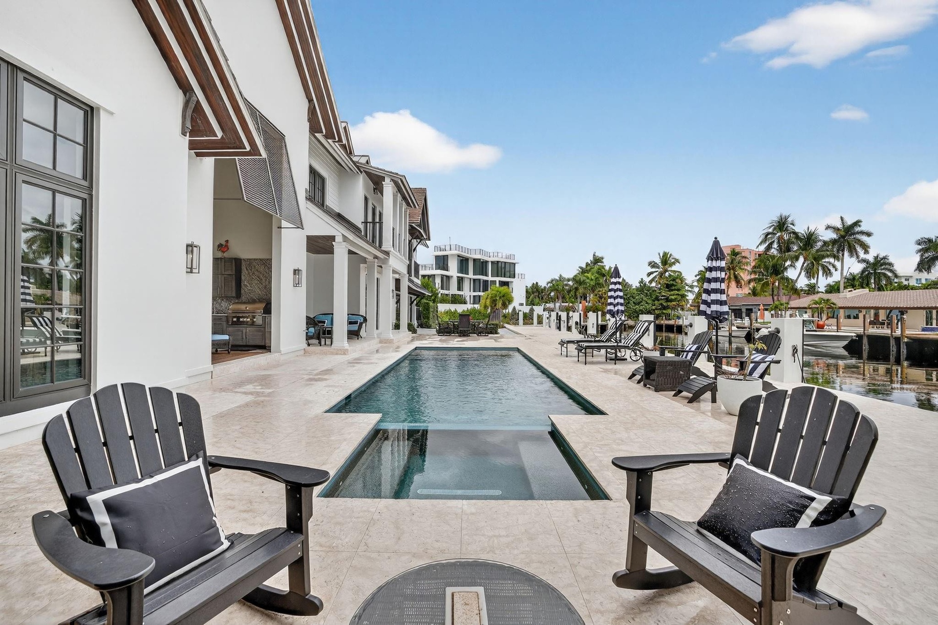 Create your own private luxury marina environment just off Las Olas! 376 ft of deep-water dockage on two wide canals allows comparable dockage to point properties! Main residence 168ft & separate west dock 208ft & 3 phase power. Enjoy supreme privacy & great Las Olas proximity, surrounding multi million-dollar residences. British West Indies inspired architecture, high quality custom build & detailing throughout, welcoming great room with vaulted ceiling, chef's kitchen, two primary suites (main suite 1st level), guest suite, laundry & guest bath. 2nd level comprises additional primary suite (or Captain's Quarters), open office, two additional large bedroom suites. Entire 3rd level large private bedroom suite. Extremely flexible floorplan. 3 car garage. West dock 5 guest parking spaces.