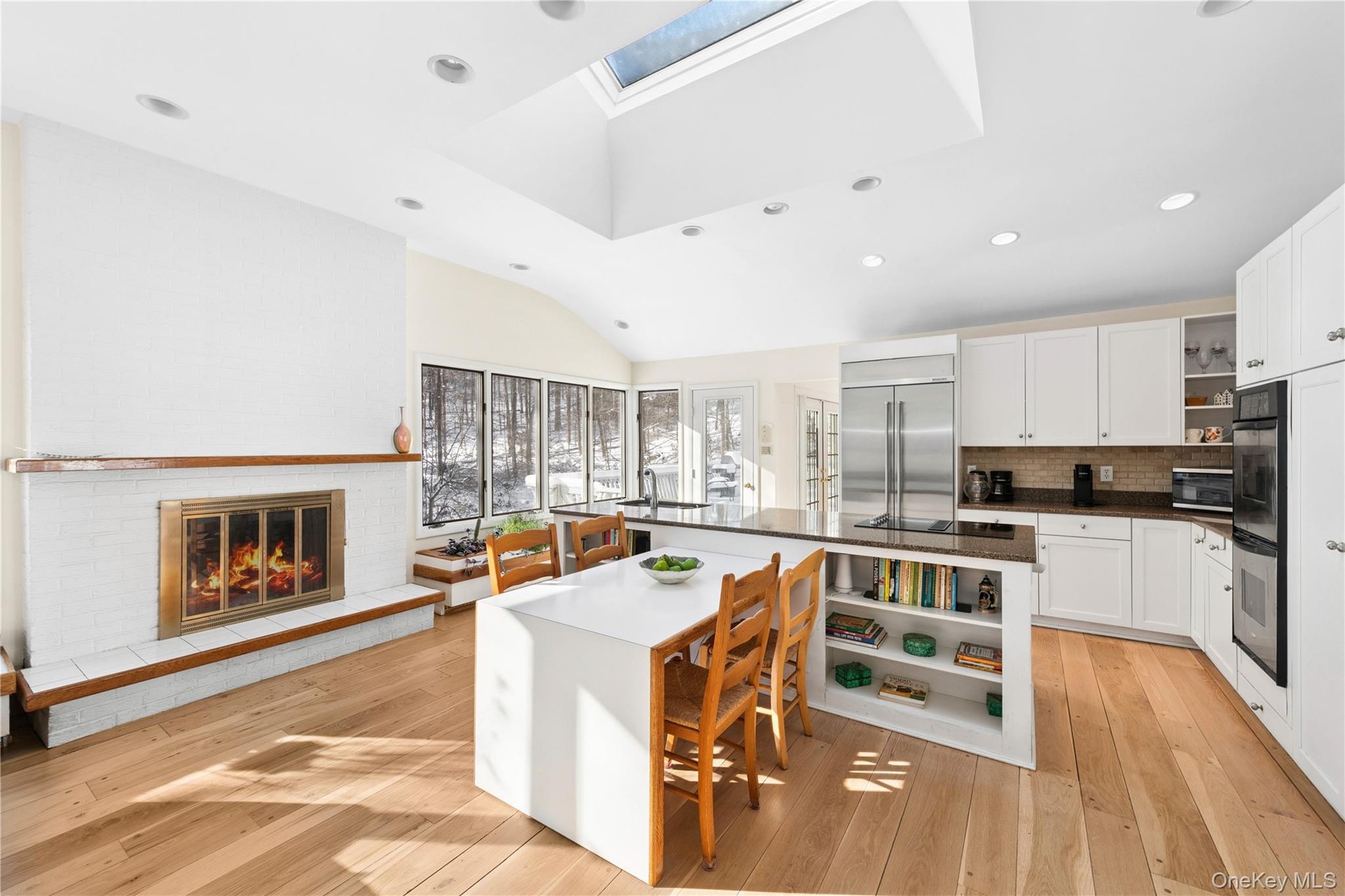 Nestled on 2.4 rolling acres at the end of a quiet cul-de-sac, this four-bedroom, three-bath California Ranch offers privacy, serenity, and seamless indoor-outdoor living. The gourmet kitchen includes a built-in refrigerator, cooktop, granite island, and custom cabinetry, flowing into a sun-drenched family room with a wood-burning fireplace, vaulted ceilings, skylights, and an integrated living planting feature. A gracious living room with French doors leads to a screened sunroom featuring a vaulted wood ceiling and exposed beams, adding warmth and architectural interest, with ample space for lounging or gatherings while enjoying surrounding views from spring through fall. The dining room is off the living room and opens to an expansive deck, perfect for entertaining. The lower level features a private entrance, a family room with fireplace, bonus room for art, music, or recreation, laundry room, full bath, and a guest room or office—perfect for an in-law suite, nanny quarters, or home office. Recent upgrades include the roof, gutters, windows, hot water heater, dryer, and two Bosch air-conditioning units with heat pumps. Outside, expansive decks and the screened sunroom overlook private wooded acreage, while rolling grounds are framed by original stone walls. Just minutes from express trains to NYC, Chappaqua schools, Whole Foods, downtown Chappaqua shops and restaurants, and Northern Westchester Hospital, this exceptional property offers a rare opportunity to own a private sanctuary in one of New Castle’s most desirable neighborhoods.