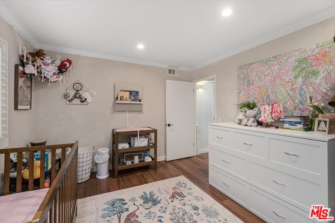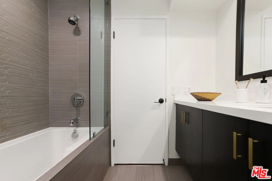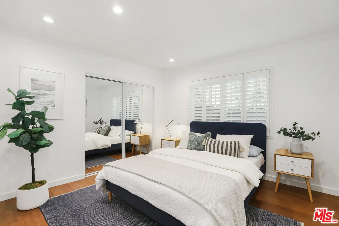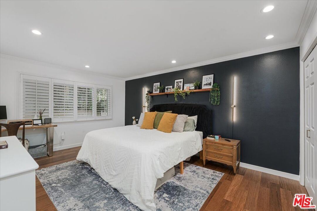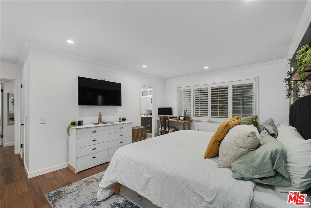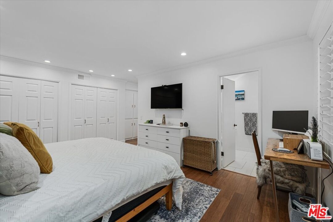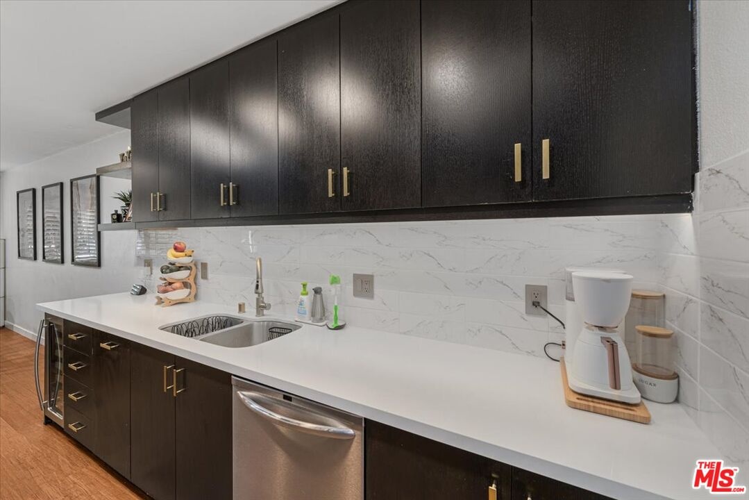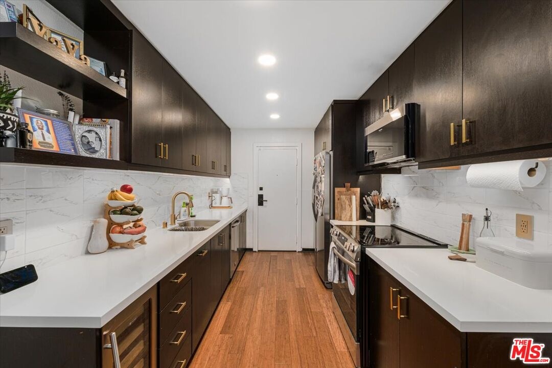 Located in the heart of trendy West Hollywood, this front-facing corner unit, within the Bristol, offers modern living just steps from top shopping, dining, and sidewalk cafes. This spacious 2-bedroom, 2-bath condo features a private balcony and an open floor plan ideal for everyday living and entertaining. Upgrades include hardwood floors, dimmable recessed lighting throughout, a NEST thermostat, Shutters that fully open bringing in even more light, and updated double-pane windows and slider, The newly remodeled kitchen showcases espresso cabinetry with gold hardware with cabinet under lighting, brand new upgraded appliances, a pantry next to the fridge, and a built-in wine/beverage fridge. A newly built bar area off of the living room includes storage and a brand-new, in-unit, washer and dryer, which is rare for the building. The oversized primary suite offers an en-suite bath and exceptional storage, including a walk-in closet plus two additional, large, bi-fold closets. The Primary bathroom custom bathroom features a glass shower and the guest bathroom includes a modern vanity and a large Americh soaking tub with a shower. The guest bedroom is generously sized and currently styled as a children's room, but plenty of room to put a queen bed with side tables or a dresser, offering flexibility for various living needs. Building amenities include secured lobby entry, rare side-by-side parking spaces, pool, courtyard, sundeck, community laundry, and a private storage locker. An amazing opportunity to enjoy space, style, and walkable West Hollywood living in one of the area's most desirable buildings.