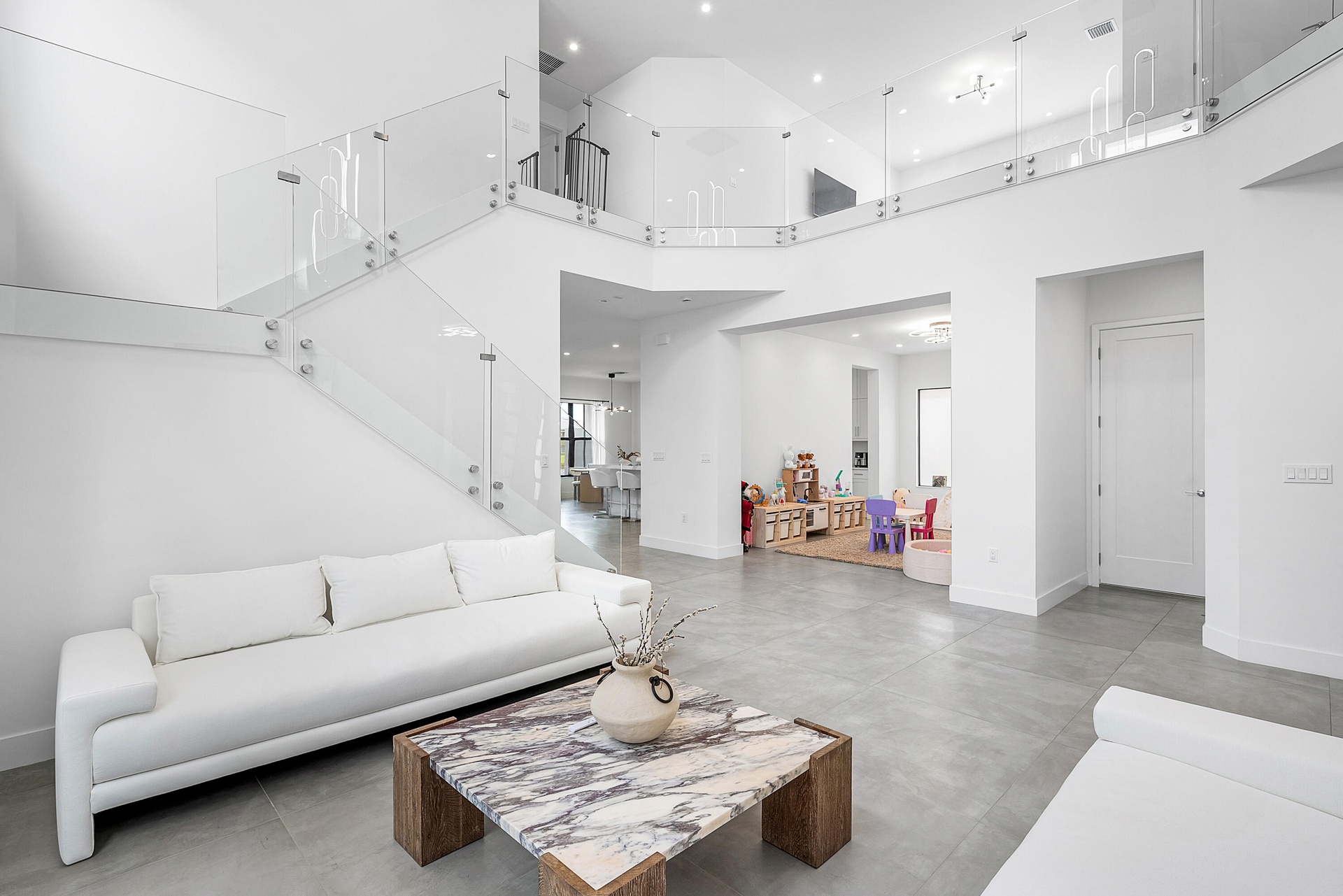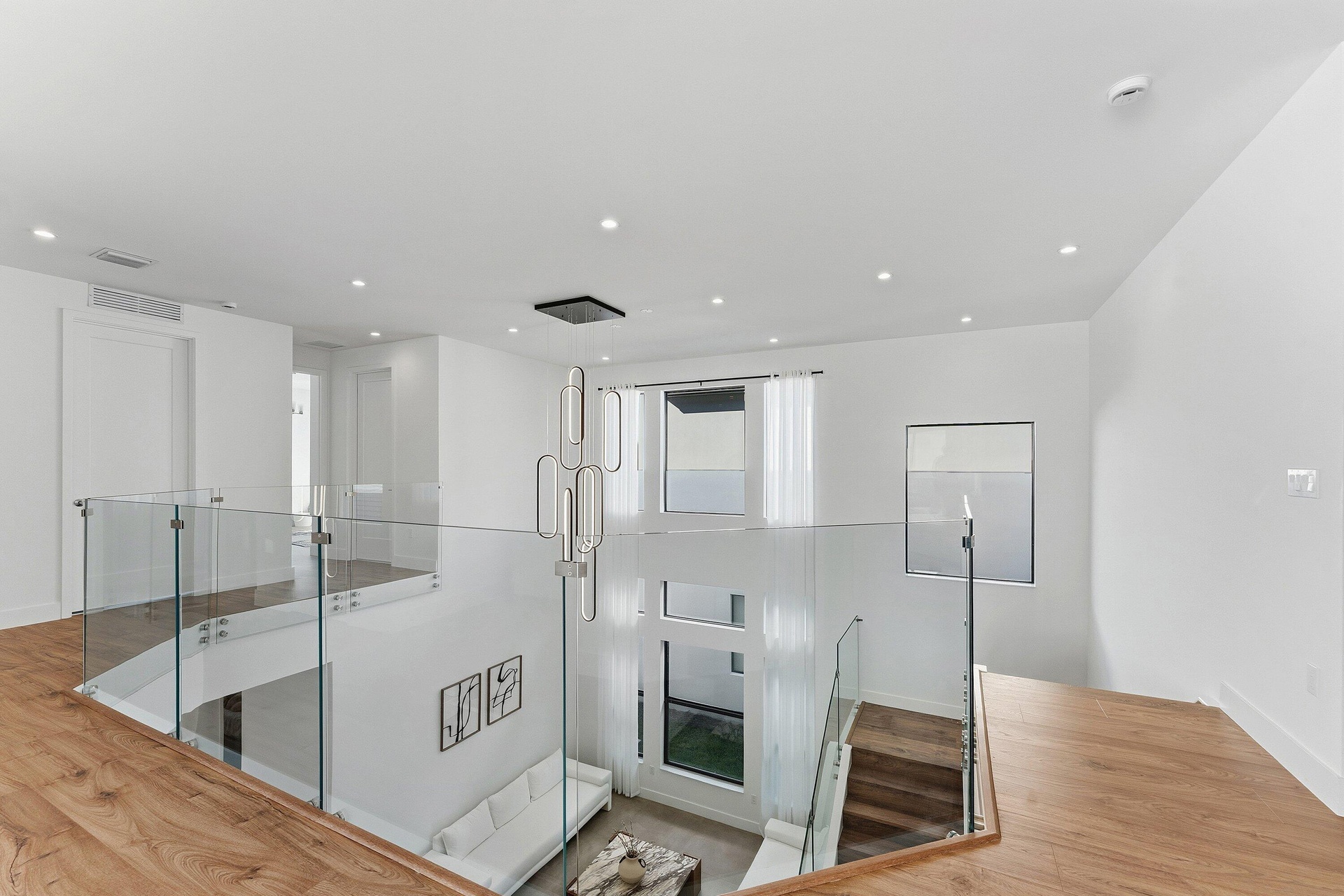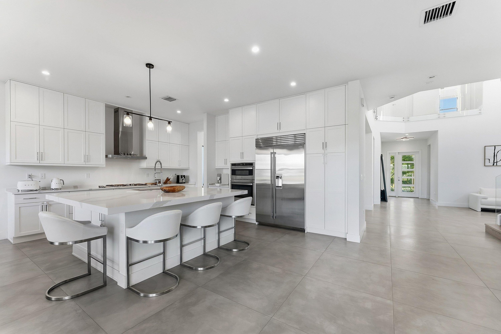 From the moment you enter, the architecture makes a statement. A sleek glass-railed staircase draws the eye upward, paired with rich wood flooring on the second level and oversized large-format porcelain tile throughout the main living areas. Floor-to-ceiling cabinetry and a Sub-Zero refrigerator anchor a clean, contemporary kitchen aesthetic, blending functionality with elevated design. The open layout is light-filled and airy, with tranquil lake views that become part of the daily living experience. The backyard is the true showpiece. Overlooking the water, the setting offers a sense of calm, openness, and visual depth that only a premium lake lot can provide. Whether enjoying quiet mornings by the pool or hosting sunset gatherings, the outdoor space feels like a private retreat, framed by reflections of the sky and water that change beautifully throughout the day.