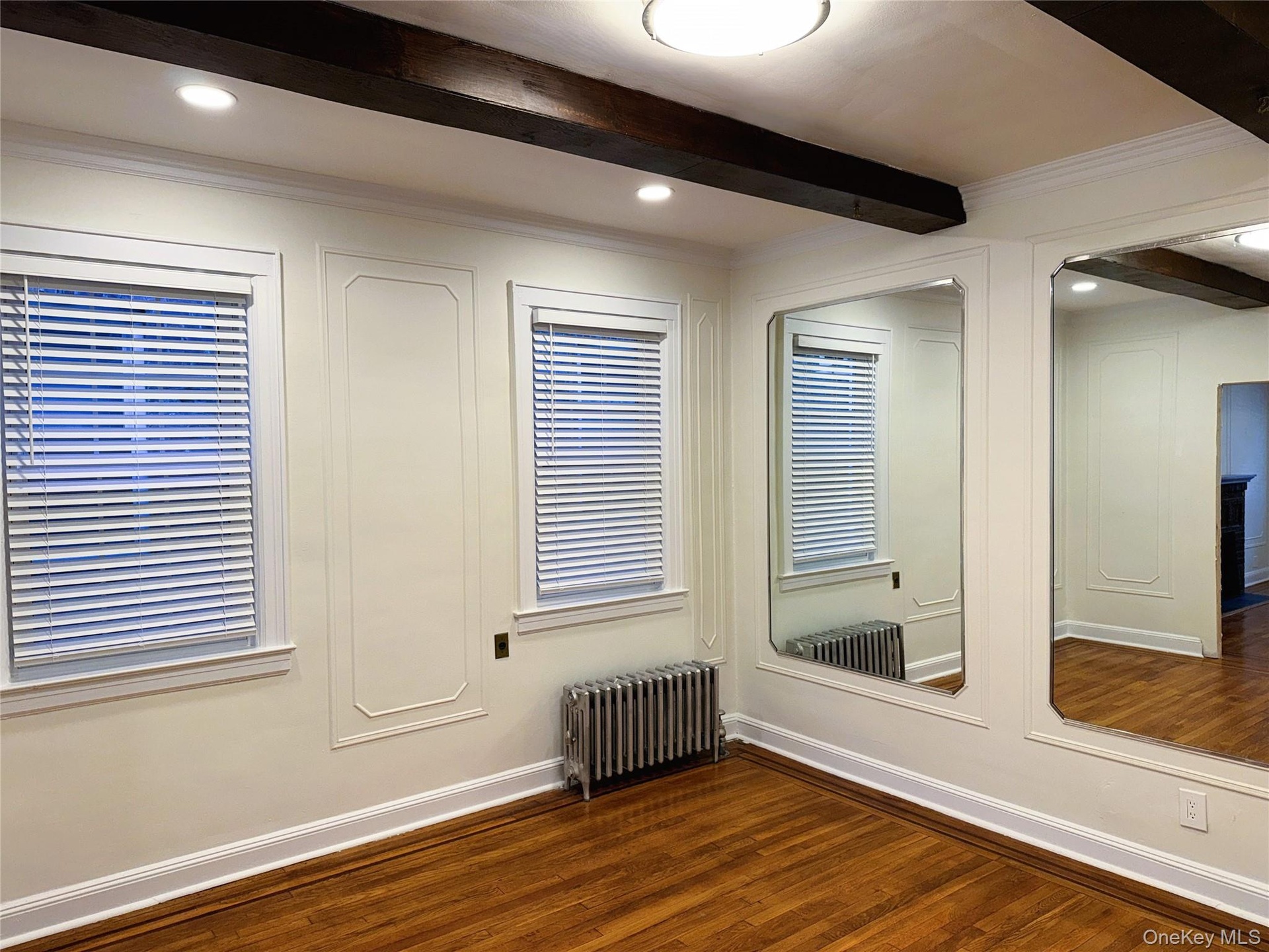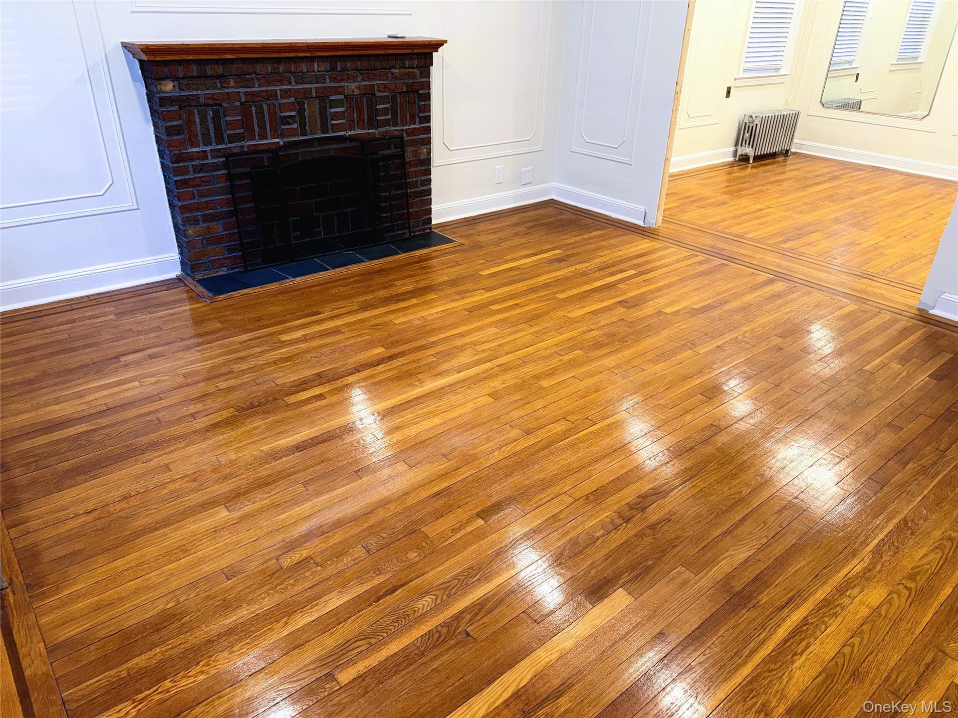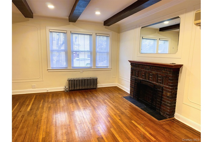 This home features beautiful hardwood floors throughout, high ceilings with exposed beams, and classic character including decorative wall molding and a brick decorative fireplace. Bright, windowed rooms and thoughtful finishes make the space feel open and inviting.