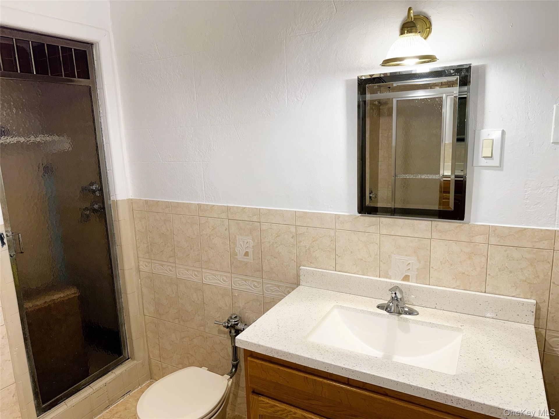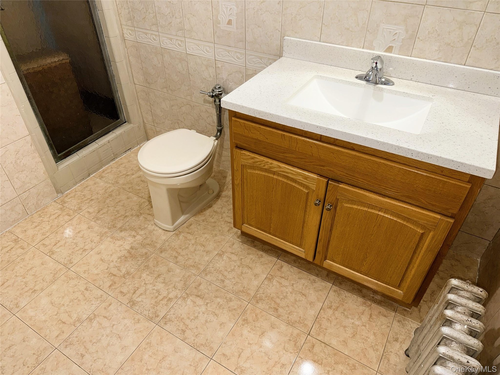 The windowed bathroom is finished in tile and includes a vanity and a tub/shower with sliding glass doors.
