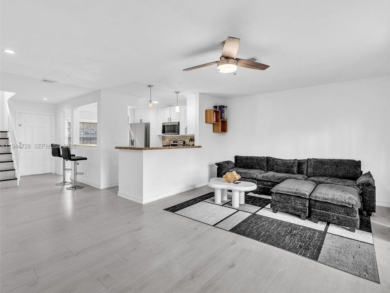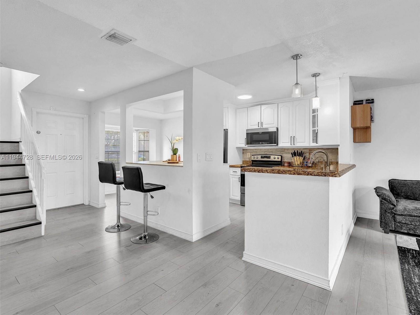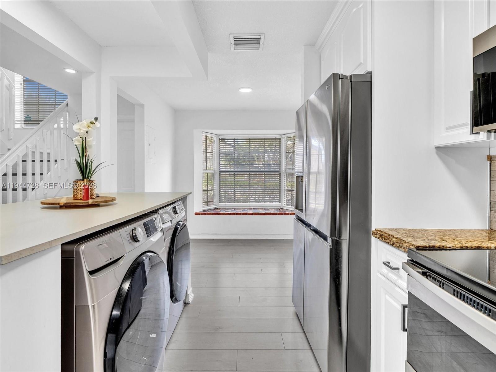Townhome features 3-bedroom, 2.5-bath modern comfort and style. The kitchen boasts white cabinetry, pantry, stainless steel appliances, and a bright breakfast nook with window. Enjoy grey laminate flooring throughout and a stylish grey accent wall in the living area. Stainless steel washer and dryer in the unit for added convenience. Step outside to a private patio with deck flooring and a storage room. All bedrooms are located on the 2nd floor. New roof to be installed.