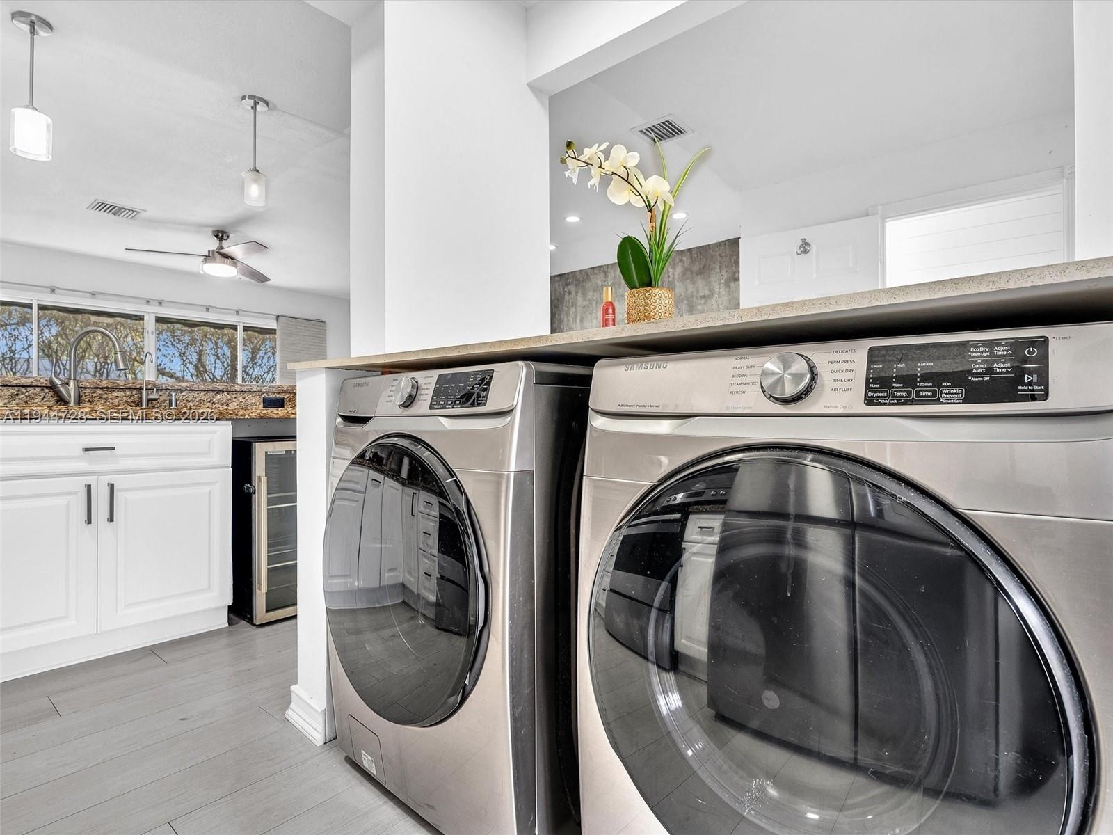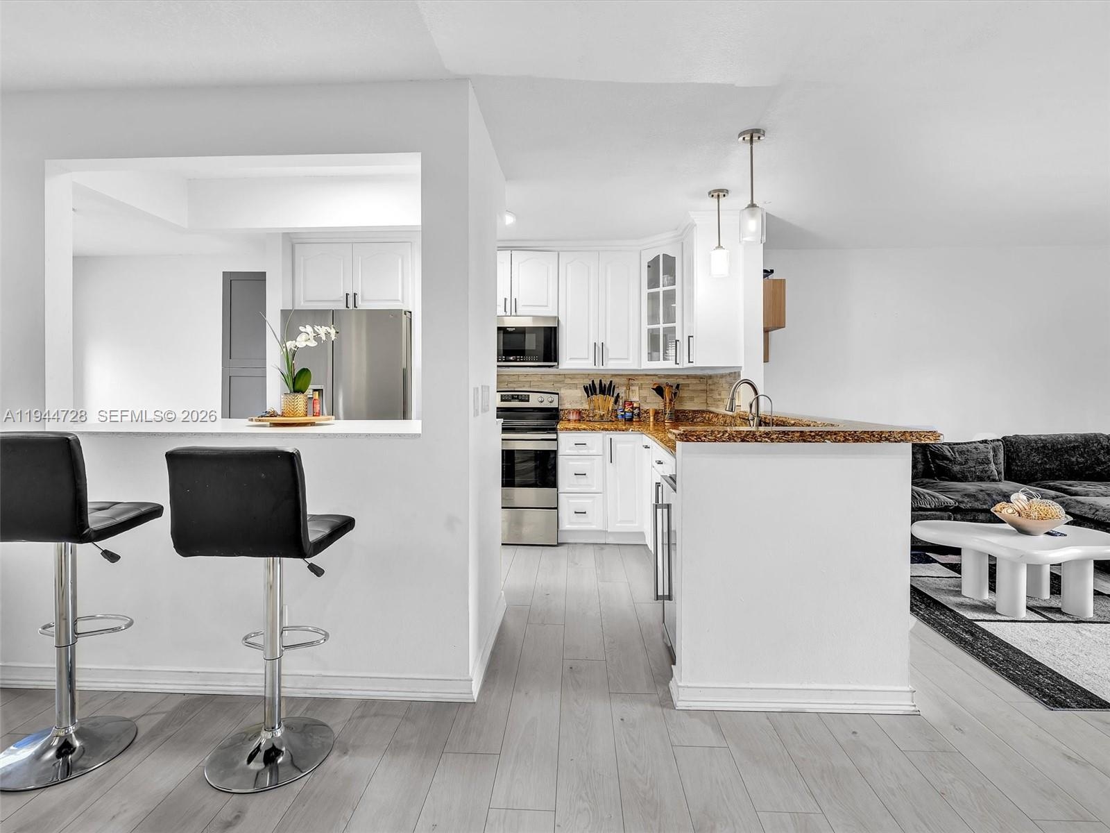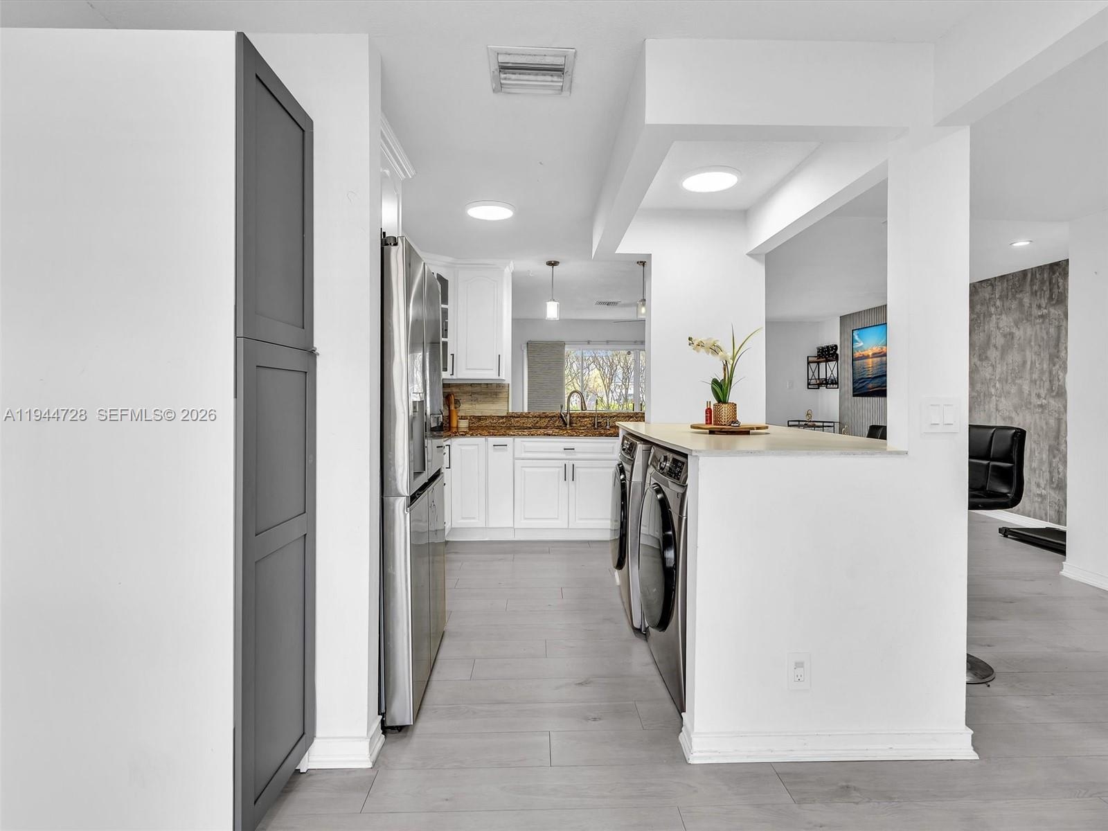 Townhome features 3-bedroom, 2.5-bath modern comfort and style. The kitchen boasts white cabinetry, pantry, stainless steel appliances, and a bright breakfast nook with window. Enjoy grey laminate flooring throughout and a stylish grey accent wall in the living area. Stainless steel washer and dryer in the unit for added convenience. Step outside to a private patio with deck flooring and a storage room. All bedrooms are located on the 2nd floor. New roof to be installed.