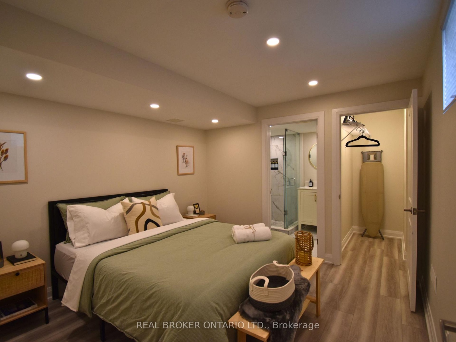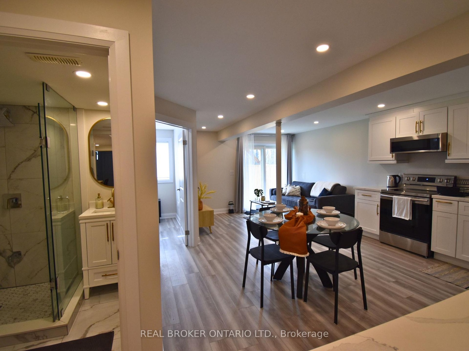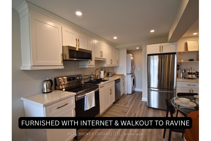 FURNISHED & 1.5GB INTERNET INCLUDED. Bright walkout basement unit with no basement feel, backing onto wooded greenspace with no rear neighbours. This 2-bedroom suite features a spacious primary bedroom with mini walk-in closet and private ensuite, plus a second full bath - both with modern glass-enclosed showers and tasteful finishes. The massive kitchen offers exceptional storage with an extended layout, 30" stainless steel stove, 24" dishwasher, built-in slim-profile microwave, coffee station, and ample counter space for small appliances. Cozy living area with a 50" TV, dedicated dining area, ensuite laundry, pot lights, smooth ceilings, and excellent ceiling height throughout. Separate walkout entrance, stainless steel appliances, and one outdoor parking space included. Located in the desirable Seaton community at Whites & Taunton, just 7 minutes to Amberlea Plaza (Metro, TD Bank, etc.), 10 minutes to Hwy 401, 5 minutes to Hwy 407, and a 10-minute walk to Josiah Henson Public School, with additional schools and amenities coming soon.