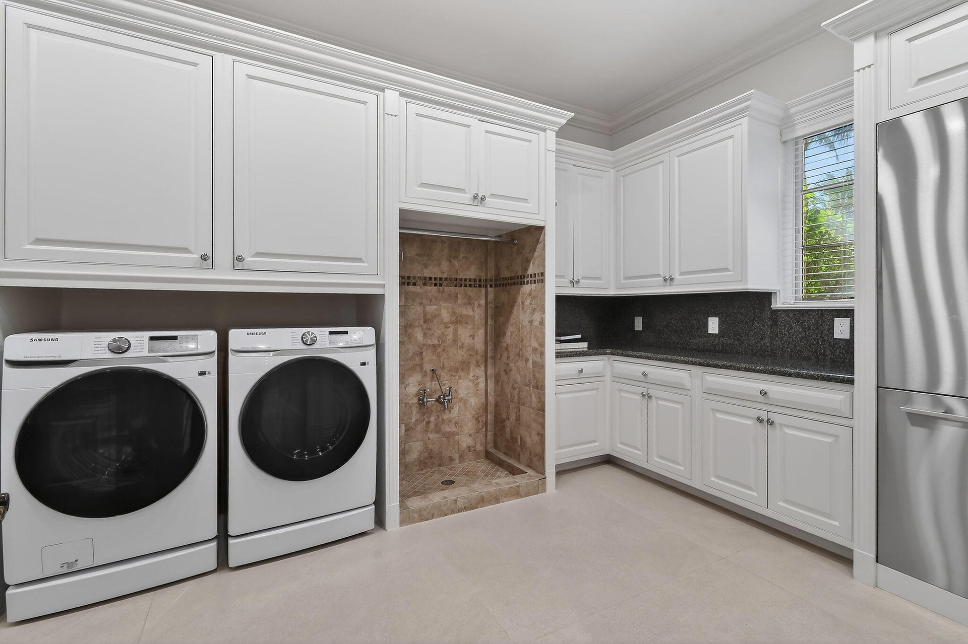 Set on a coveted cul-de-sac in the heart of Admirals Cove, 107 Schooner Lane is a rare waterfront and golf course estate offering extraordinary scale, privacy, and craftsmanship. Built by the renowned Turtle Construction and recently enhanced with major new renovations, this impressive residence encompasses approximately 11,200 square feet under air, on an expansive half-acre homesite. A grand arrival sets the tone, with a stately entrance, full-house generator, and commanding presence. Perfectly positioned, the home enjoys serene water inlet views on one side and sweeping golf course vistas on the other—without sightlines to neighboring homes or garages, creating a sense of complete seclusion. The interiors are both expansive and refined, featuring seven generously sized bedrooms, including two primary suites and a junior suite, complemented by eight full bathrooms, a half bath, and an additional powder room. Two private libraries, dual elevators, including a dedicated elevator serving the primary suite, and multiple gathering spaces enhance both comfort and functionality. Designed for elevated living and entertaining, the home offers two oversized family rooms, upstairs and down, two full bars for indoor and outdoor enjoyment, and a stunning wine room. Dual chef's kitchens anchor the home, each featuring 10-foot islands and a total of four refrigerators, ideal for hosting on any scale. A whole-house water purification system ensures uncompromising quality throughout. The estate is offered fully furnished with all-new, modern contemporary furnishings curated by a top decorator and sourced from a premier furniture house. Additional highlights include a state-of-the-art gym and media room, a completely renovated garage with custom his-and-her cabinetry, and seamless indoor-outdoor living. Outdoors, a private dock with two slips provides direct water access, while the home's superior location places the Admirals Cove clubhouse just a short walk away and A1A only minutes by car. The property includes a full golf membership, completing a truly turnkey offering in one of Jupiter's most prestigious communities. This is luxury living at its finest, where scale, quality, and location converge.