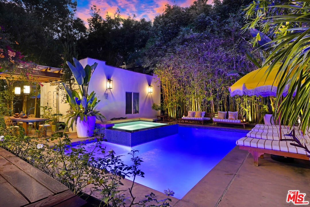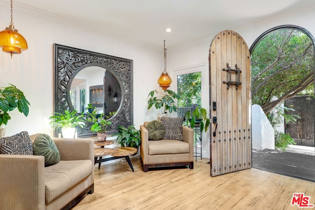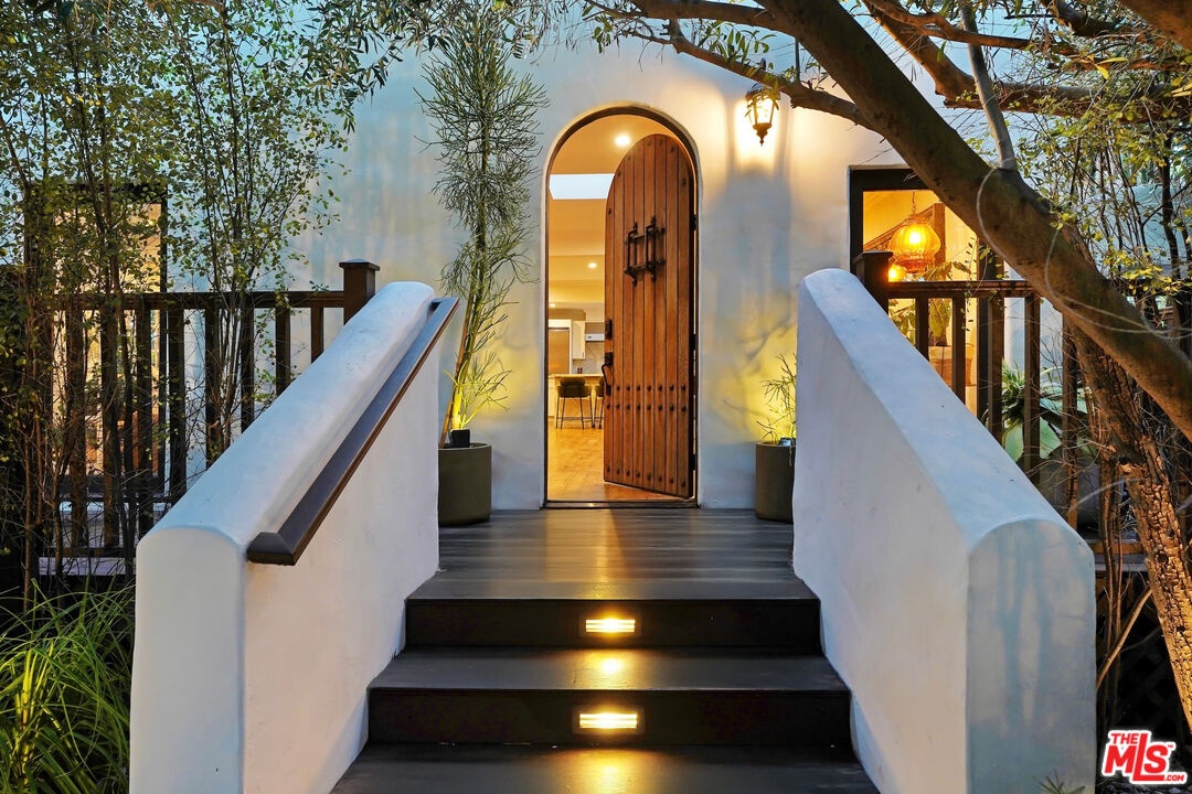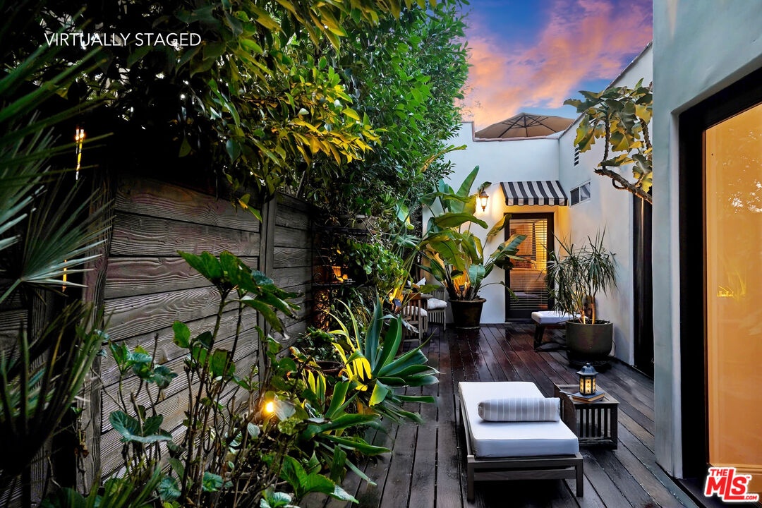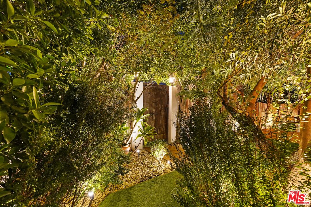 Welcome to Secret Garden WeHo, one of the largest one-story residences in the area, rebuilt and expanded in the last decade to offer a rare four-bedroom single-level floorplan ideal for effortless living and today's modern, multigenerational household. Magically landscaped and ideally located in a walker's paradise just minutes from six Michelin-starred restaurants, neighborhood parks, recreation centers, and local markets yet feeling a world apart. Here, every space blurs the line between home and haven.. Discover spectacular indoor and outdoor living, including a panoramic rooftop deck, in a bright, canopied, Moorish-inspired sanctuary where architecture and nature dissolve into a Zen California dream. Your journey begins the moment you step through a massive driftwood door into a lush courtyard of beautiful tiled floors and inviting seating areas - a serene prelude to what lies within. This isn't just a home; it's your own Secret Garden, enveloped by olive trees, silver sheens, fern trees, and exotic flora. Positioned on a privileged corner lot, this fully gated and hedged property offers rare privacy/security and effortless freedom to entertain amid the city's vibrant pulse. Spanning over 3,000 square feet of total indoor-outdoor living space (~2,450 sqft indoor), the residence unfolds on a single level, perfectly balancing openness and intimacy. Expansive terraces and wraparound decks flow almost entirely around the home, drawing the vibrant greenery inside and creating a dreamy, seamless indoor-outdoor lifestyle. At its heart lies a grand, open-concept living area designed for both lively gatherings and quiet reflection, centered around a chef's kitchen with a generous island, peninsula bar, and a stunning skylight that floods the space with natural light. Two primary suites, two guest bedrooms, and a versatile room with dual-access bath and outdoor deck (currently serving as an executive office with water views and an adorable nursery) offer calming vistas of gardens and greenery from every corner. Step beyond, and the magic deepens. The backyard reveals a private, sparkling pool and spa nestled among groves of bamboo -- your very own resort retreat. You'll feel transported thousands of miles away to your own slice of paradise, where time slows and the air feels lighter. Adjacent, a spacious entertaining area awaits, perfect for unforgettable al-fresco dinners. For added comfort, a detached pool house includes a full bath for guests and an infrared sauna to unwind after the day's adventures. Finally, ascend a spiral staircase through the canopy to discover the crown jewel -- a private rooftop deck that seems to lift this Secret Garden into the sky. Shielded by lush landscaping, it offers complete privacy and panoramic views of the Hollywood skyline, the Hollywood Sign, and the surrounding hills. Whether you're soaking up the California sun or stepping away from the home office for a midday burst of inspiration, this rooftop haven is your personal sanctuary above the city. An incredibly rare offering just moments from the heart of West Hollywood, Secret Garden Weho is more than a home - it's a feeling. Are you ready to escape to your Secret Garden?