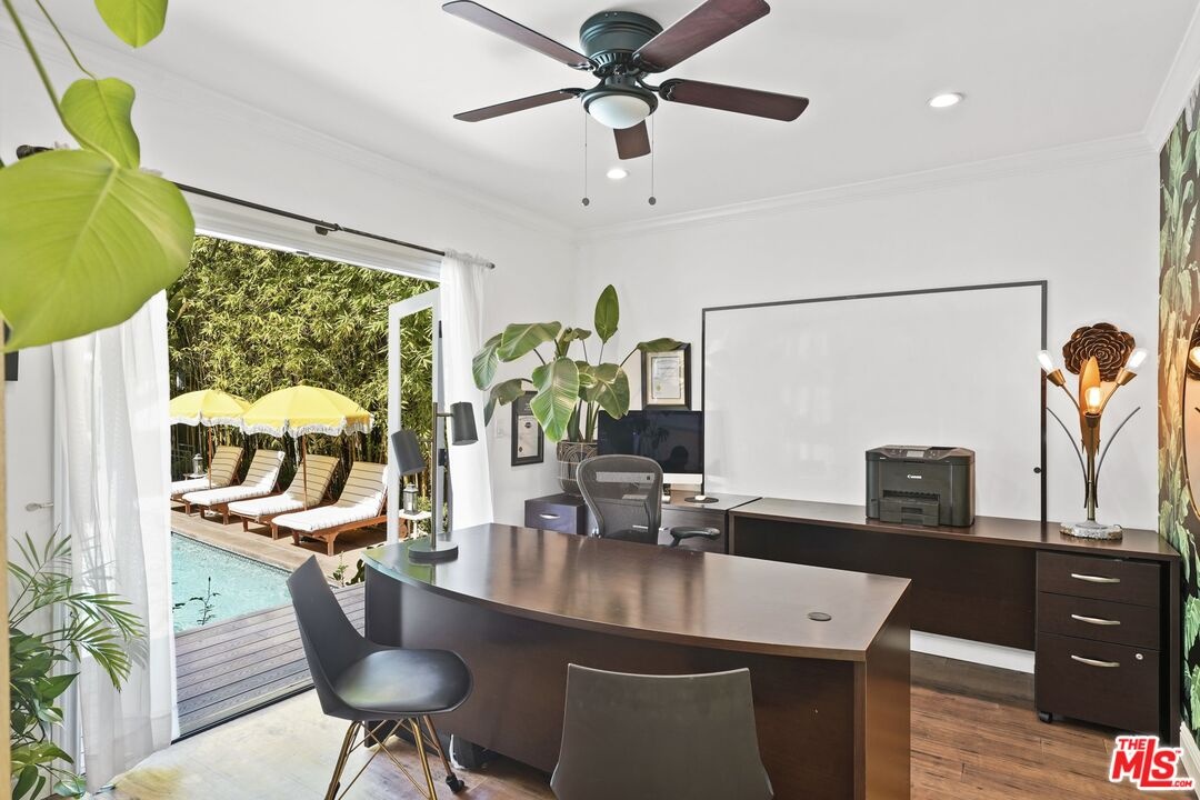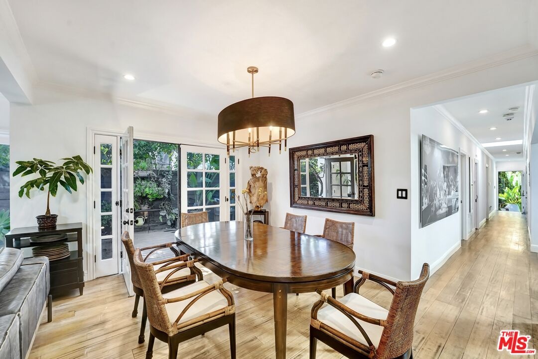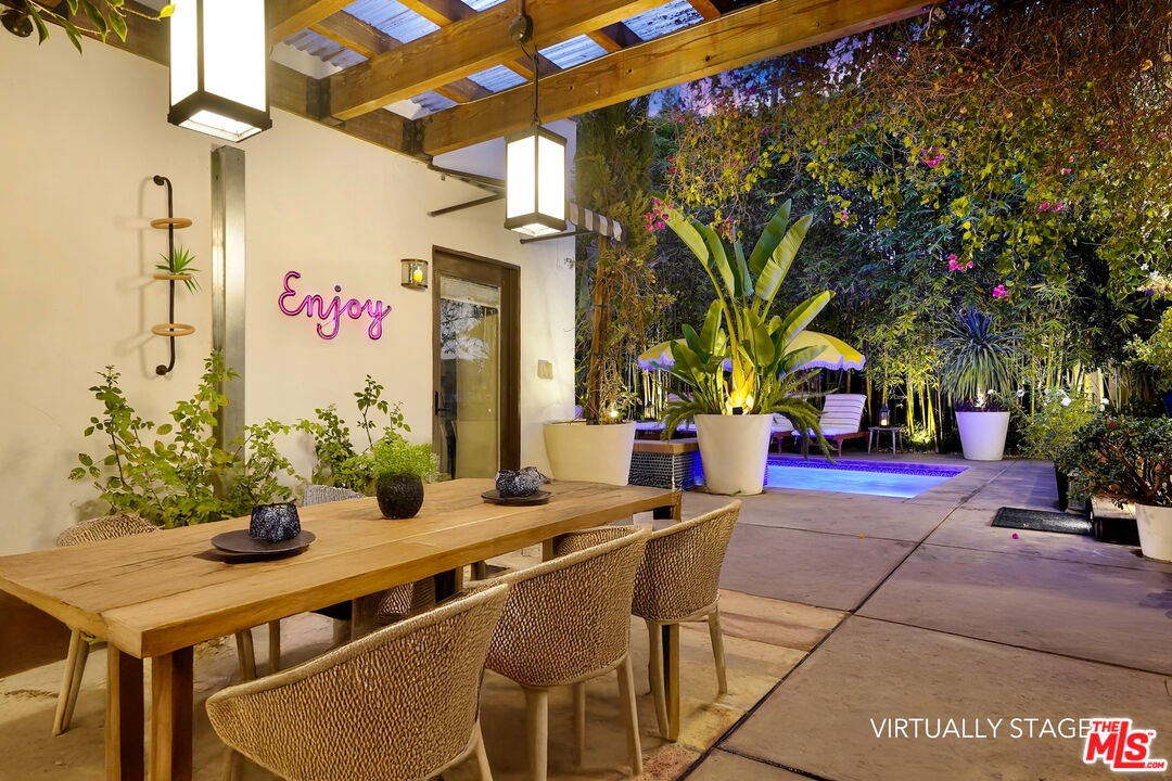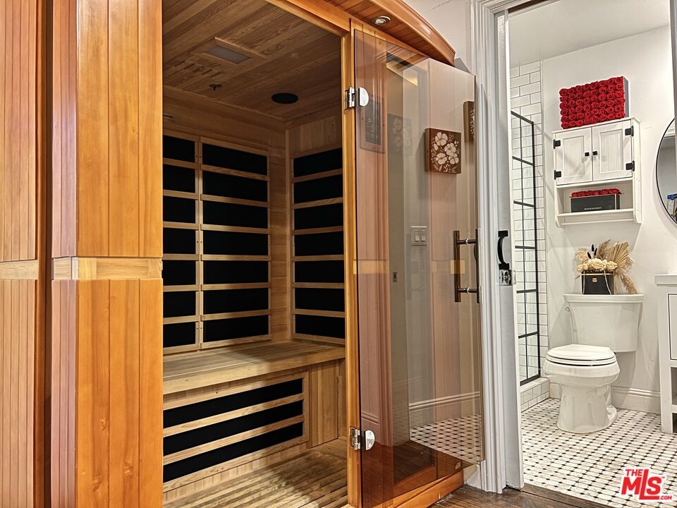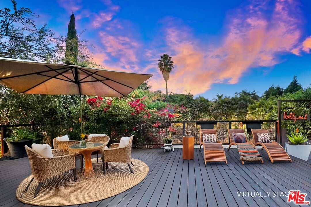 Welcome to Secret Garden WeHo, one of the largest one-story residences in the area, rebuilt and expanded in the last decade to offer a rare four-bedroom single-level floorplan ideal for effortless living and today's modern, multigenerational household. Magically landscaped and ideally located in a walker's paradise just minutes from six Michelin-starred restaurants, neighborhood parks, recreation centers, and local markets yet feeling a world apart. Here, every space blurs the line between home and haven.. Discover spectacular indoor and outdoor living, including a panoramic rooftop deck, in a bright, canopied, Moorish-inspired sanctuary where architecture and nature dissolve into a Zen California dream. Your journey begins the moment you step through a massive driftwood door into a lush courtyard of beautiful tiled floors and inviting seating areas - a serene prelude to what lies within. This isn't just a home; it's your own Secret Garden, enveloped by olive trees, silver sheens, fern trees, and exotic flora. Positioned on a privileged corner lot, this fully gated and hedged property offers rare privacy/security and effortless freedom to entertain amid the city's vibrant pulse. Spanning over 3,000 square feet of total indoor-outdoor living space (~2,450 sqft indoor), the residence unfolds on a single level, perfectly balancing openness and intimacy. Expansive terraces and wraparound decks flow almost entirely around the home, drawing the vibrant greenery inside and creating a dreamy, seamless indoor-outdoor lifestyle. At its heart lies a grand, open-concept living area designed for both lively gatherings and quiet reflection, centered around a chef's kitchen with a generous island, peninsula bar, and a stunning skylight that floods the space with natural light. Two primary suites, two guest bedrooms, and a versatile room with dual-access bath and outdoor deck (currently serving as an executive office with water views and an adorable nursery) offer calming vistas of gardens and greenery from every corner. Step beyond, and the magic deepens. The backyard reveals a private, sparkling pool and spa nestled among groves of bamboo -- your very own resort retreat. You'll feel transported thousands of miles away to your own slice of paradise, where time slows and the air feels lighter. Adjacent, a spacious entertaining area awaits, perfect for unforgettable al-fresco dinners. For added comfort, a detached pool house includes a full bath for guests and an infrared sauna to unwind after the day's adventures. Finally, ascend a spiral staircase through the canopy to discover the crown jewel -- a private rooftop deck that seems to lift this Secret Garden into the sky. Shielded by lush landscaping, it offers complete privacy and panoramic views of the Hollywood skyline, the Hollywood Sign, and the surrounding hills. Whether you're soaking up the California sun or stepping away from the home office for a midday burst of inspiration, this rooftop haven is your personal sanctuary above the city. An incredibly rare offering just moments from the heart of West Hollywood, Secret Garden Weho is more than a home - it's a feeling. Are you ready to escape to your Secret Garden?