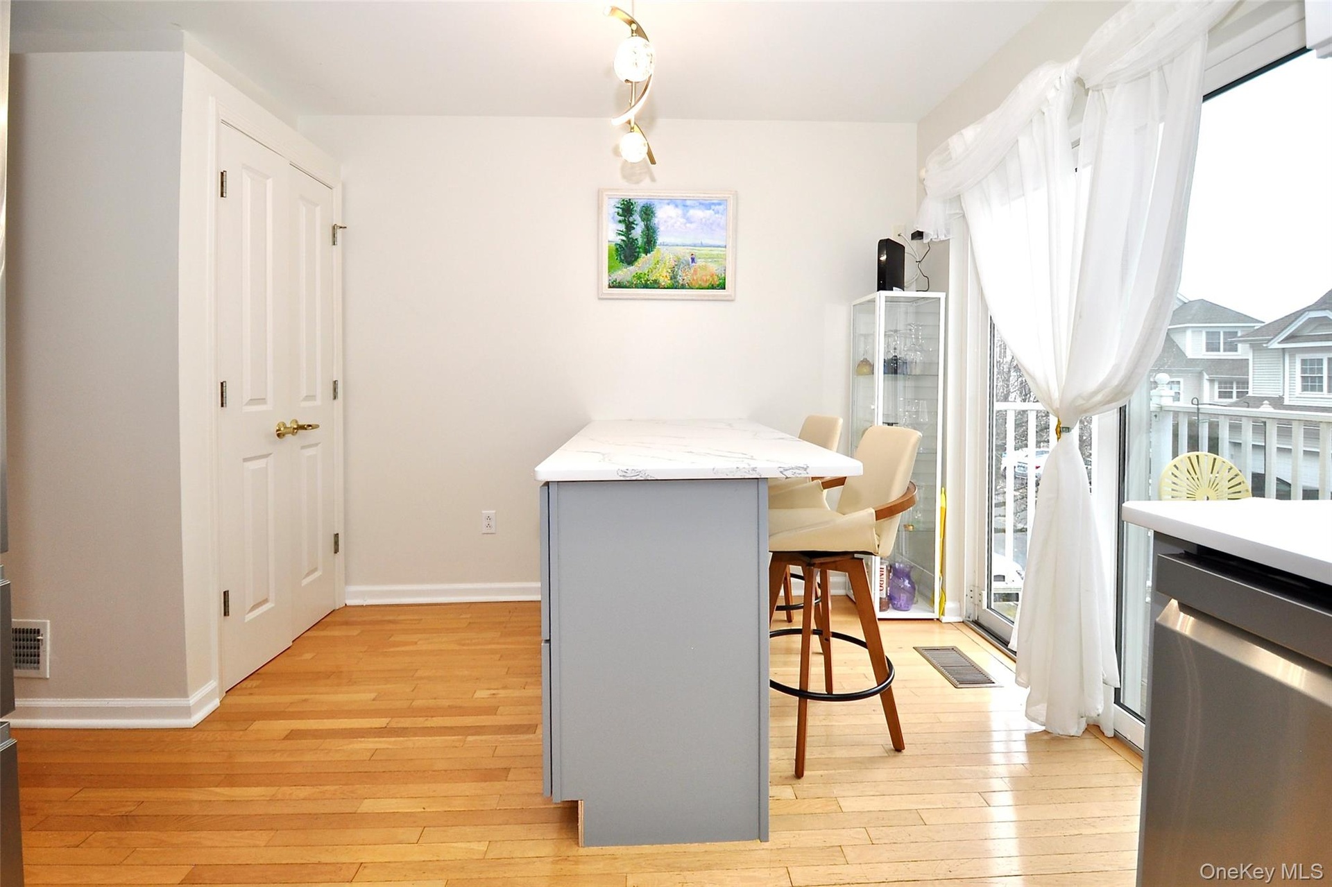 The main level greets you with a spacious living room and dining room combination, highlighted by a cozy gas fireplace. Sliding doors from this area lead to the rear patio and yard, seamlessly blending indoor and outdoor living. Adjacent to this space, a large eat-in kitchen features a dedicated dining area and additional sliding doors that open to a private balcony—perfect for enjoying a tranquil morning coffee or unwinding in the evening. A convenient powder room is also located on this floor.