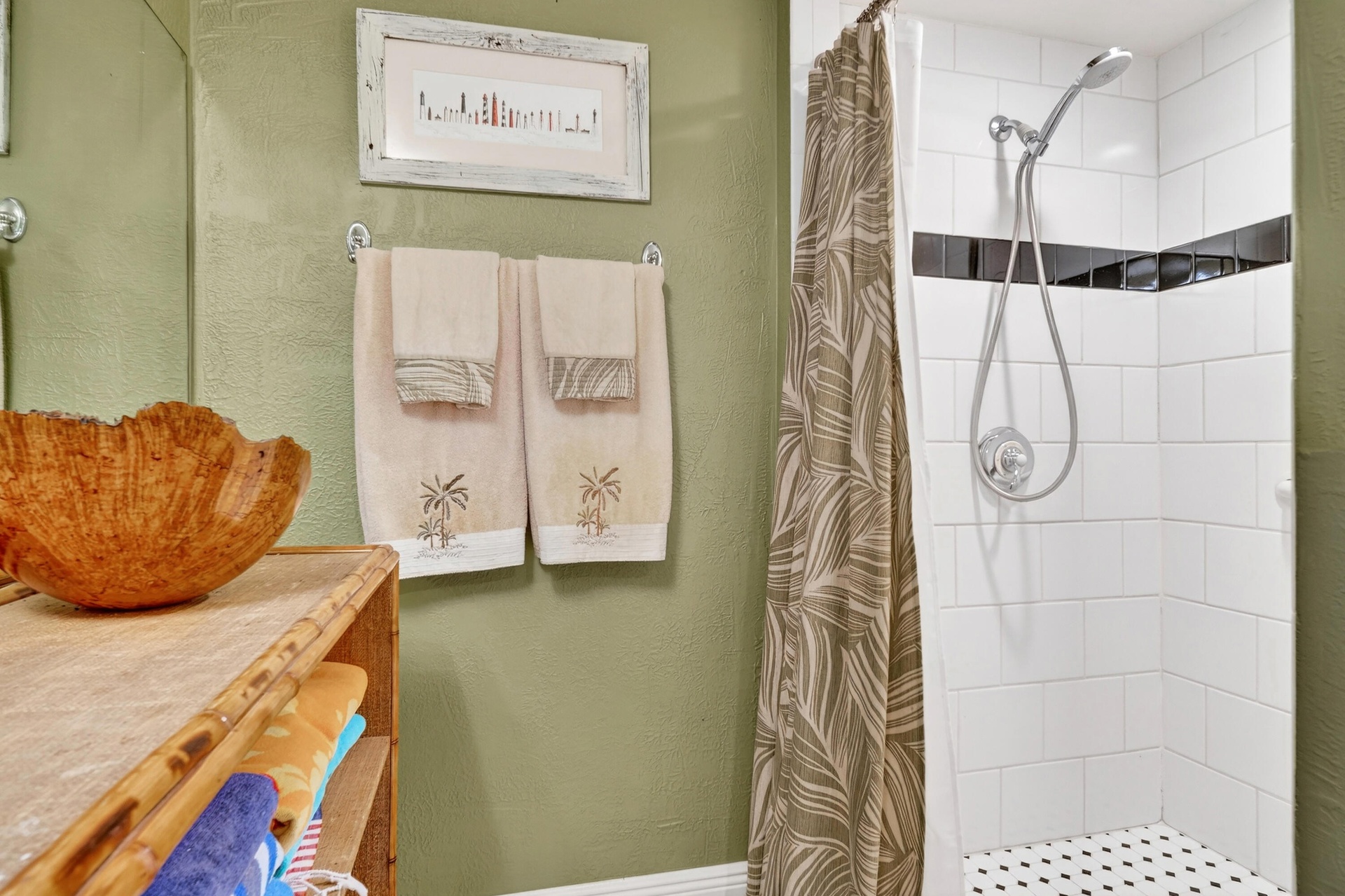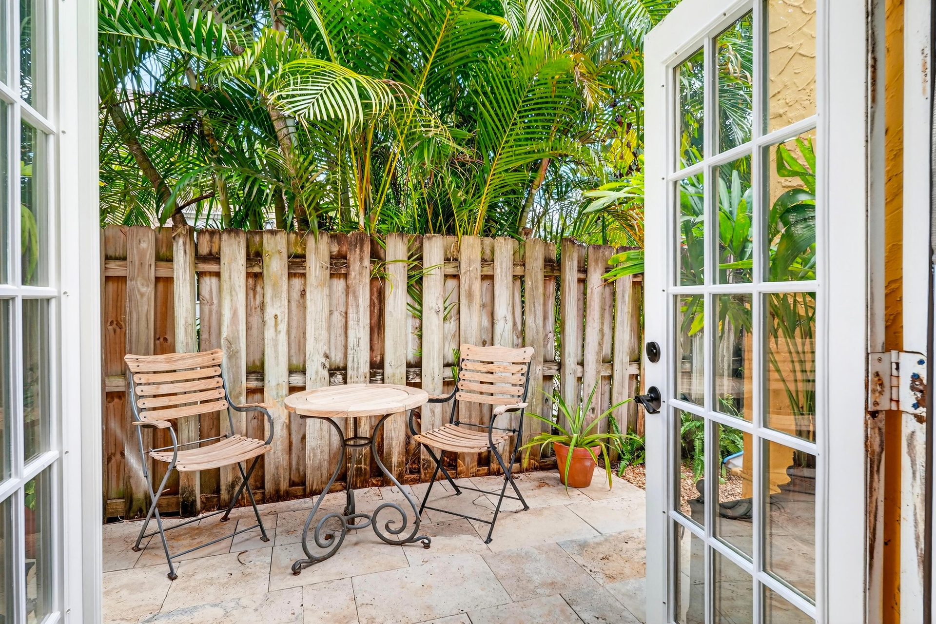 The main house offers three bedrooms and two full bathrooms, with a private primary retreat that is separated from the main living area, allowing exceptional privacy and space. The primary retreat features a dressing room and its own outdoor patio that is perfect for quiet mornings or relaxed evenings. The ensuite bathroom has a view to the tropical gardens surrounding the pool.