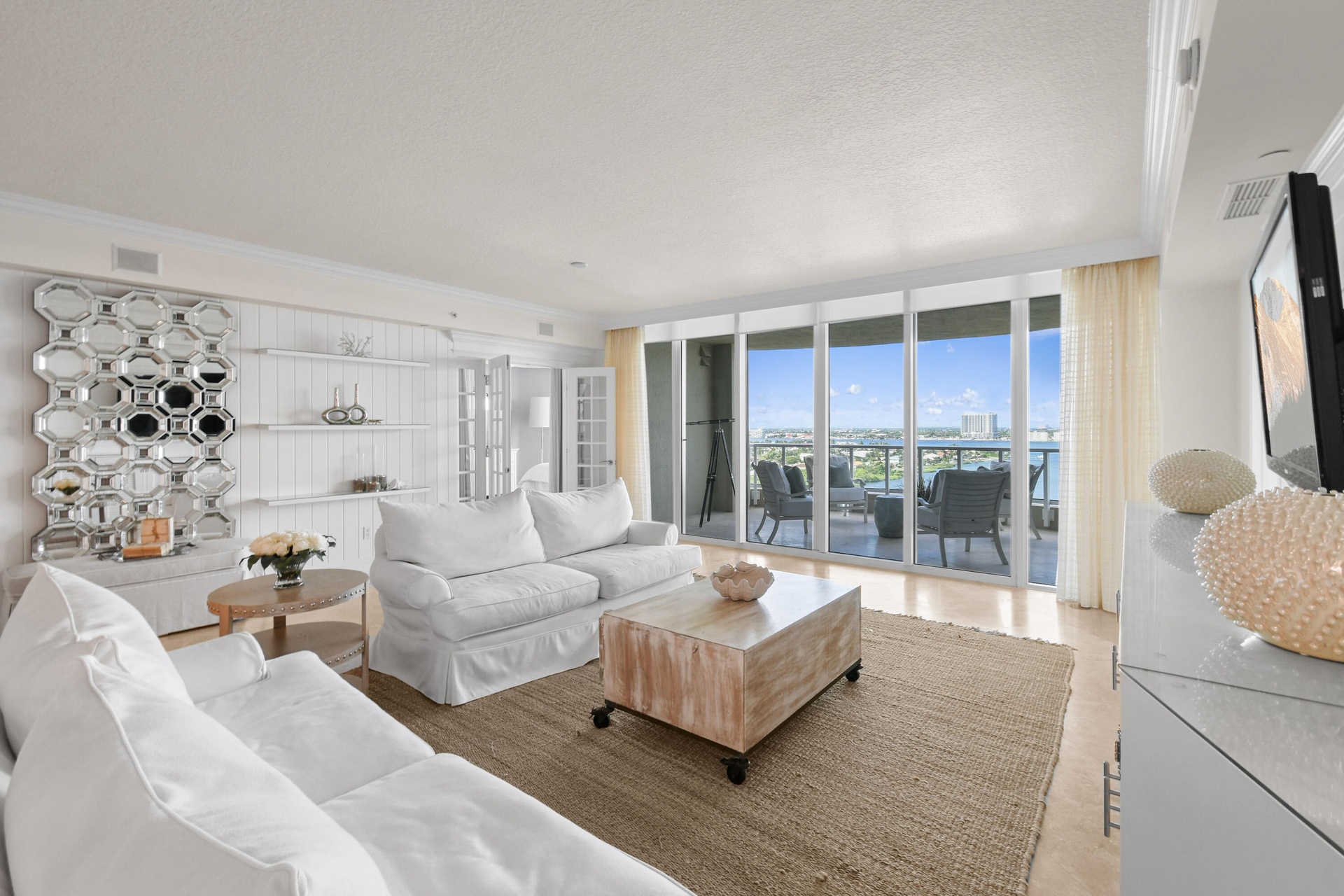 The primary suite is a true sanctuary, featuring two oversized walk-in closets with custom built-ins and a spa-inspired en-suite bath complete with a Jacuzzi soaking tub and a spacious walk-in shower. Step onto your wraparound balcony to take in panoramic views from sunrise over the Atlantic to sunset across the Intracoastal and enjoy the sparkling West Palm Beach skyline as evening falls.