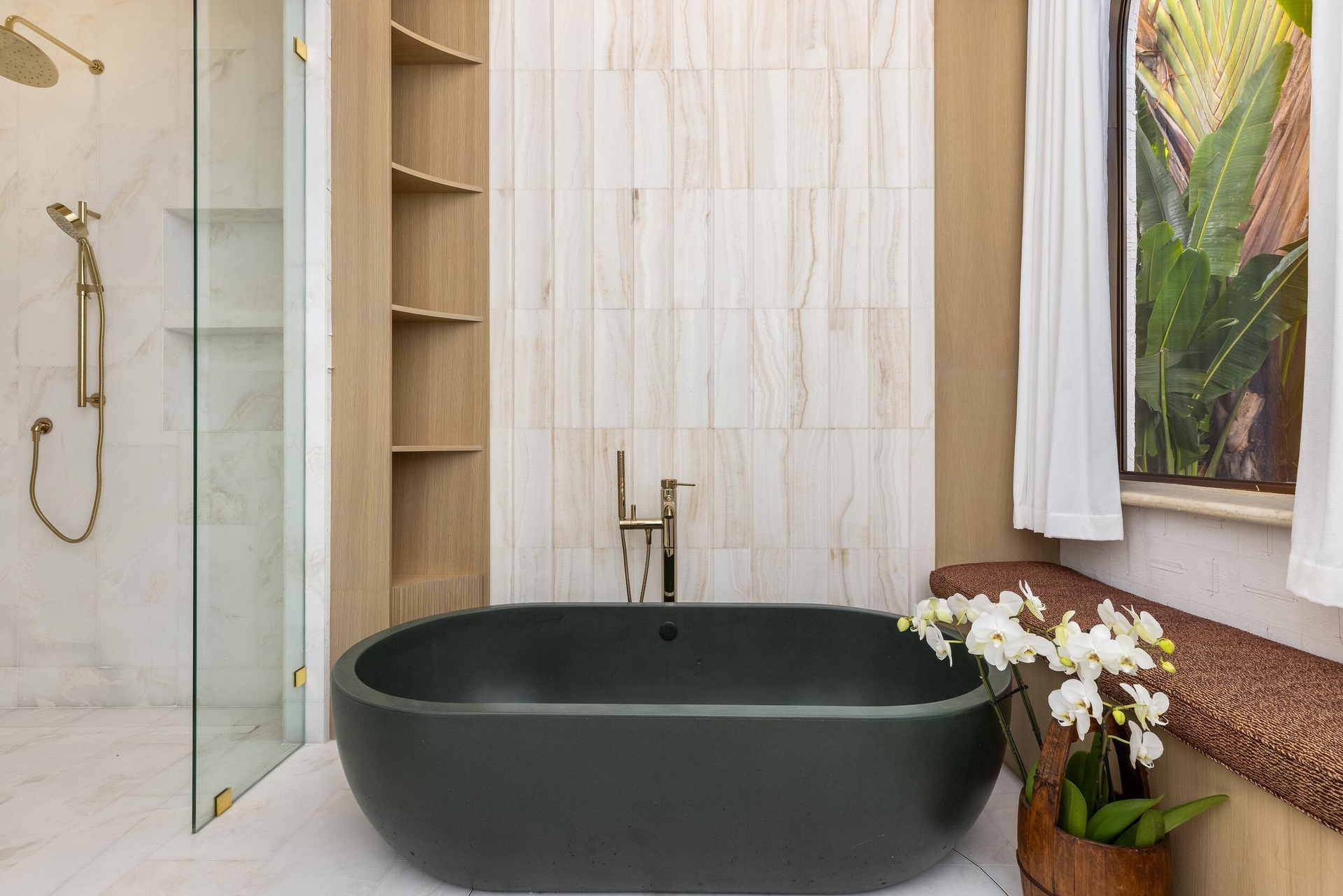 Throughout the home, refined flooring selections create a layered visual narrative, including travertine on the main level, Casa Venetia European oak on both floors, elegant parquet detailing, and a dramatic herringbone pattern in the primary suite. The primary bath rivals a luxury spa, showcasing luminous onyx behind the soaking tub and Bianco Montcarte marble throughout the floors and shower walls.