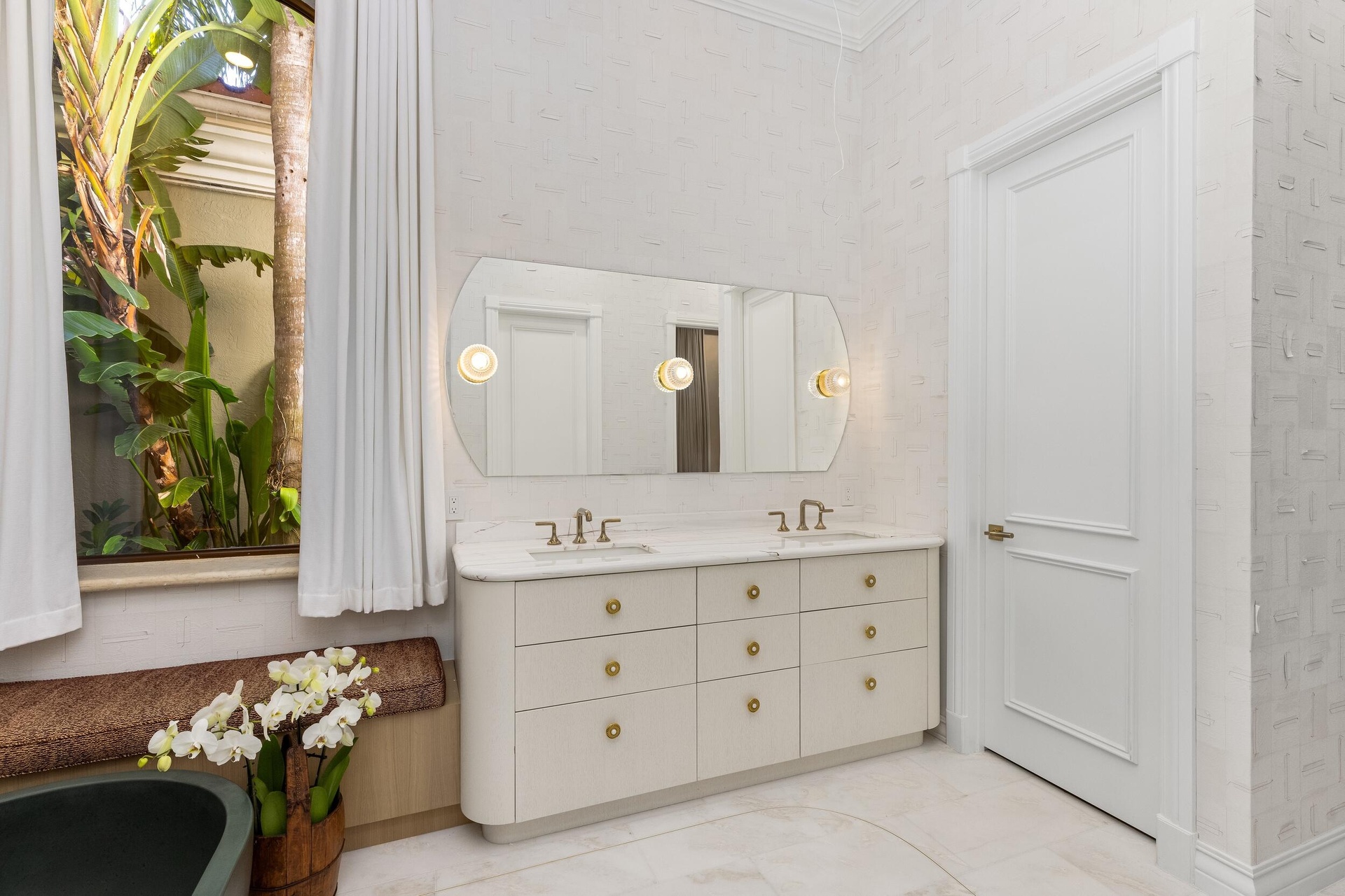 The dining room reveals a true artistic centerpiece, a bespoke hand painted gold leaf mirror mural by renowned English muralist Grahame Ménage. First unveiled at a Palm Beach show, this Asian inspired installation transforms the room into a museum quality experience where fine art and architecture converge.
