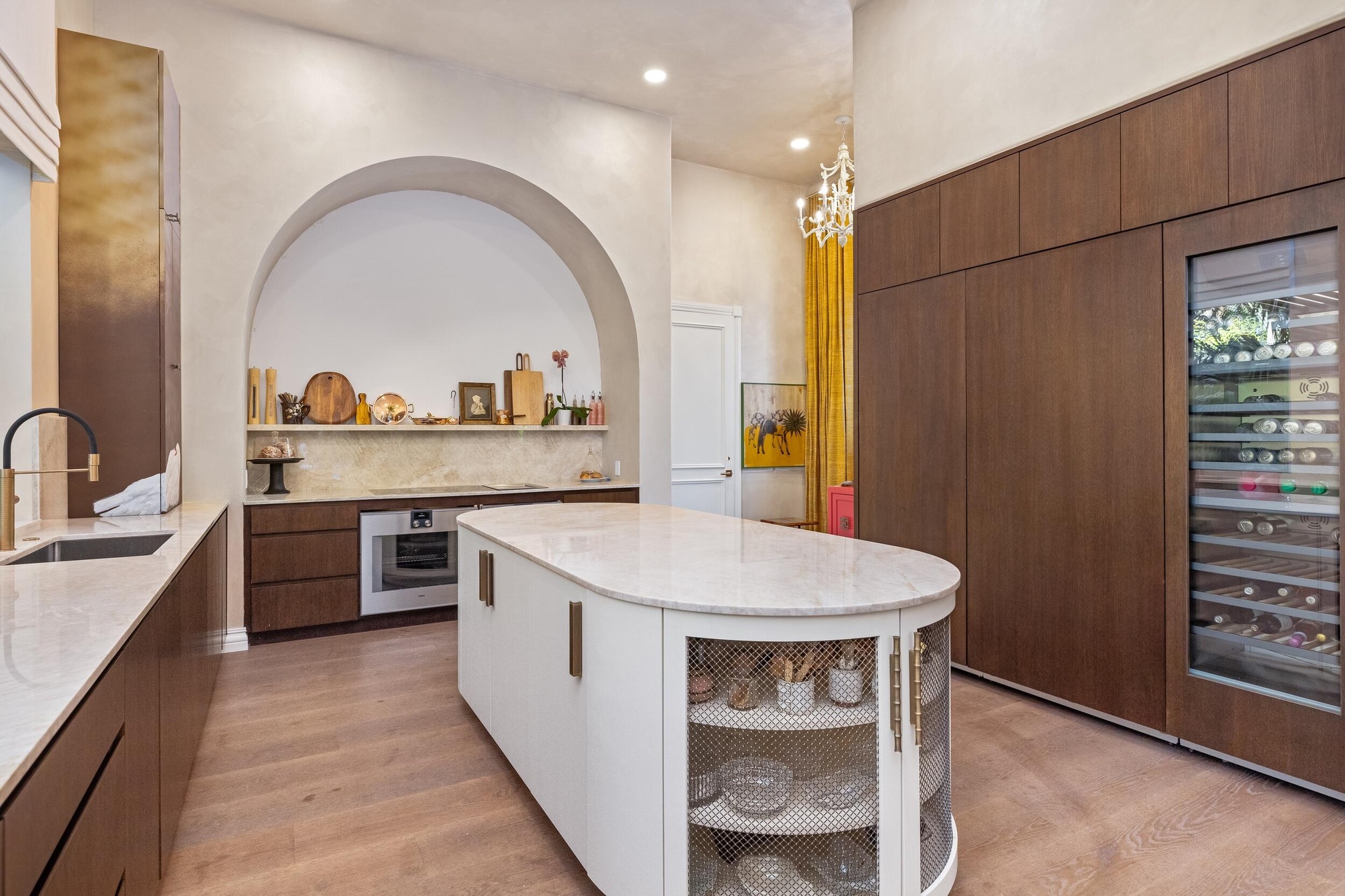At the heart of the home, the reimagined kitchen and lounge function as an elegant living environment rather than a traditional culinary space. Modern cabinetry, an antique mirror backsplash above the range, a concealed pantry, and a custom bar integrated into the dining area allow for seamless entertaining while maintaining visual serenity. The space flows effortlessly into a connected den, ideal for intimate gatherings or refined hosting.