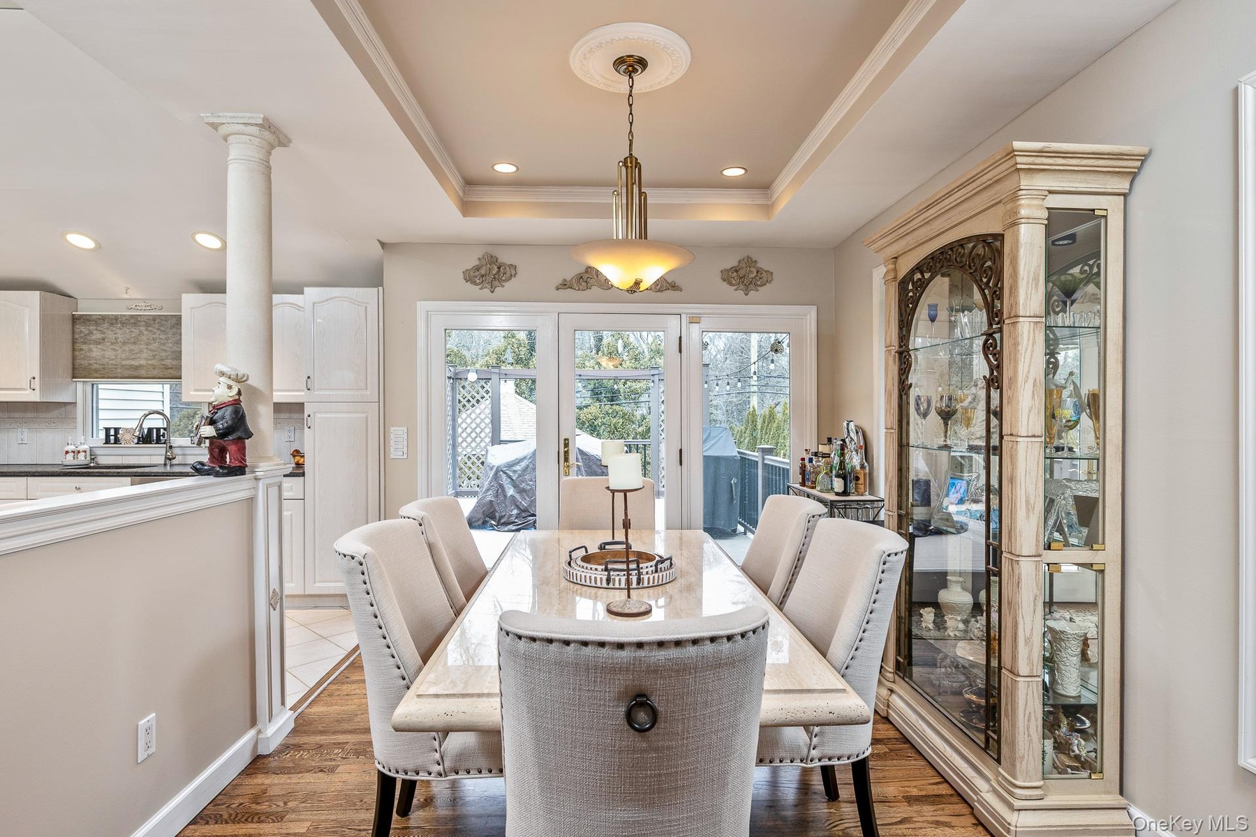 French doors lead directly out to a lovely deck, extending your entertaining space outdoors—ideal for alfresco dining, summer barbecues, or simply relaxing while enjoying the serene surroundings.