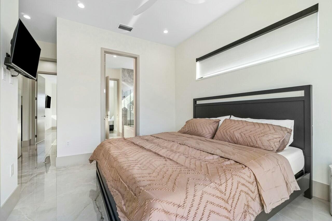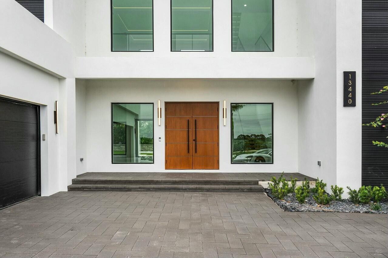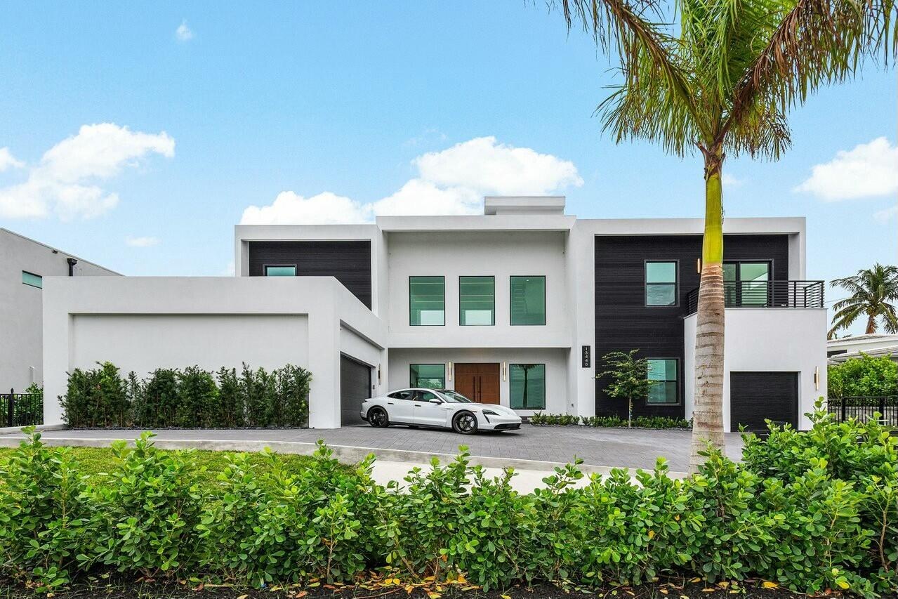 This stunning contemporary beach estate offers an impressive gated entry, ample guest parking, and a 3-car garage with high ceilings ideal for car lifts. Step through oversized double doors into soaring 25-foot ceilings filled with natural light, highlighted by a custom floating staircase and modern, elegant fixtures.