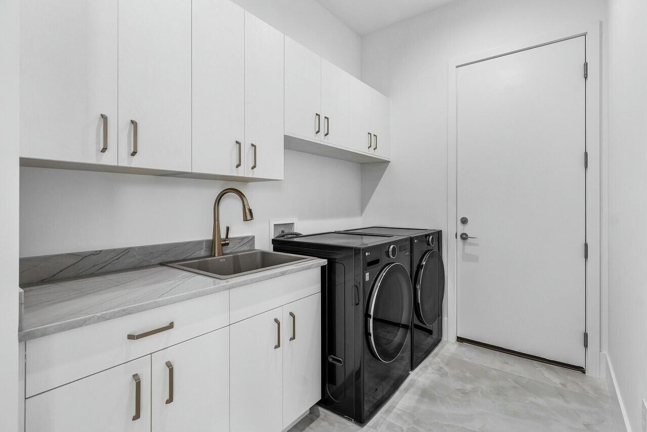 The north side features a custom kitchen with 12-foot ceilings, premium appliances, and a design that perfectly blends indoor-outdoor Florida living for effortless entertaini The first-floor laundry is conveniently located near the air-conditioned single-car garage.