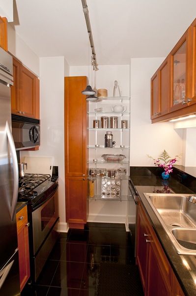 Whip up a quick meal in the Chef's kitchen, that has been improved with glass shelving, track lighting and pantry. Sit down to an intimate gathering for six at your custom dinner table which literally unfolds before you! Magnificent woodwork includes a glass bar, entertainment center and storage. The sparkling cherry wood floors in herringbone pattern compliment the beautiful woodwork throughout the apartment. Relax after dinner on the couch and stare at the star filled sky, with a night cap from your custom bar, or retire to the serene bedroom to relax or even continue work in a quiet space -- for the night owl, there is a custom crafted desk. High ceilings, marble bath, washer/dryer, ample storage throughout, and generous closet space, including walk-in, make this a terrific space!