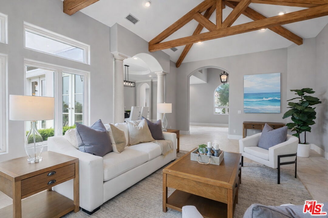 Reimagined and reintroduced, this gated CaliforniaTuscan estate offers a compelling opportunity to own a fully realized Malibu retreat with ocean and mountain views, resort-style amenities, and exceptional privacyset at an extraordinary value.Situated on a quiet cul-de-sac behind private gates, the residence unfolds with soaring ceilings, limestone floors, and an abundance of natural light that elevates the home's open, elegant layout. Formal living and dining rooms, along with a richly appointed library, showcase refined craftsmanship, while wide-plank oak flooring anchors the warm, inviting family room and chef's kitchenperfectly positioned to capture garden and ocean views through French doors.Indoor-outdoor living is seamless. Multiple entertaining terraces, a recently refreshed pool and spa, and lush, manicured grounds create a true resort experience. A serene side yard provides additional space for relaxation, play, or quiet reflection.The thoughtfully designed floor plan includes two ensuite bedrooms on the main level, along with a laundry room and powder bath. A dramatic custom wrought-iron staircase in the rotunda leads to the upper level, where the primary suite enjoys sweeping ocean views, a private balcony, spa-style bath with soaking tub and oversized shower, and dual walk-in closets. Two additional ensuite bedrooms upstairs offer peaceful mountain vistas and ample space.Just minutes from Malibu's renowned beaches, dining, and hiking trails, this estate delivers the ideal balance of luxury, privacy, and lifestyle now offered at an exceptional value for a property of this caliber.