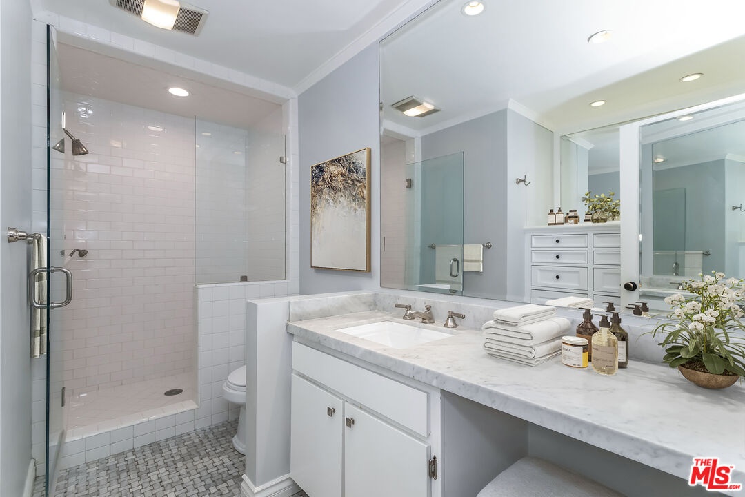 Located in the highly sought-after Doheny Terrace at the crossroads of West Hollywood and Beverly Hills, this upgraded condominium is one of the most desirable in the building. Quiet, private, and extensively improved, it sits well above street level with southern exposure. Unit #311 features rich hardwood flooring throughout, fireplace, a reimagined kitchen with high-end appliances and streamlined cabinetry, and thoughtfully renovated bathrooms with quality fixtures and finishes. Oversized windows bring in abundant natural light, and the floor plan offers a balance of separation and flow, making it ideal for both entertaining and working from home. Both bedrooms are generously sized with ample closet space, and the primary suite includes an en-suite bath and ample closet space. Additional features include IN-UNIT LAUNDRY (stacked machines), dedicated 220v electric car charger, central HVAC, and a quiet balcony facing Cynthia Street. The building, located in the highly desirable Norma Triangle, offers amenities such as a sparkling pool, sauna, gym, and a shared laundry facility (as mentioned, this unit has its own in-unit laundry). The best of Los Angeles' dining, shopping, and nightlife is just outside your door. Two gated tandem parking spaces near the elevator and low HOA dues of $682.40/mo., which includes earthquake insurance for the building. Photos are virtually staged.