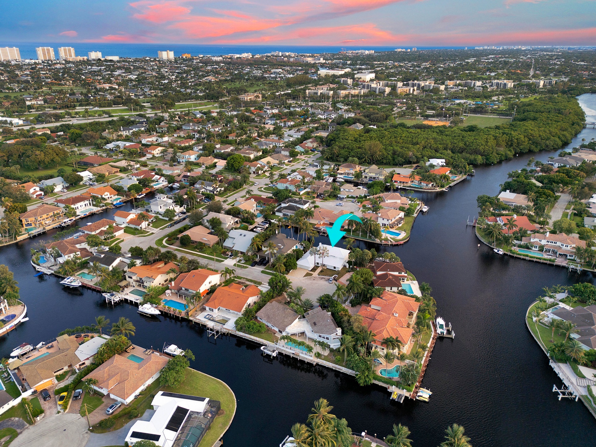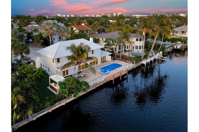 Be the first to live in this newly and fully reimagined modern contemporary estate, nearly 4,000 Sq Ft luxury retreat on a private, .23-acre cul-de-sac lot showcasing 108 feet of waterfront living and private dock. With its bright southern exposure and breathtaking views of the Intracoastal waterway, this home does not disappoint. From the moment you step inside, you'll be captivated by the open living room, overlooking the pool and waterfront patio. The grand entrance showcases a stunning glass-enclosed wine cellar. The chef's kitchen is outfitted with Thermador appliances, quartz countertops, and custom maple shaker cabinetry, setting the stage for elegant entertaining. Four lavishly appointed ensuite bedrooms offer privacy and comfort, including a main-floor guest wing and an expansive upstairs primary suite with dual vanities, his-and-hers closets, a sitting area, and a private balcony overlooking the water. Seamlessly blending indoor and outdoor living, the backyard oasis features a resort-style pool with integrated jacuzzi, a BBQ area, and large open spaces for entertaining. Completely reimagined and rebuilt in 2025, this home features all-new interiors and systems, including Metal roof, impact-rated windows and doors, updated plumbing and electrical, 3-zone A/C, a climate-controlled garage, electric-car charger, new irrigation system, lush landscaping, and countless additional upgrades throughout. Every detail of this residence has been thoughtfully designed, offering an exceptional combination of sophistication, comfort, and coastal serenity. Perfectly situated just 5 minutes from Downtown Boca Raton, this estate offers an exceptional lifestyle close to Mizner Park, Royal Palm Place, The Boca Raton Club & Resort, fine dining, and pristine beaches.