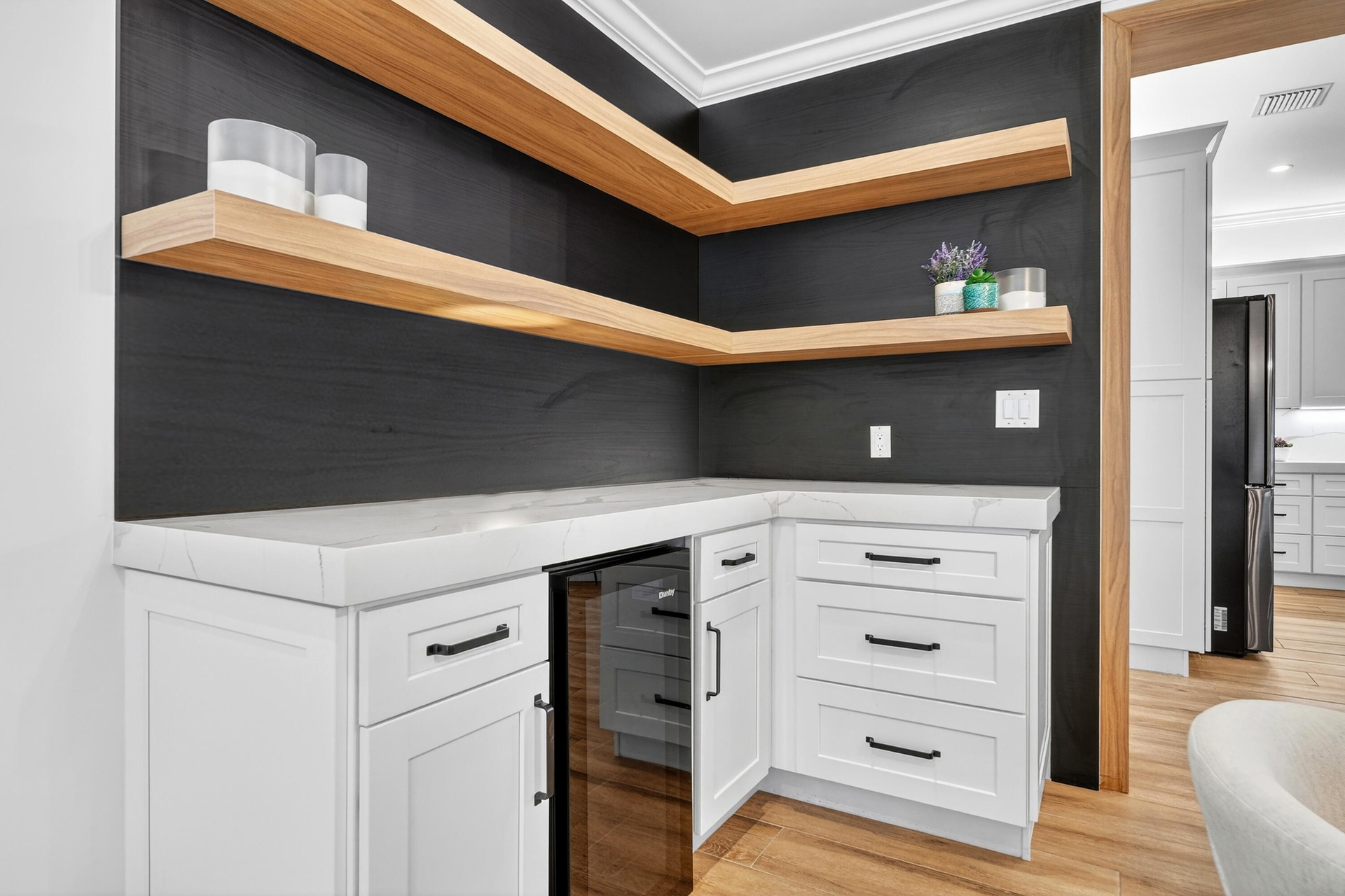 The gorgeous primary suite overlooks the pool and offers a custom walk-in dressing closet and a spa-inspired bathroom with dual sinks, a beauty bar, and an oversized shower-tub wet room. A dedicated laundry room adds everyday convenience, while three additional bedrooms and two beautifully finished full bathrooms provide flexibility for guests, family, or office needs.