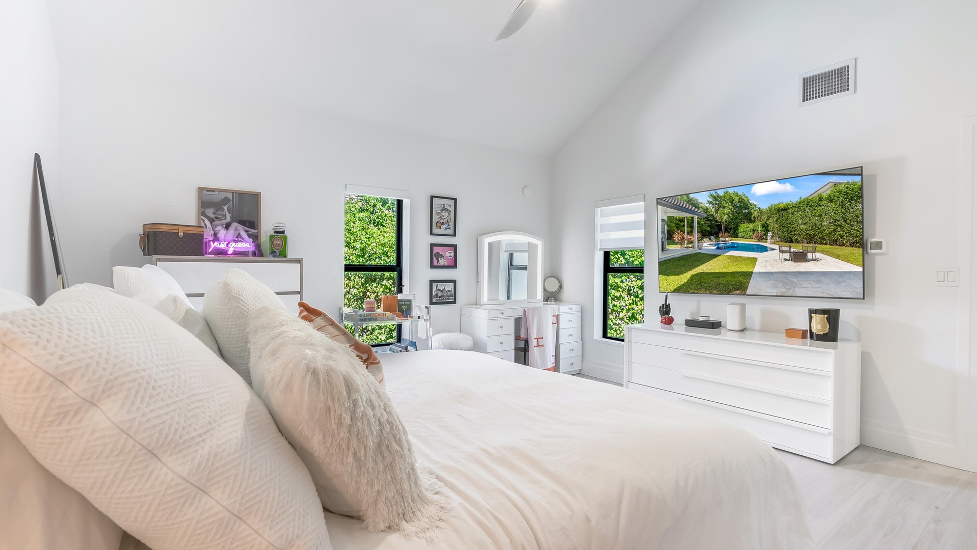 All new 2024 decorator designed work of art! This oversized-lot estate in Boca Raton's exclusive Sanctuary offers split bedroom plan, 4 bedrooms (2 first floor bedrooms), 5 full baths, & 2 half baths. Features include soaring ceilings, quartz countertops, custom cabinetry kitchen, high-end appliances, 2 master baths, bespoke fireplace, abundant storage. Updates include a new roof + Impact glass, new flooring, new en suite bathrooms in all rooms, 3 new AC units, & 2 water heaters. Enjoy a resort-style pool, covered loggia, pool bath, & outdoor shower, perfect for entertaining. The Sanctuary provides 24/7 armed security with land & water patrols, a private marina, pickle, b-ball, tennis courts, and a prime East location walk to beach, The Boca Raton Club, shopping, dining,& private airport!