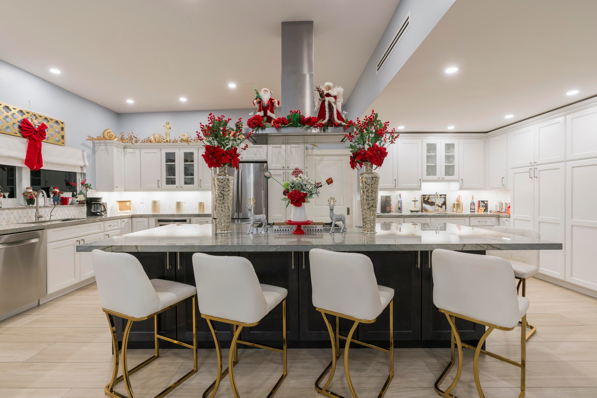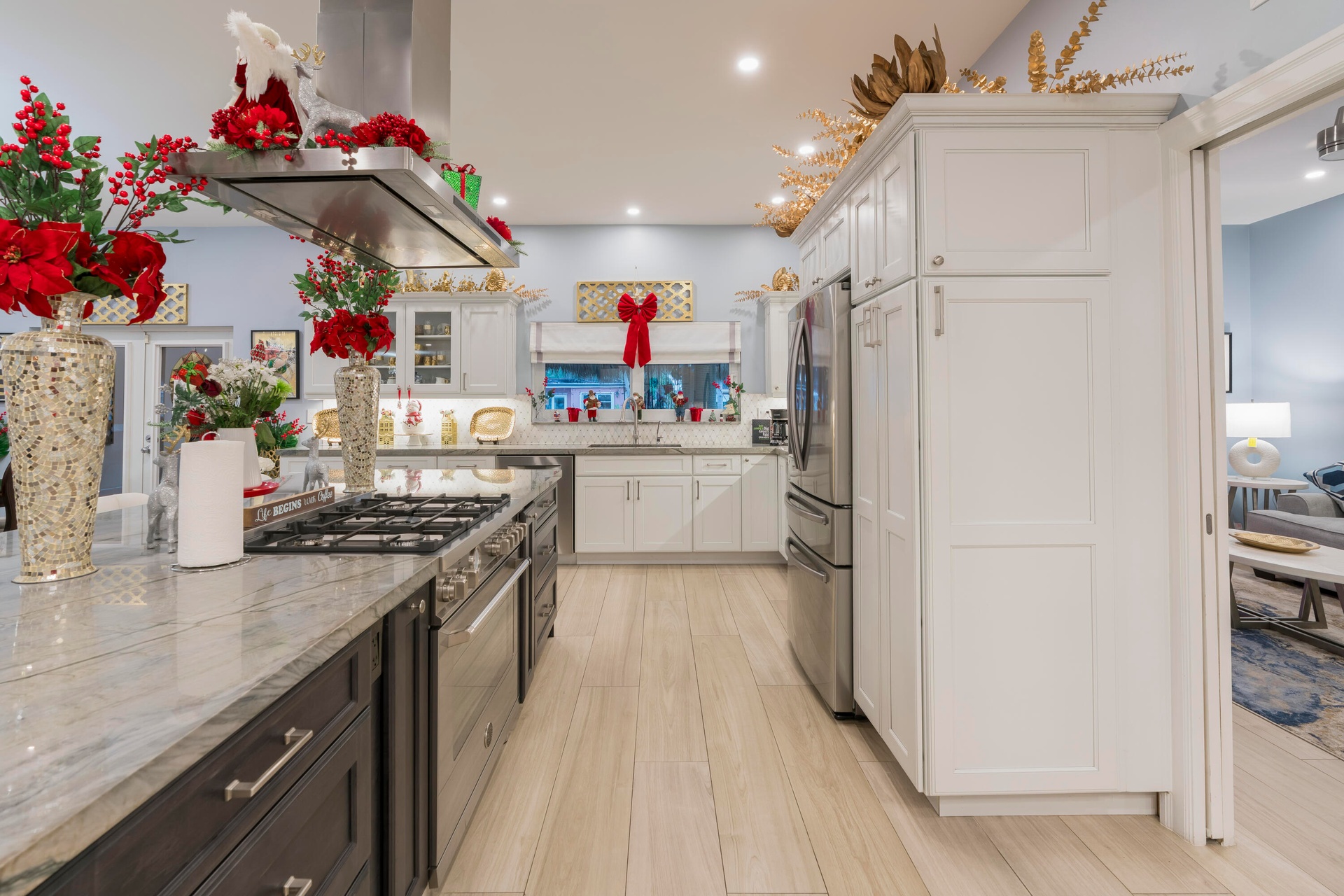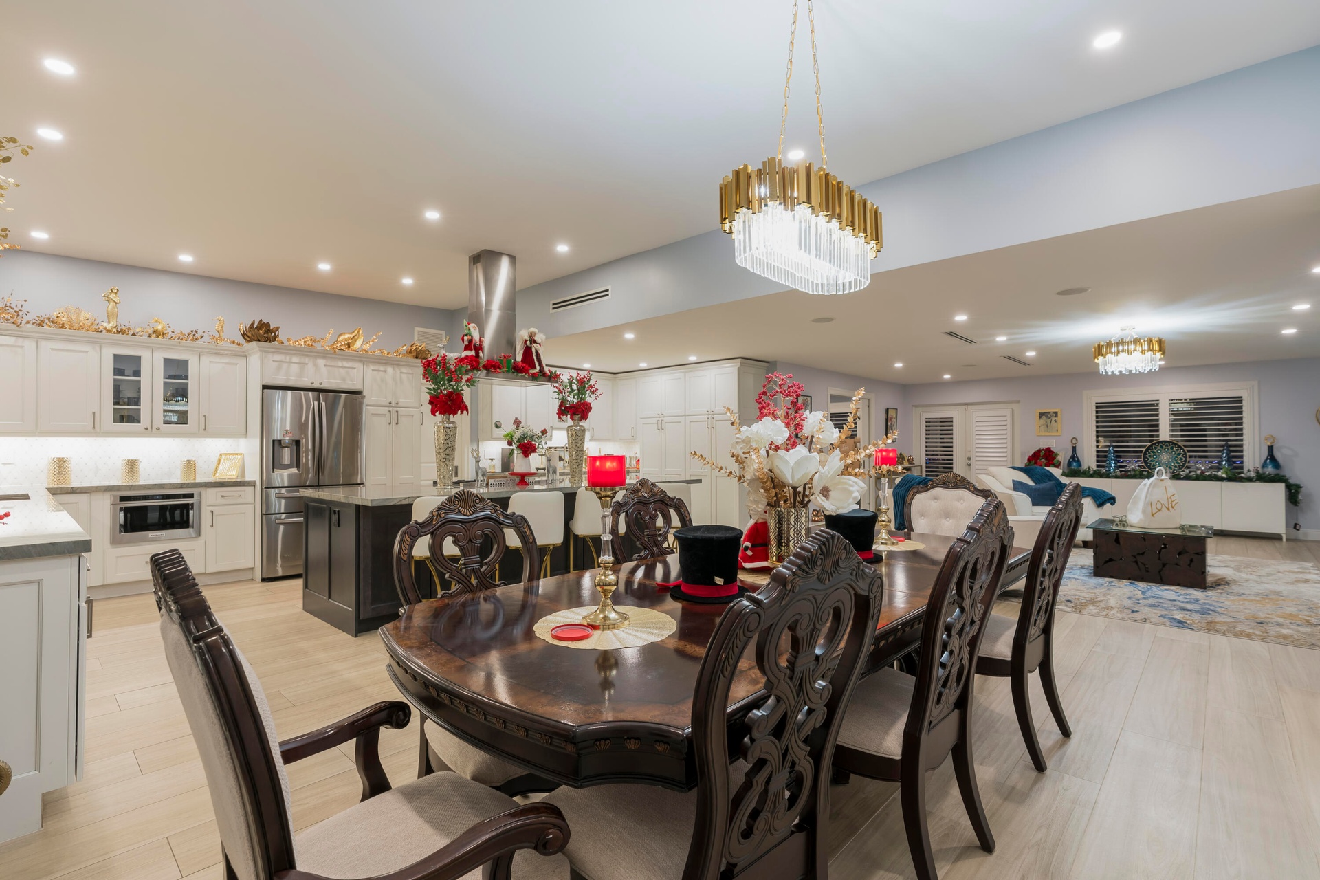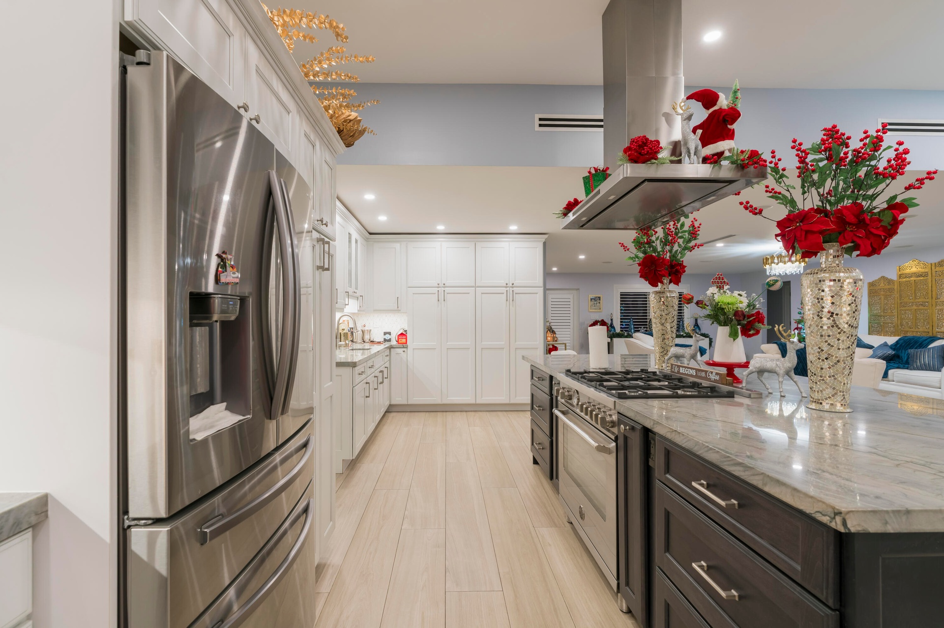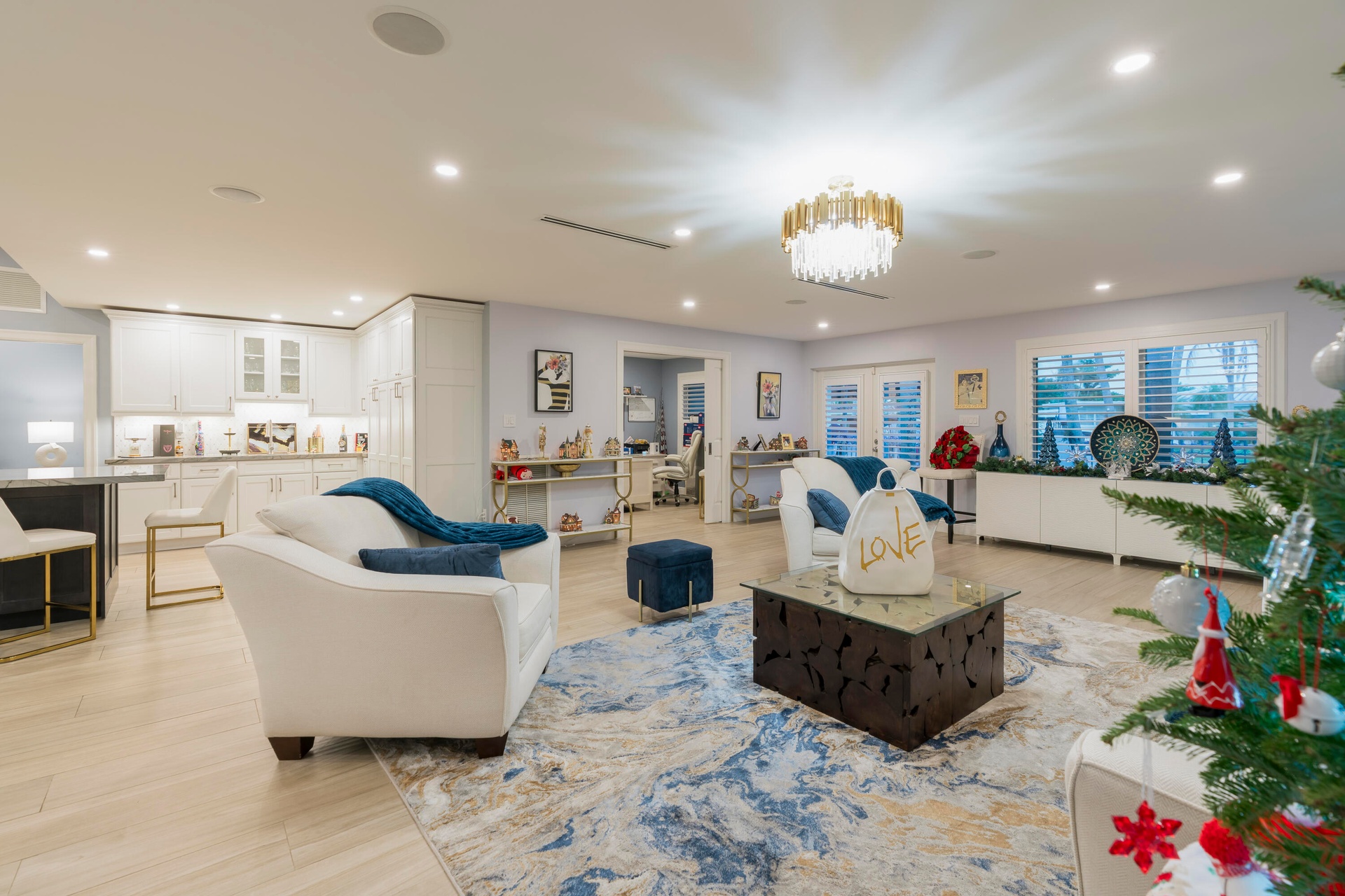 Completely taken down to the studs and rebuilt, this residence offers peace of mind and modern luxury throughout. A new 38' steel support beam allows for soaring ceilings, while impact-rated doors and windows, new walls, electrical, plumbing, and natural gas lines reflect a level of renovation rarely found. The gourmet kitchen is a showpiece—high-end stainless appliances, professional hood range, soft-close custom cabinetry with pull-out shelving, and exquisite quartzite countertopsdesigned equally for entertaining and everyday elegance. A flexible bonus space seamlessly transitions between a private theater and a fifth guest bedroom, featuring a custom-designed Murphy bed with integrated shelving and storageperfect for hosting in style.