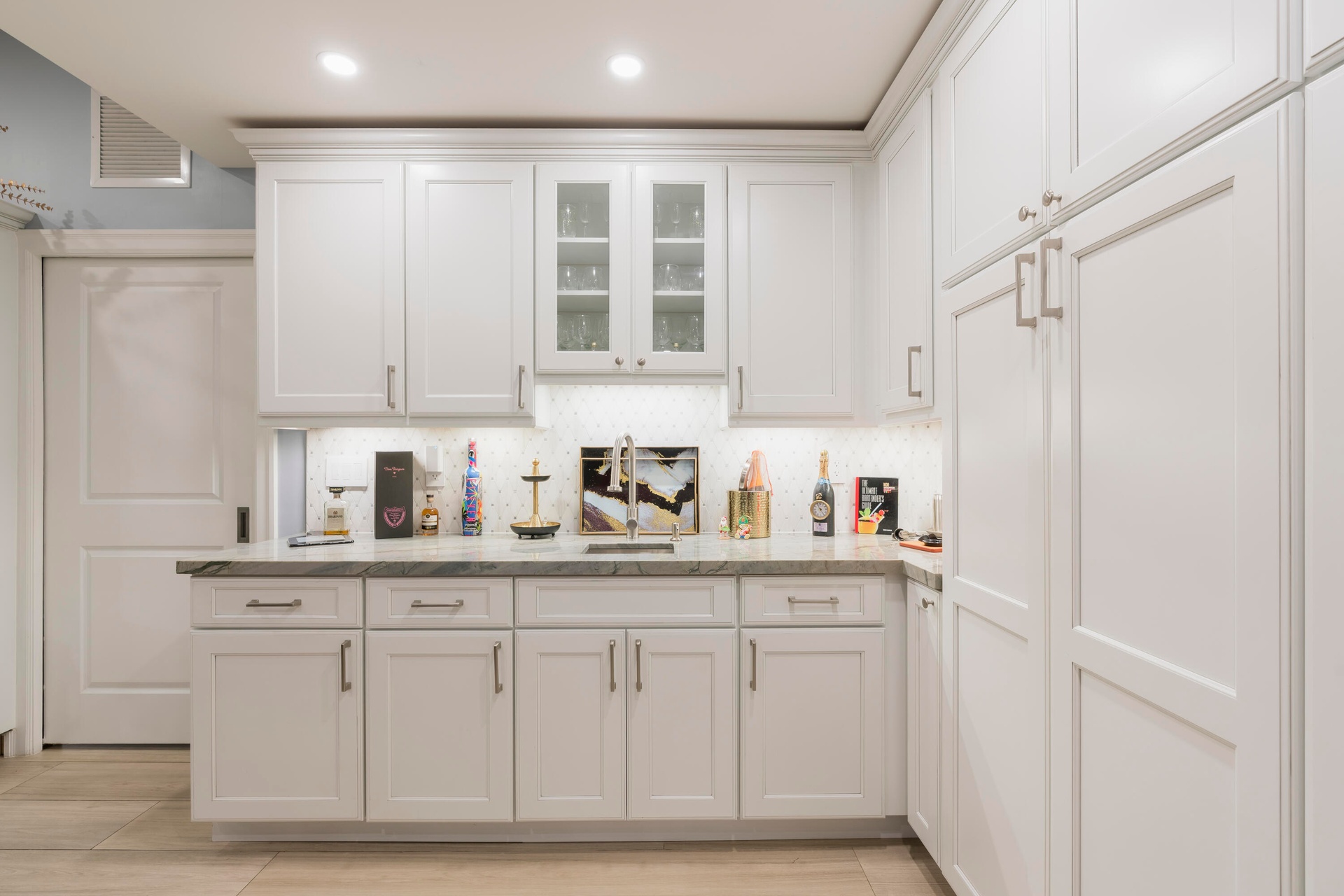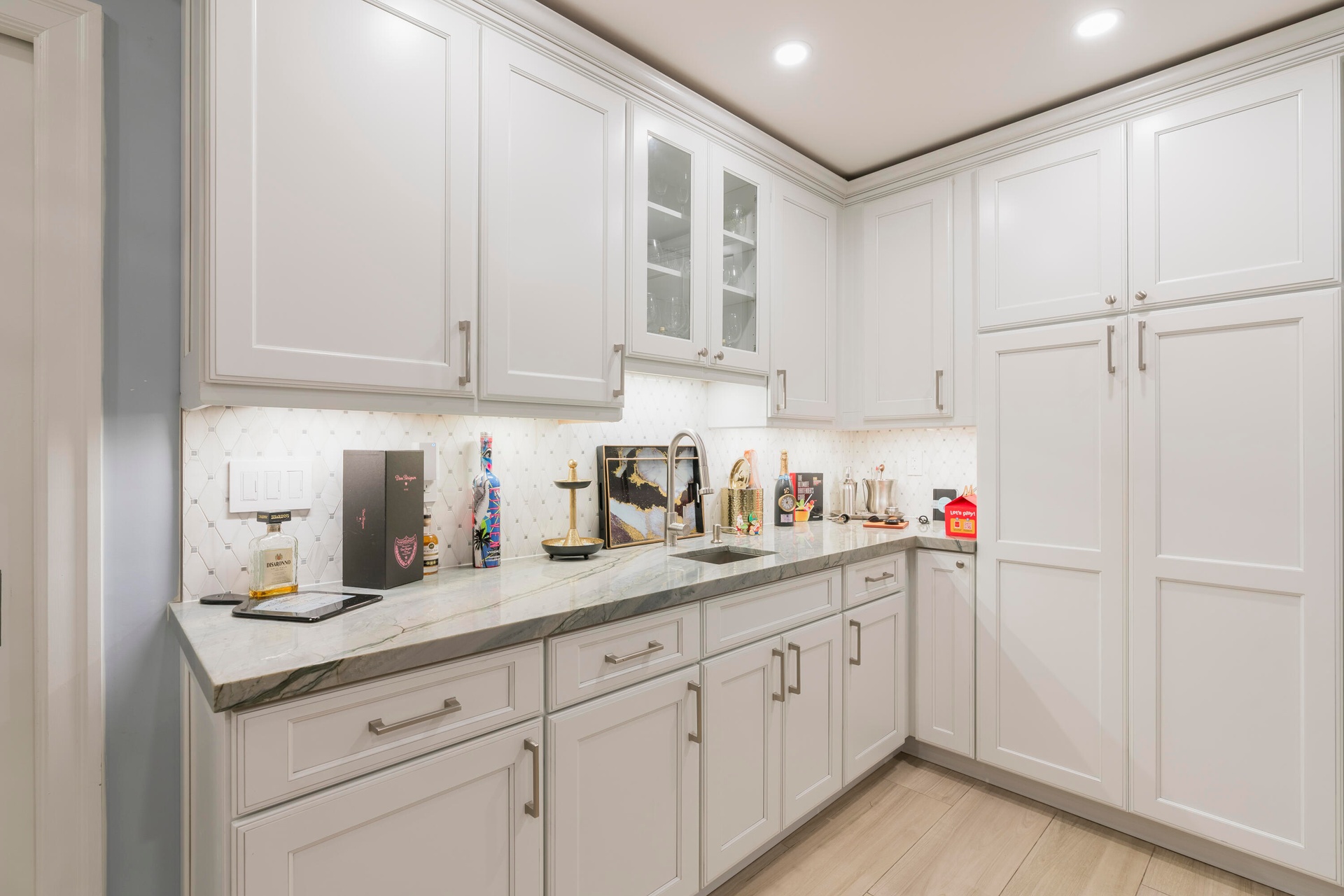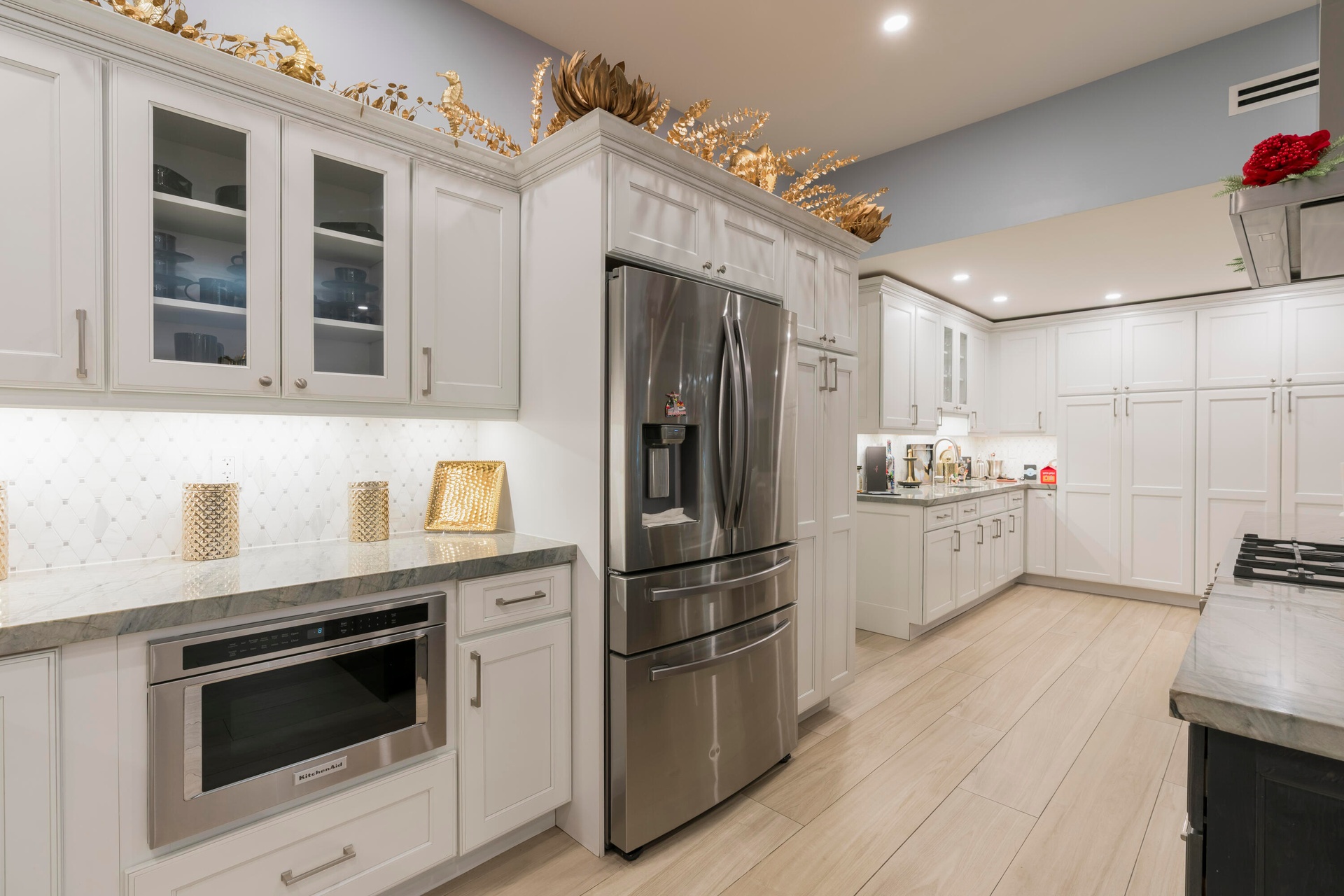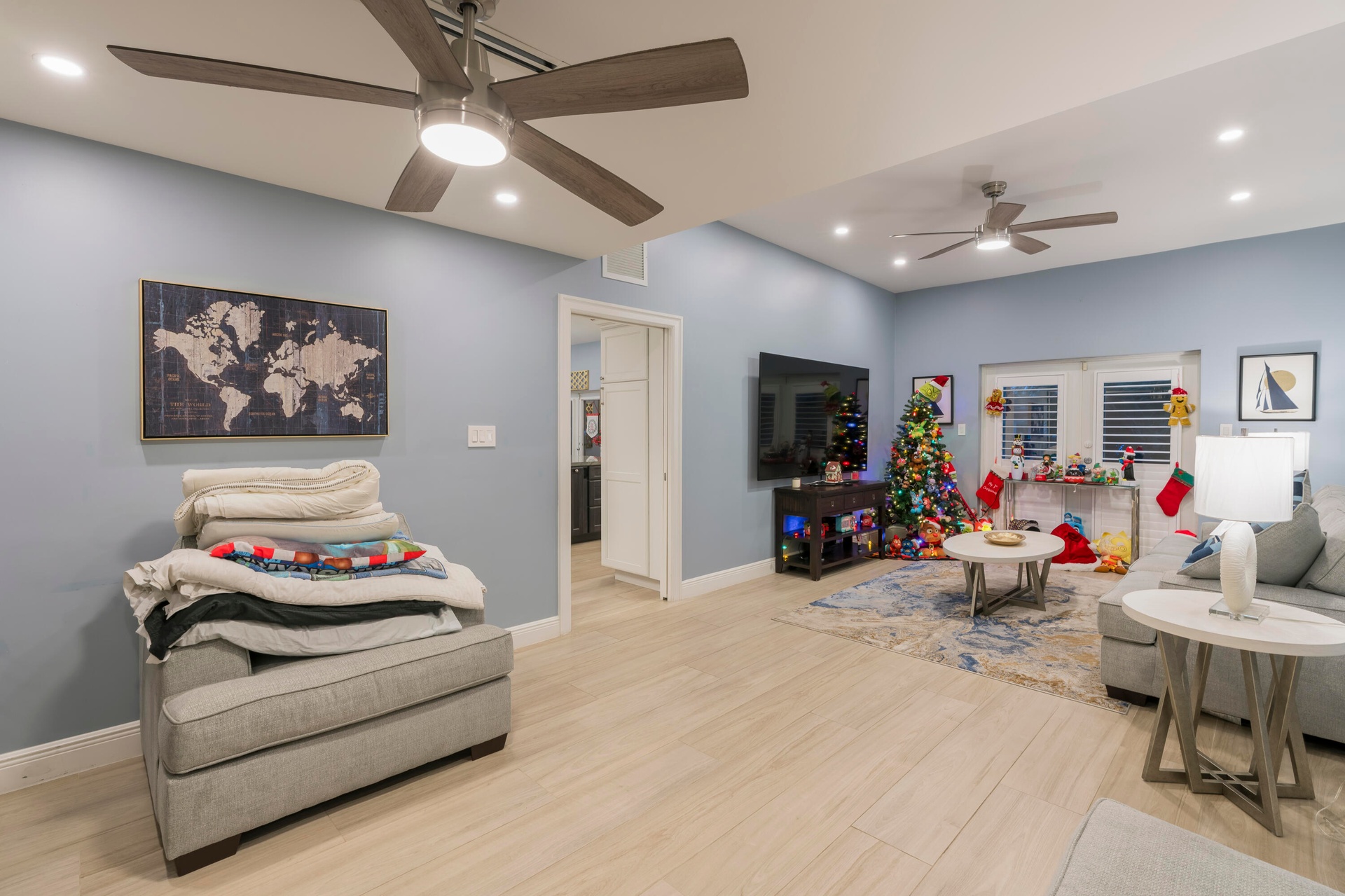 Completely taken down to the studs and rebuilt, this residence offers peace of mind and modern luxury throughout. A new 38' steel support beam allows for soaring ceilings, while impact-rated doors and windows, new walls, electrical, plumbing, and natural gas lines reflect a level of renovation rarely found. The gourmet kitchen is a showpiece—high-end stainless appliances, professional hood range, soft-close custom cabinetry with pull-out shelving, and exquisite quartzite countertopsdesigned equally for entertaining and everyday elegance. A flexible bonus space seamlessly transitions between a private theater and a fifth guest bedroom, featuring a custom-designed Murphy bed with integrated shelving and storageperfect for hosting in style.