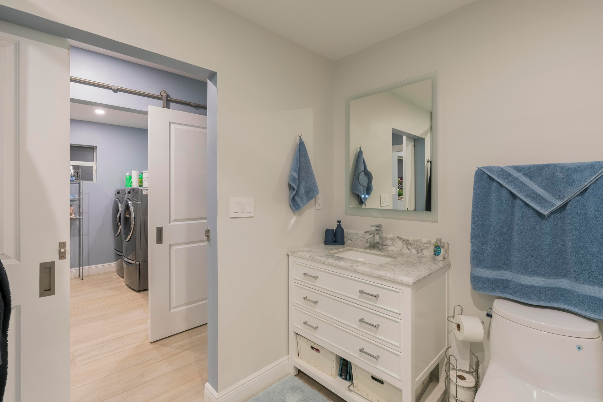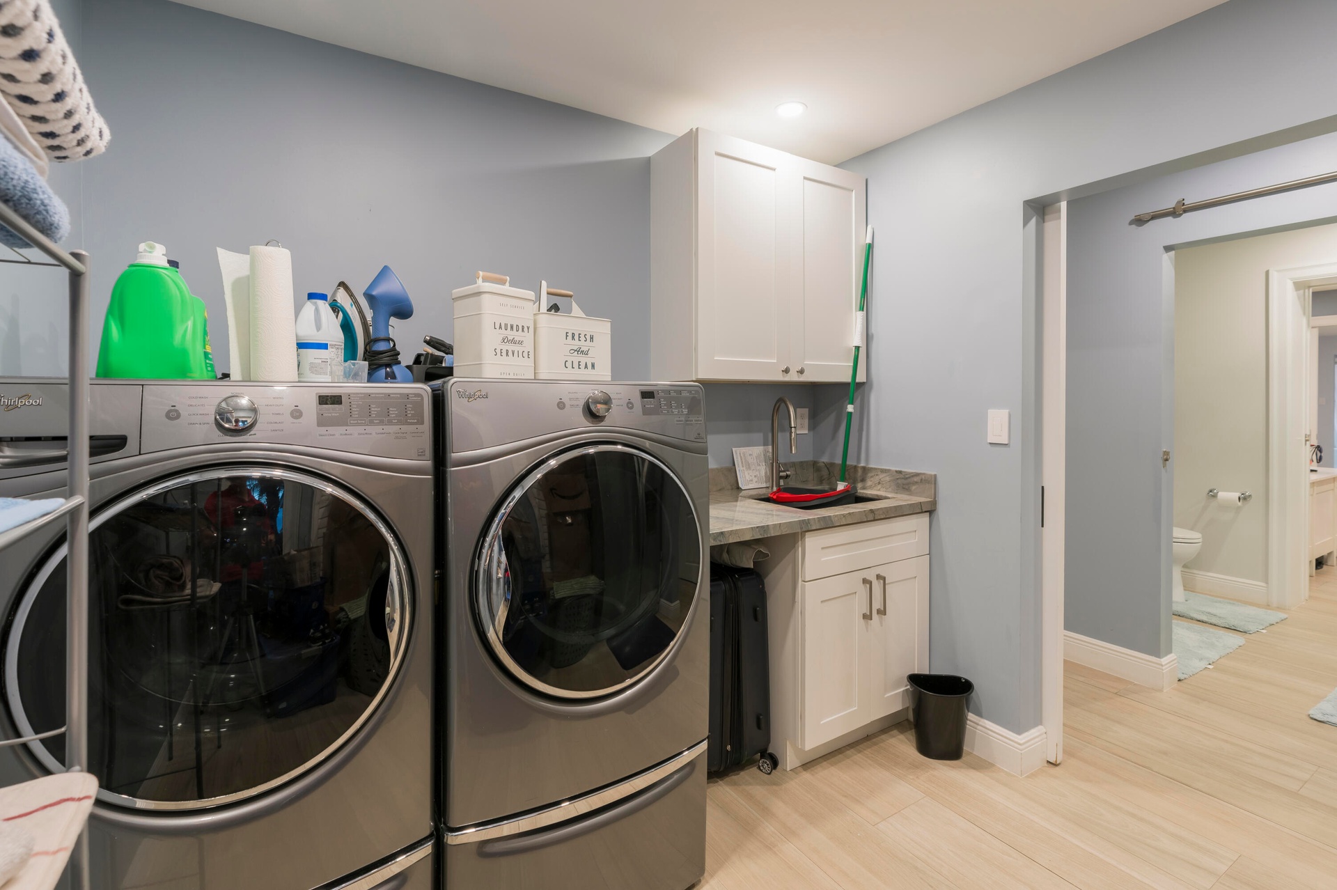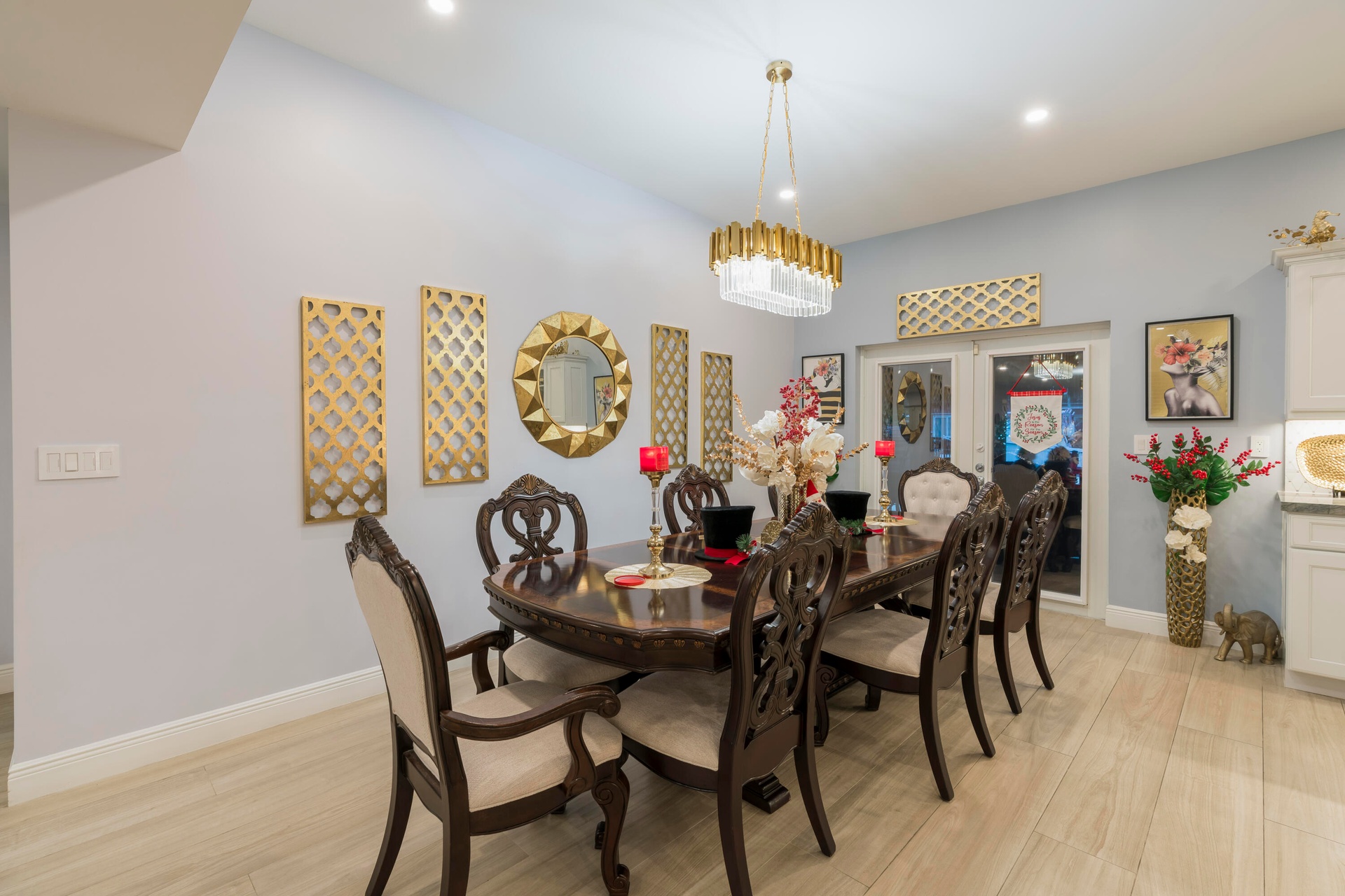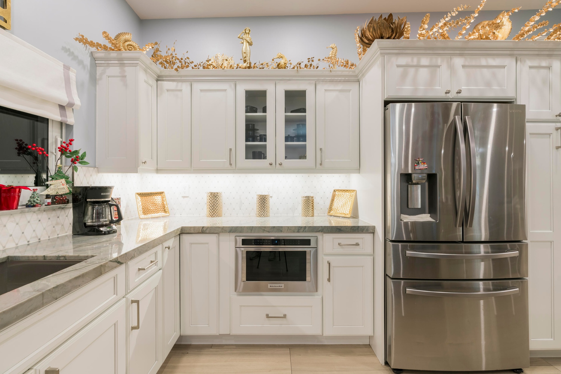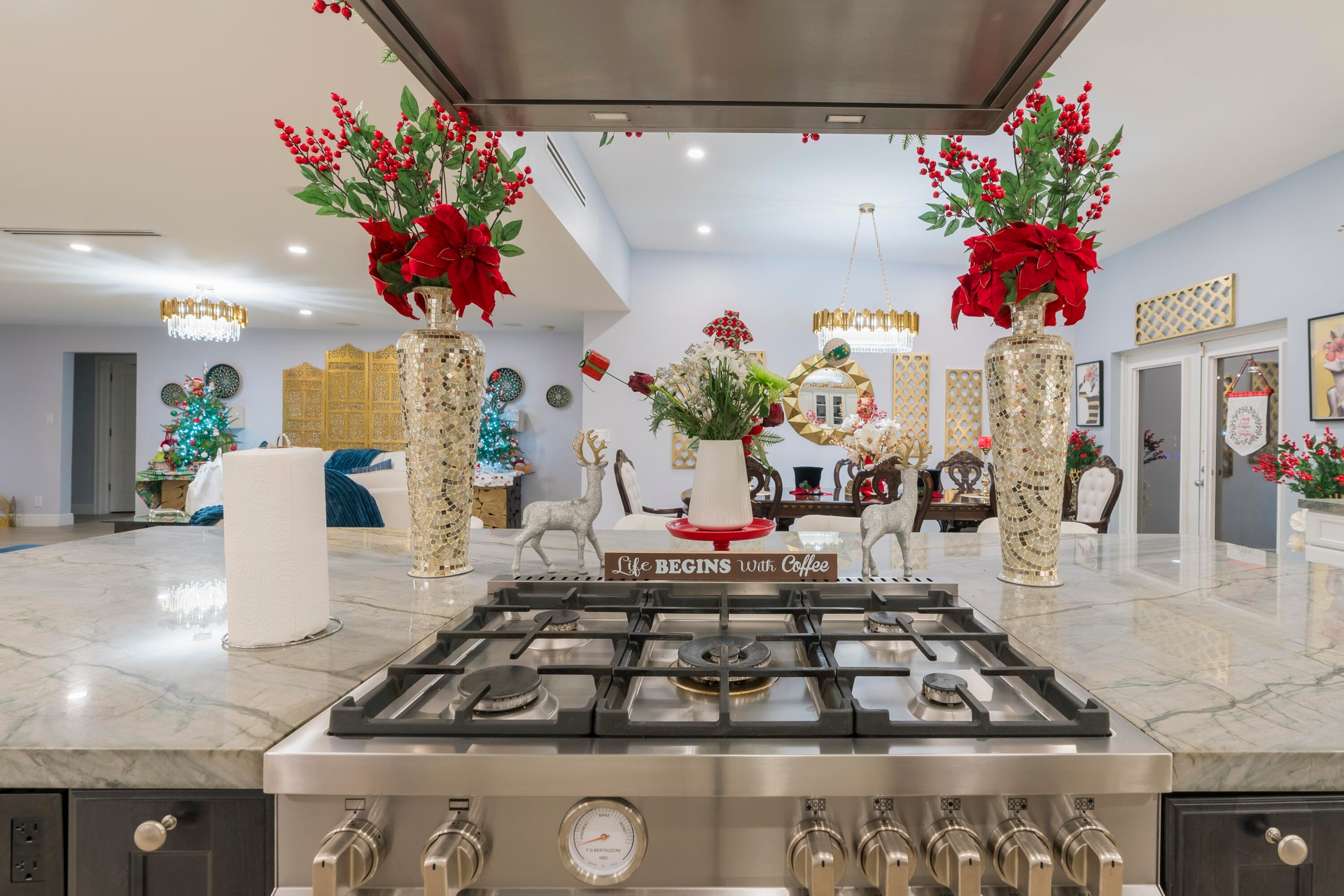 Completely taken down to the studs and rebuilt, this residence offers peace of mind and modern luxury throughout. A new 38' steel support beam allows for soaring ceilings, while impact-rated doors and windows, new walls, electrical, plumbing, and natural gas lines reflect a level of renovation rarely found. The gourmet kitchen is a showpiece—high-end stainless appliances, professional hood range, soft-close custom cabinetry with pull-out shelving, and exquisite quartzite countertopsdesigned equally for entertaining and everyday elegance. A flexible bonus space seamlessly transitions between a private theater and a fifth guest bedroom, featuring a custom-designed Murphy bed with integrated shelving and storageperfect for hosting in style.