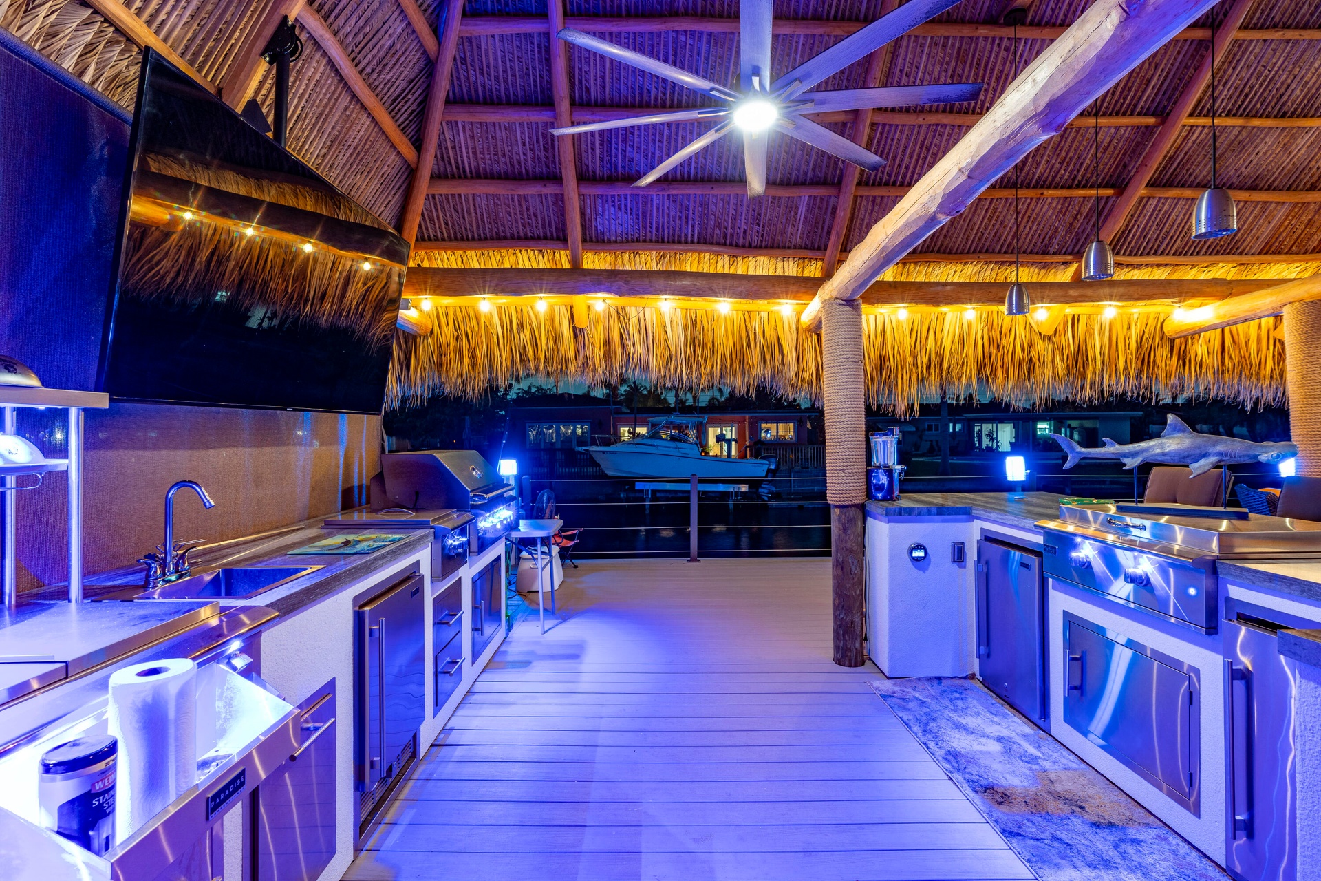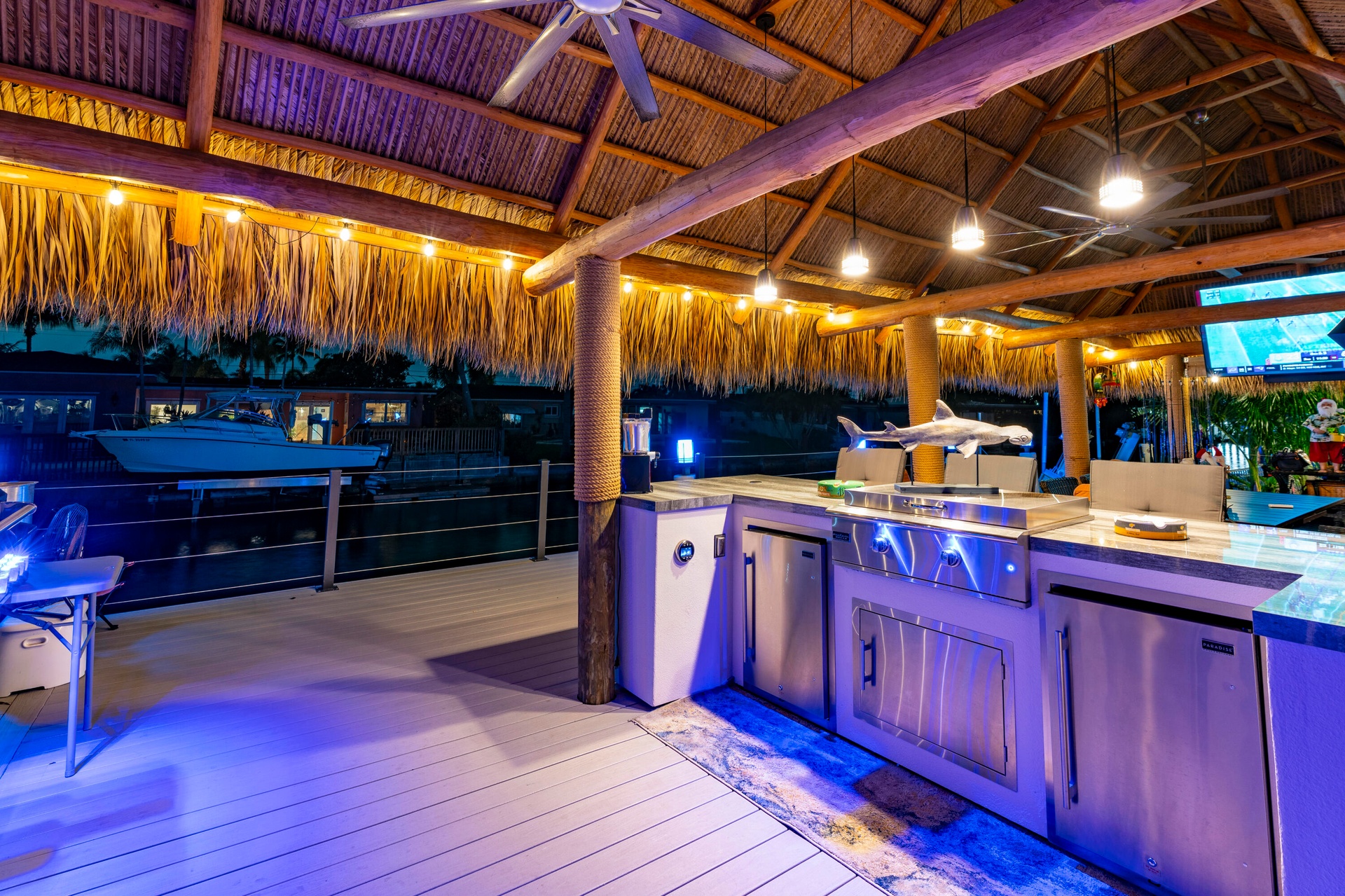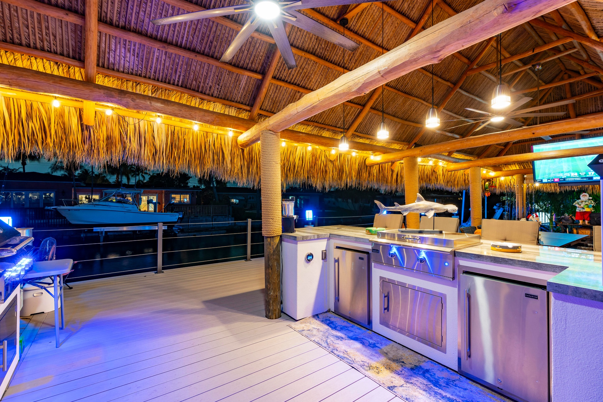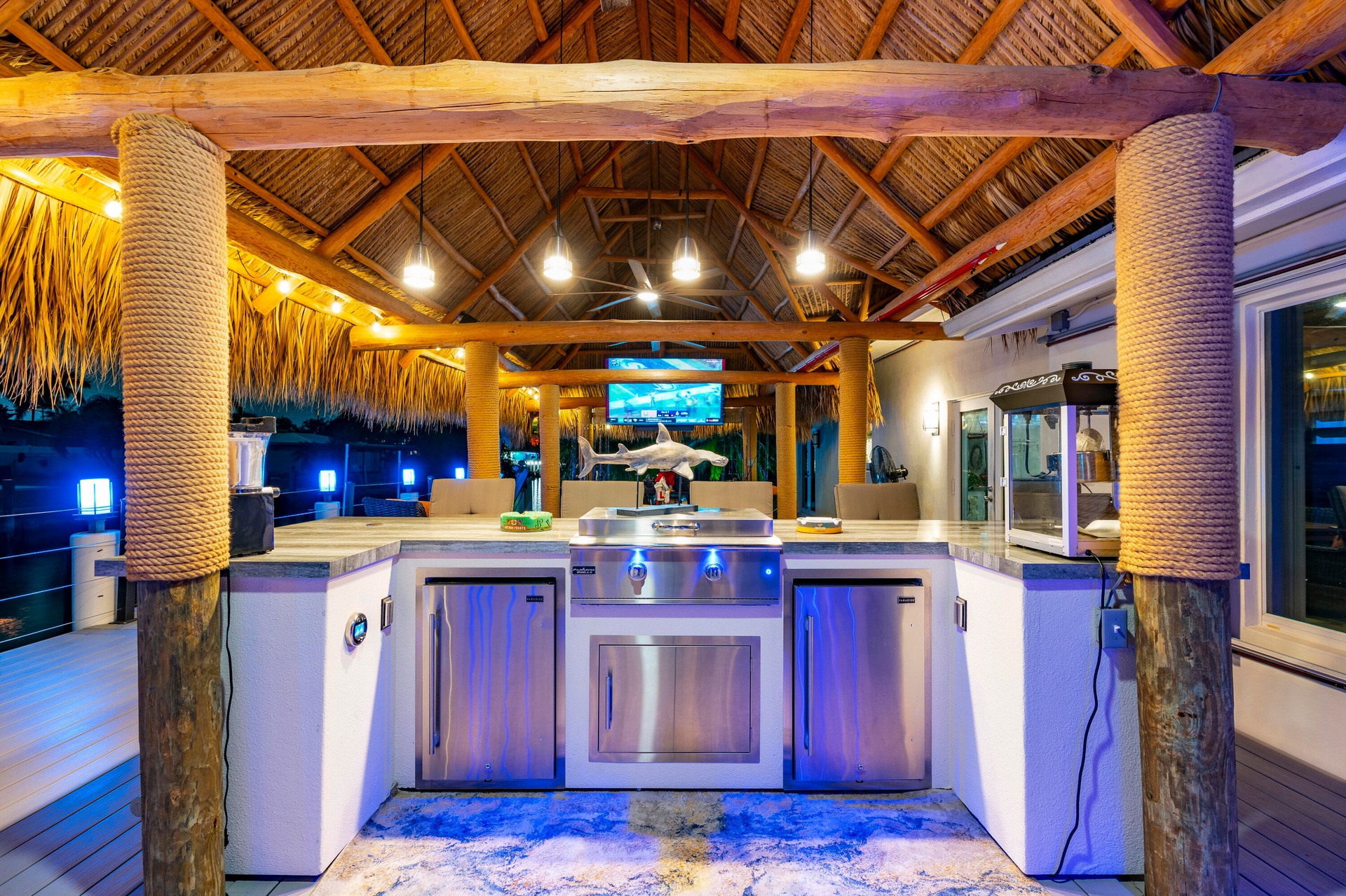 Step outside and experience a resort-caliber backyard oasis that defines Florida luxury living. A spectacular newly constructed tiki pavilion (2024)soaring 20 feet high and spanning over 1,050 square feet of covered entertaining spacesets the stage for unforgettable gatherings. No detail was overlooked: rope-wrapped columns, ambient accent lighting, and a fully equipped commercial-grade summer kitchen featuring dual refrigerators, beverage cooler, ice maker, Twin Eagle grill, flat grill, rotisserie, side-by-side burners, prep sink, storage drawers, and a dedicated condiment station.