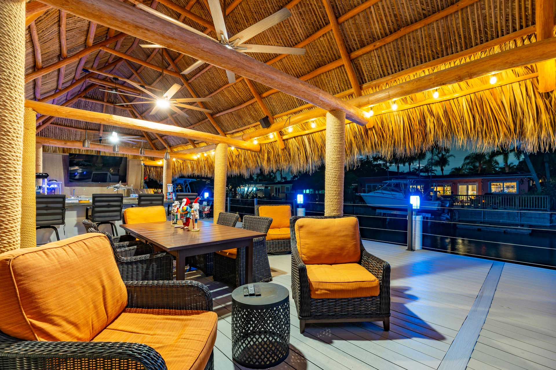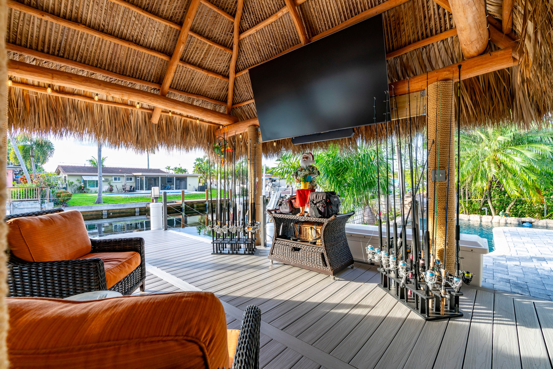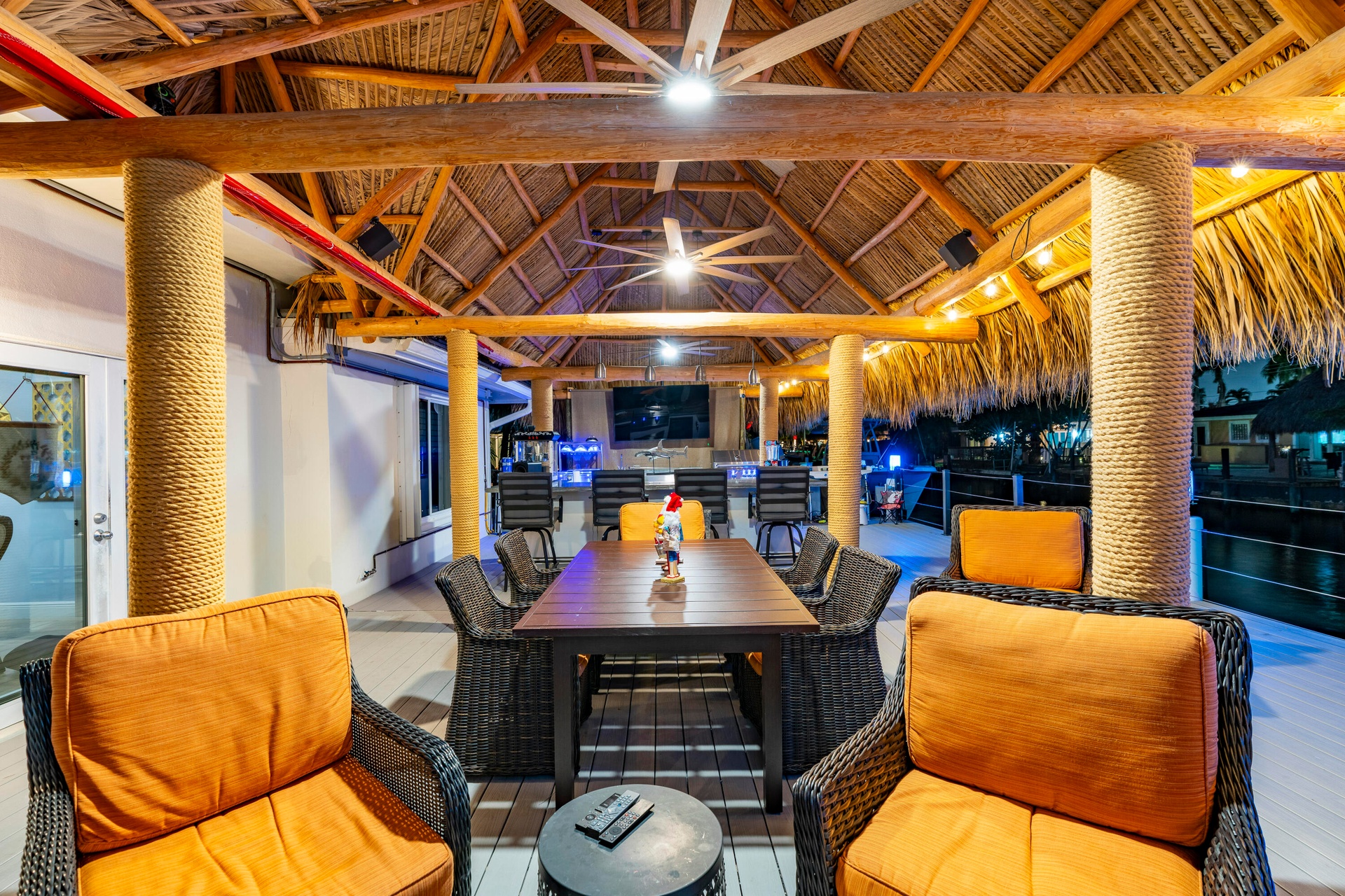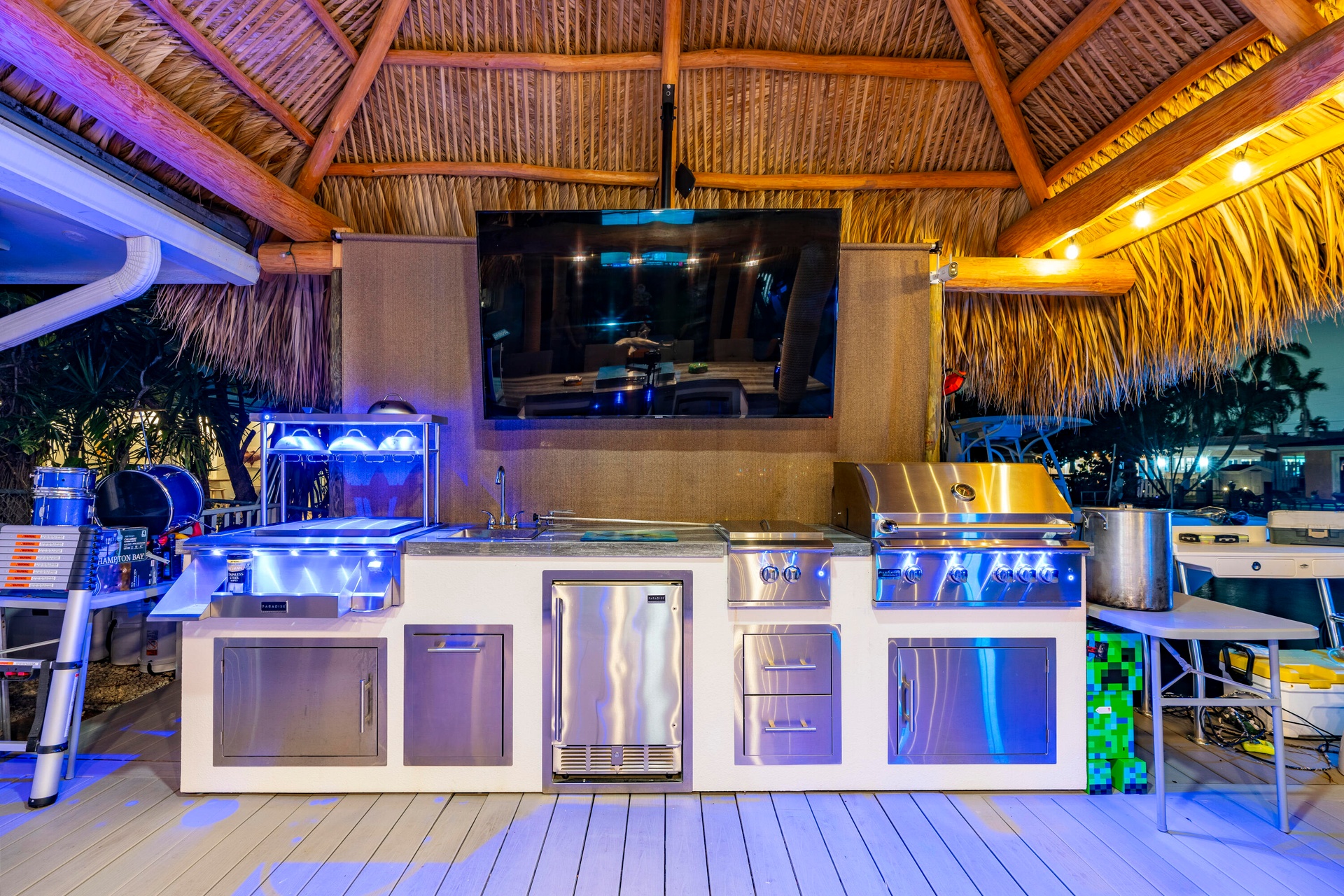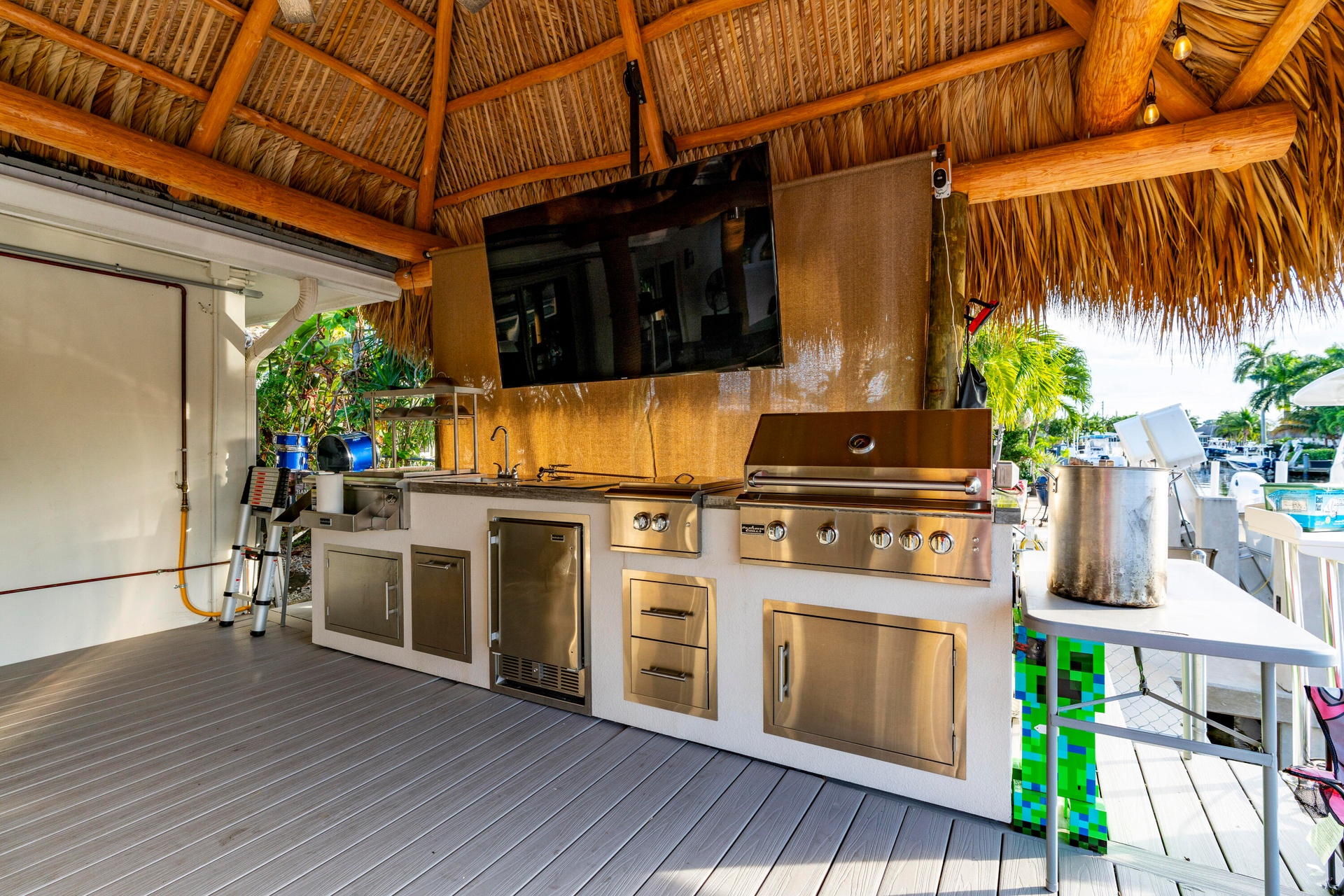 Step outside and experience a resort-caliber backyard oasis that defines Florida luxury living. A spectacular newly constructed tiki pavilion (2024)soaring 20 feet high and spanning over 1,050 square feet of covered entertaining spacesets the stage for unforgettable gatherings. No detail was overlooked: rope-wrapped columns, ambient accent lighting, and a fully equipped commercial-grade summer kitchen featuring dual refrigerators, beverage cooler, ice maker, Twin Eagle grill, flat grill, rotisserie, side-by-side burners, prep sink, storage drawers, and a dedicated condiment station.