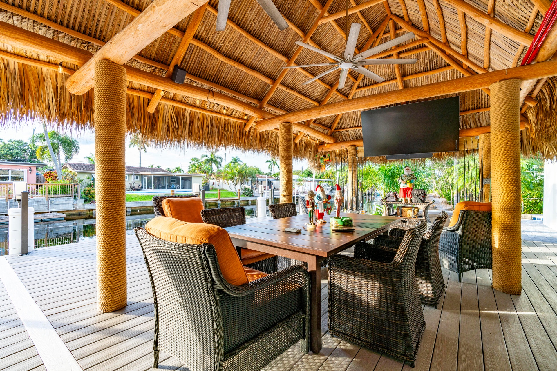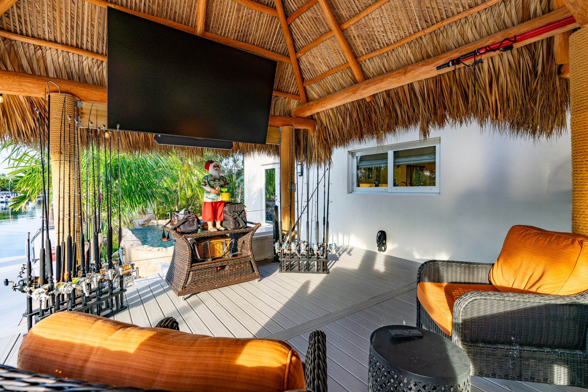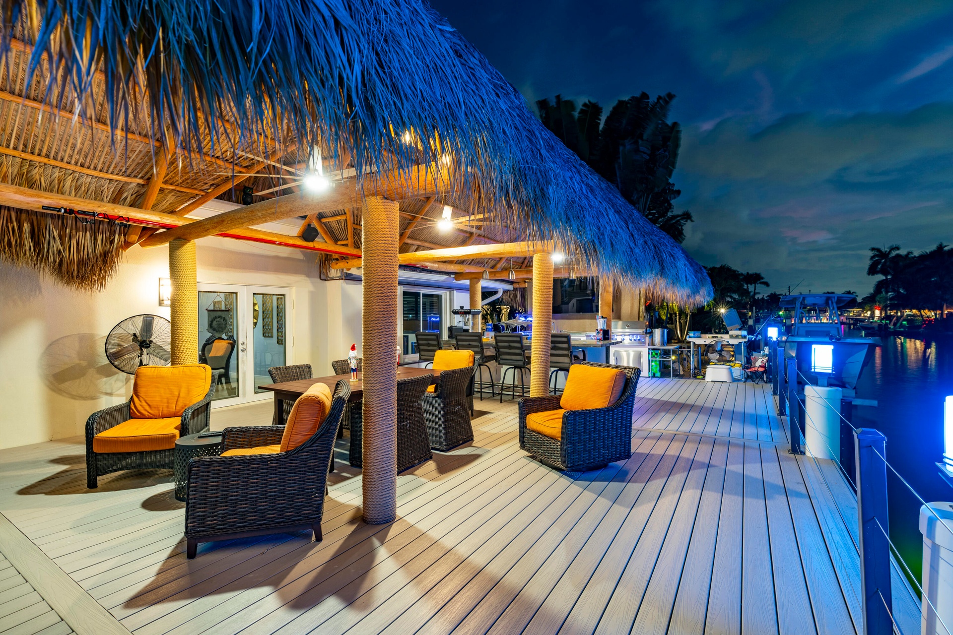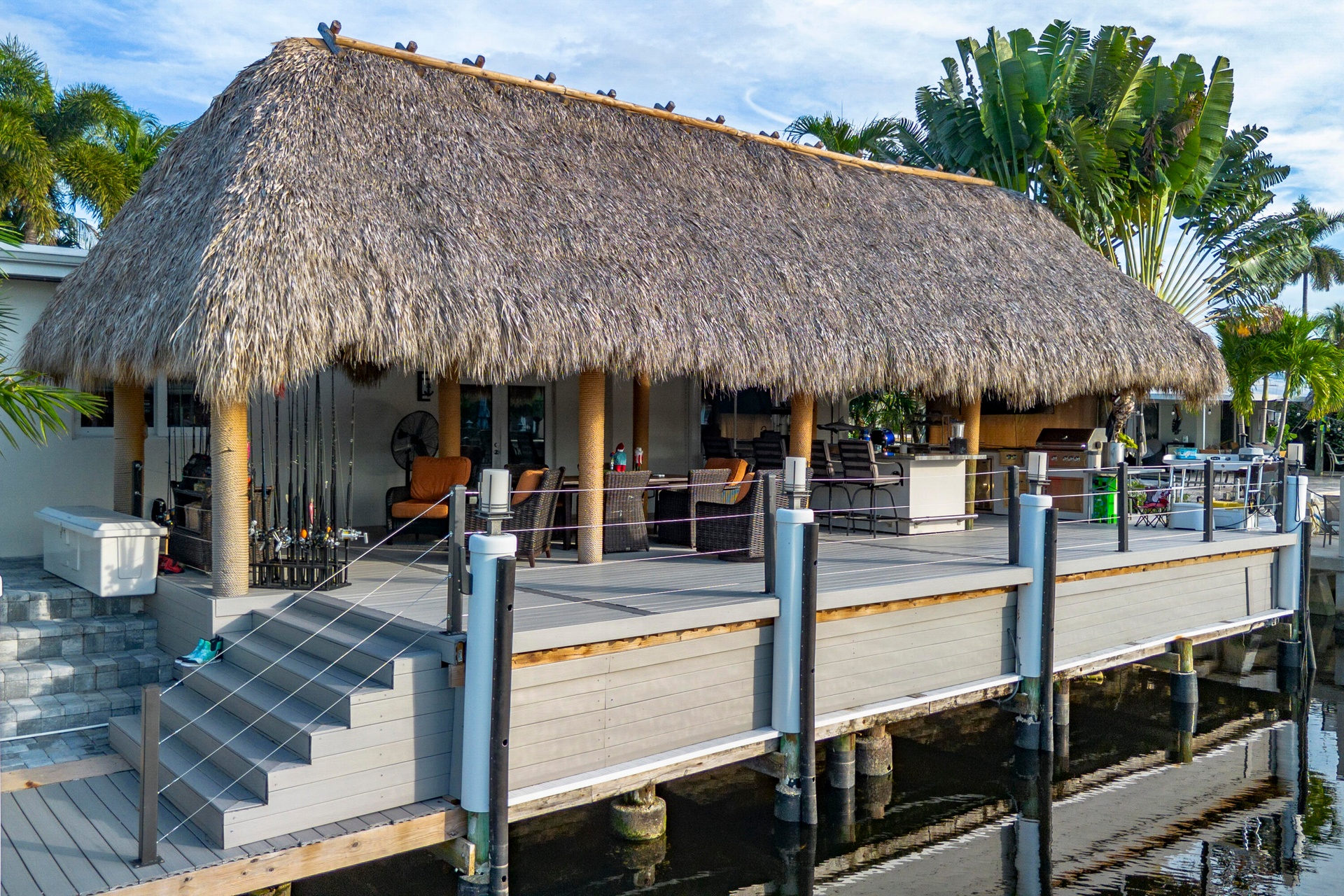 Step outside and experience a resort-caliber backyard oasis that defines Florida luxury living. A spectacular newly constructed tiki pavilion (2024)soaring 20 feet high and spanning over 1,050 square feet of covered entertaining spacesets the stage for unforgettable gatherings. No detail was overlooked: rope-wrapped columns, ambient accent lighting, and a fully equipped commercial-grade summer kitchen featuring dual refrigerators, beverage cooler, ice maker, Twin Eagle grill, flat grill, rotisserie, side-by-side burners, prep sink, storage drawers, and a dedicated condiment station.