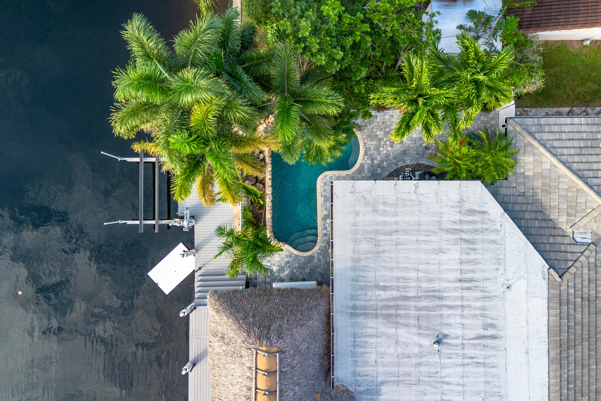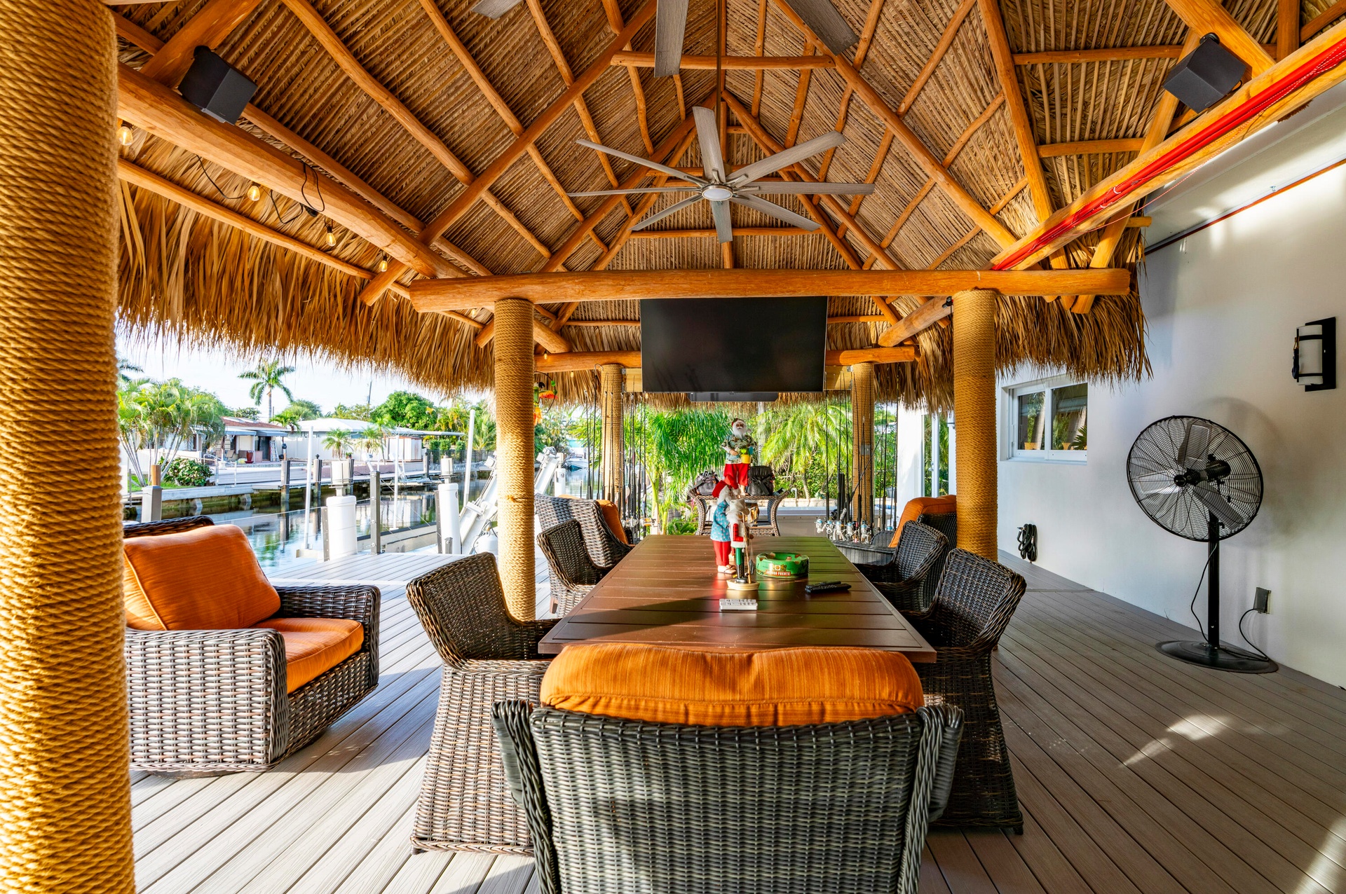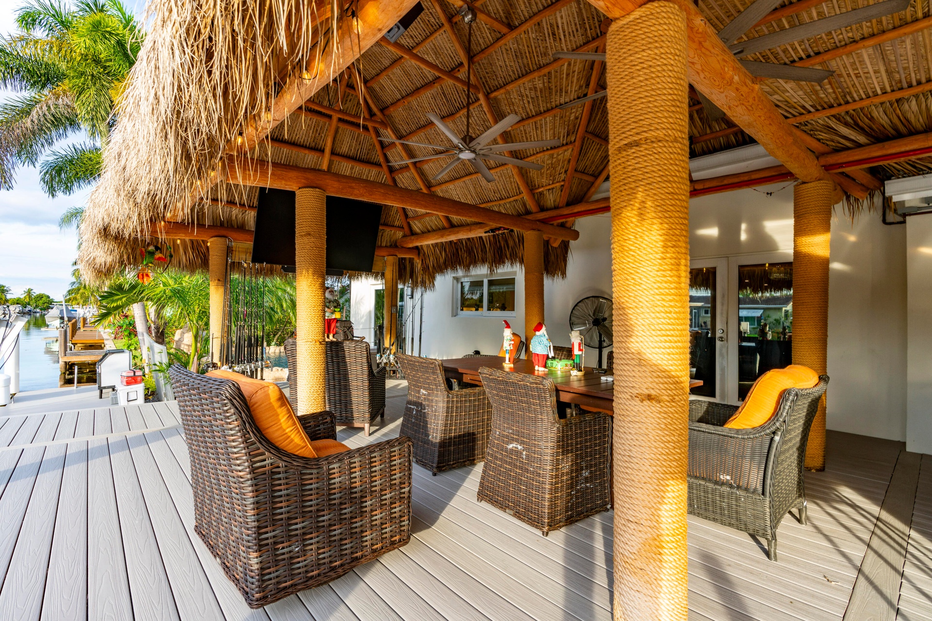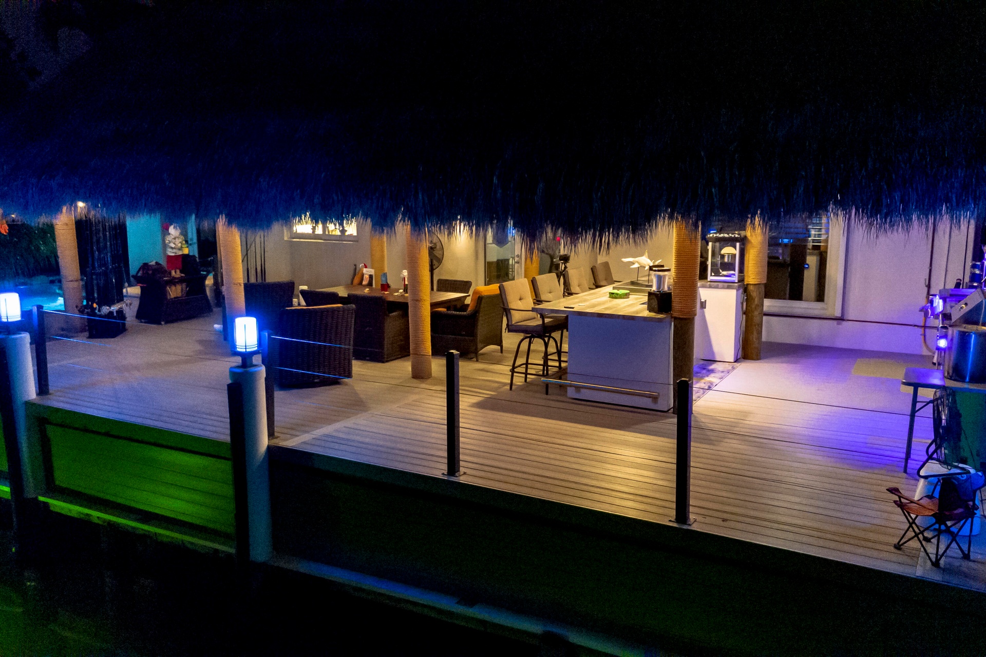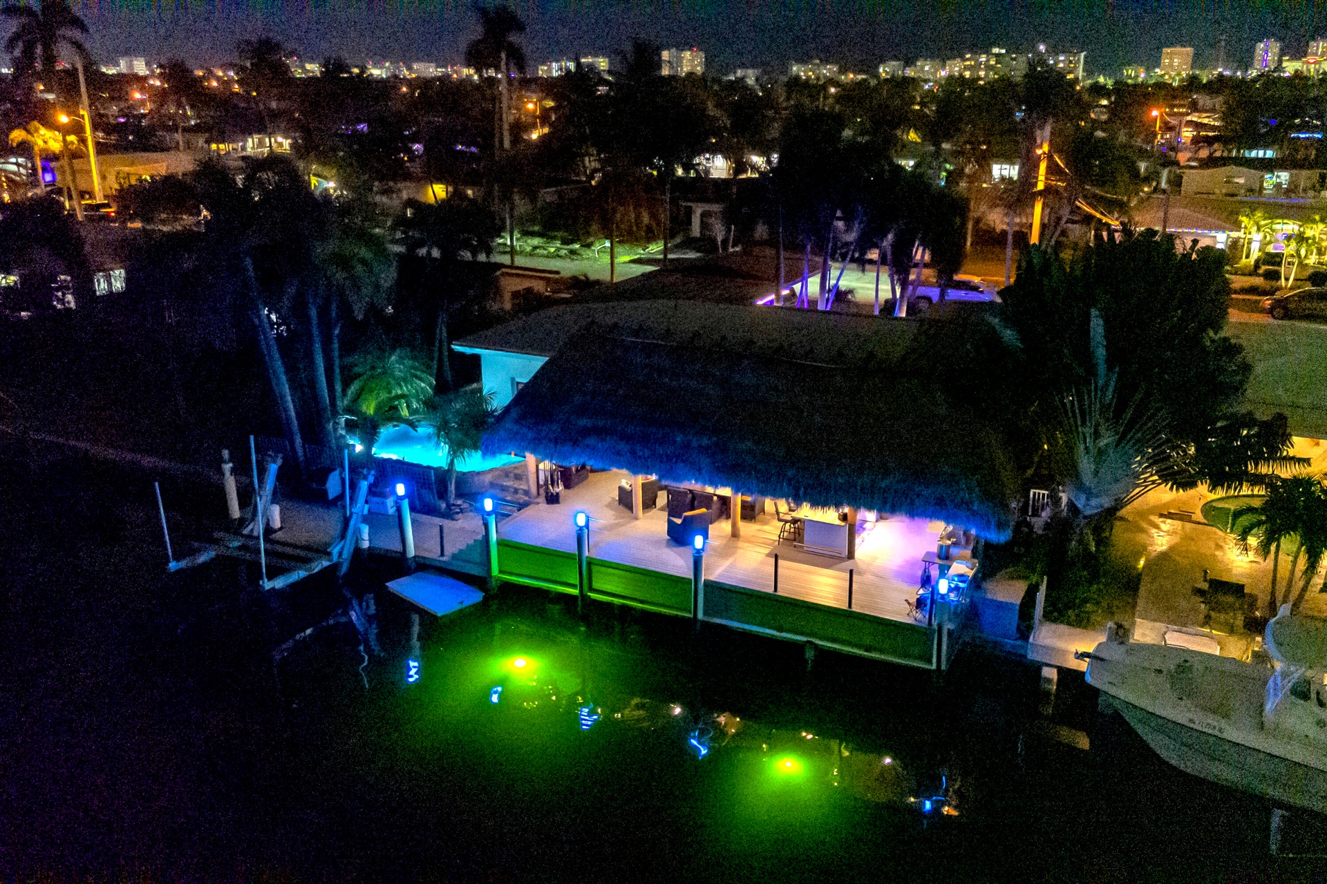 Step outside and experience a resort-caliber backyard oasis that defines Florida luxury living. A spectacular newly constructed tiki pavilion (2024)soaring 20 feet high and spanning over 1,050 square feet of covered entertaining spacesets the stage for unforgettable gatherings. No detail was overlooked: rope-wrapped columns, ambient accent lighting, and a fully equipped commercial-grade summer kitchen featuring dual refrigerators, beverage cooler, ice maker, Twin Eagle grill, flat grill, rotisserie, side-by-side burners, prep sink, storage drawers, and a dedicated condiment station.