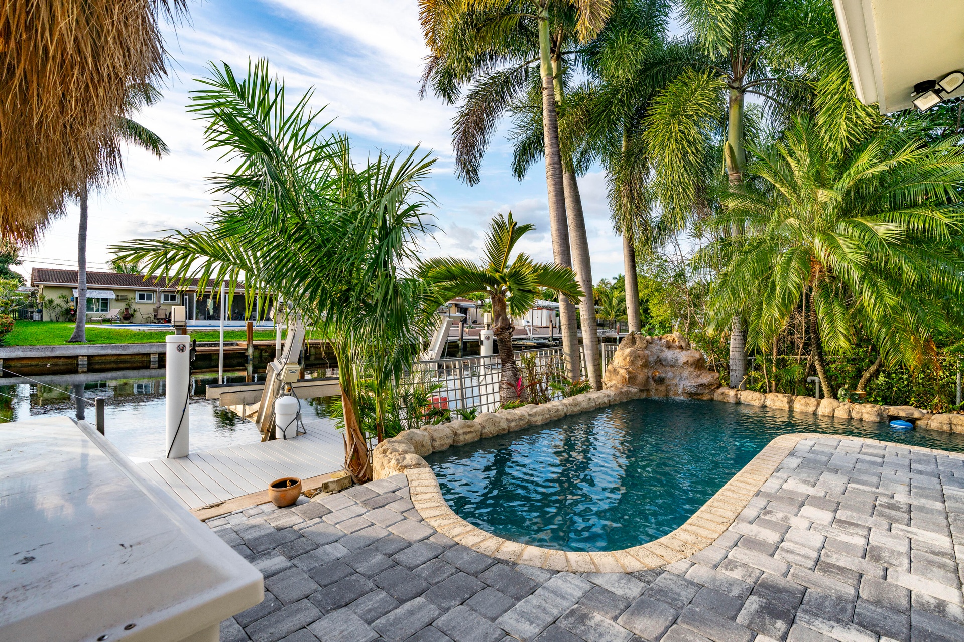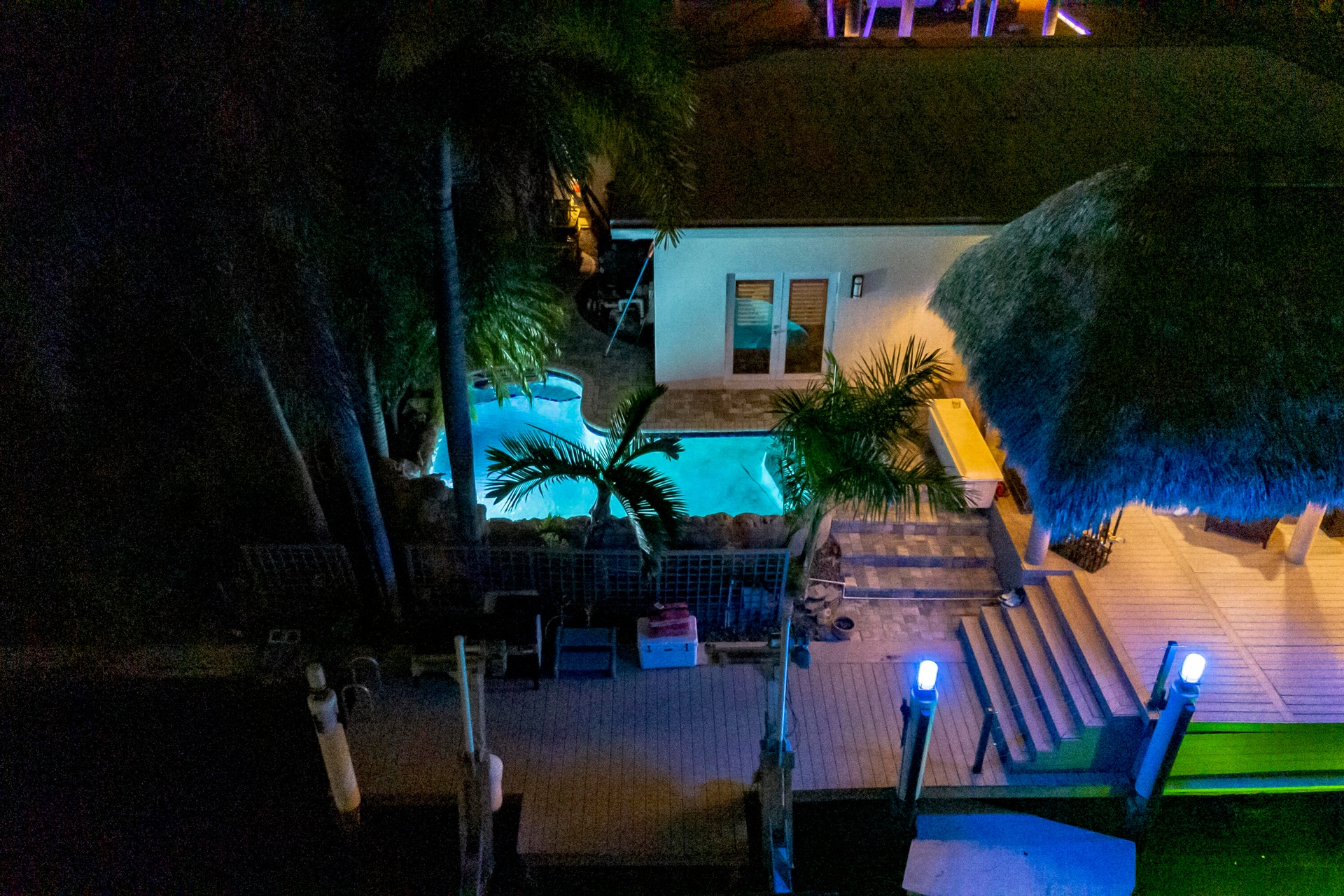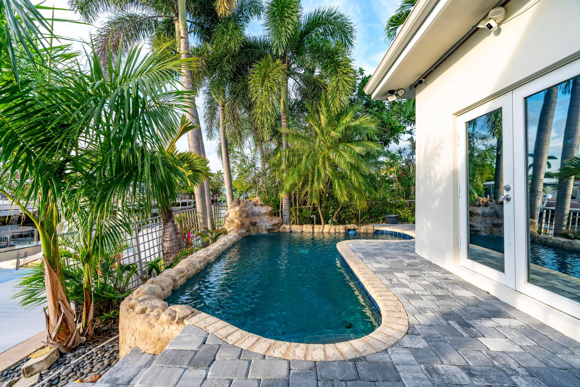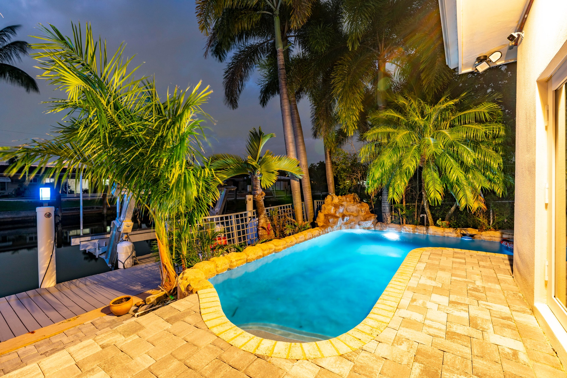 Surrounded by lush, professionally landscaped grounds with custom lighting, the lagoon-style saltwater pool with rock waterfall offers year-round enjoyment, enhanced by a new electric pool heater (2024). Dock lighting above and below the water ensures effortless nighttime navigation and fish visibility.
