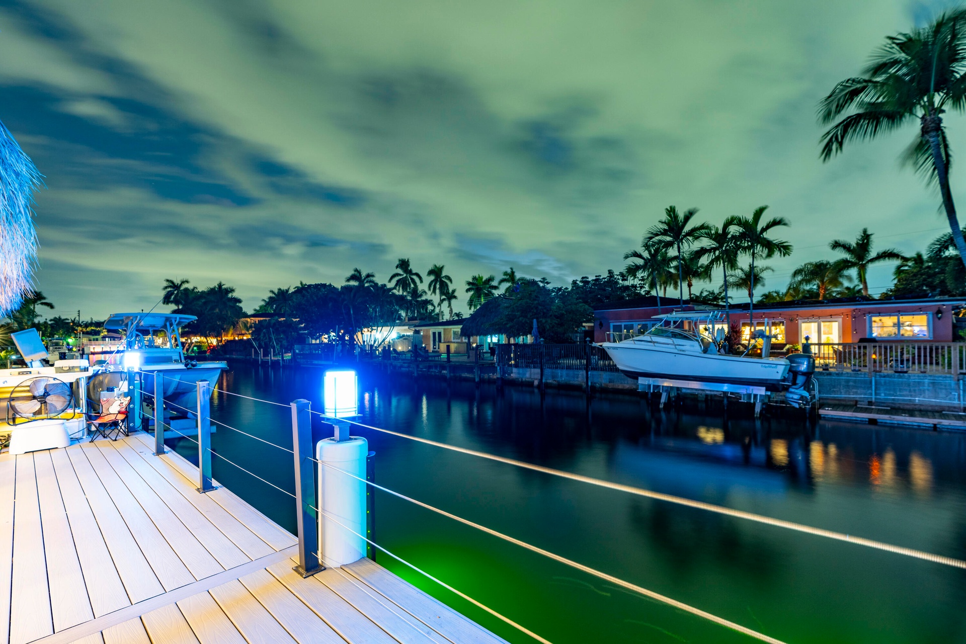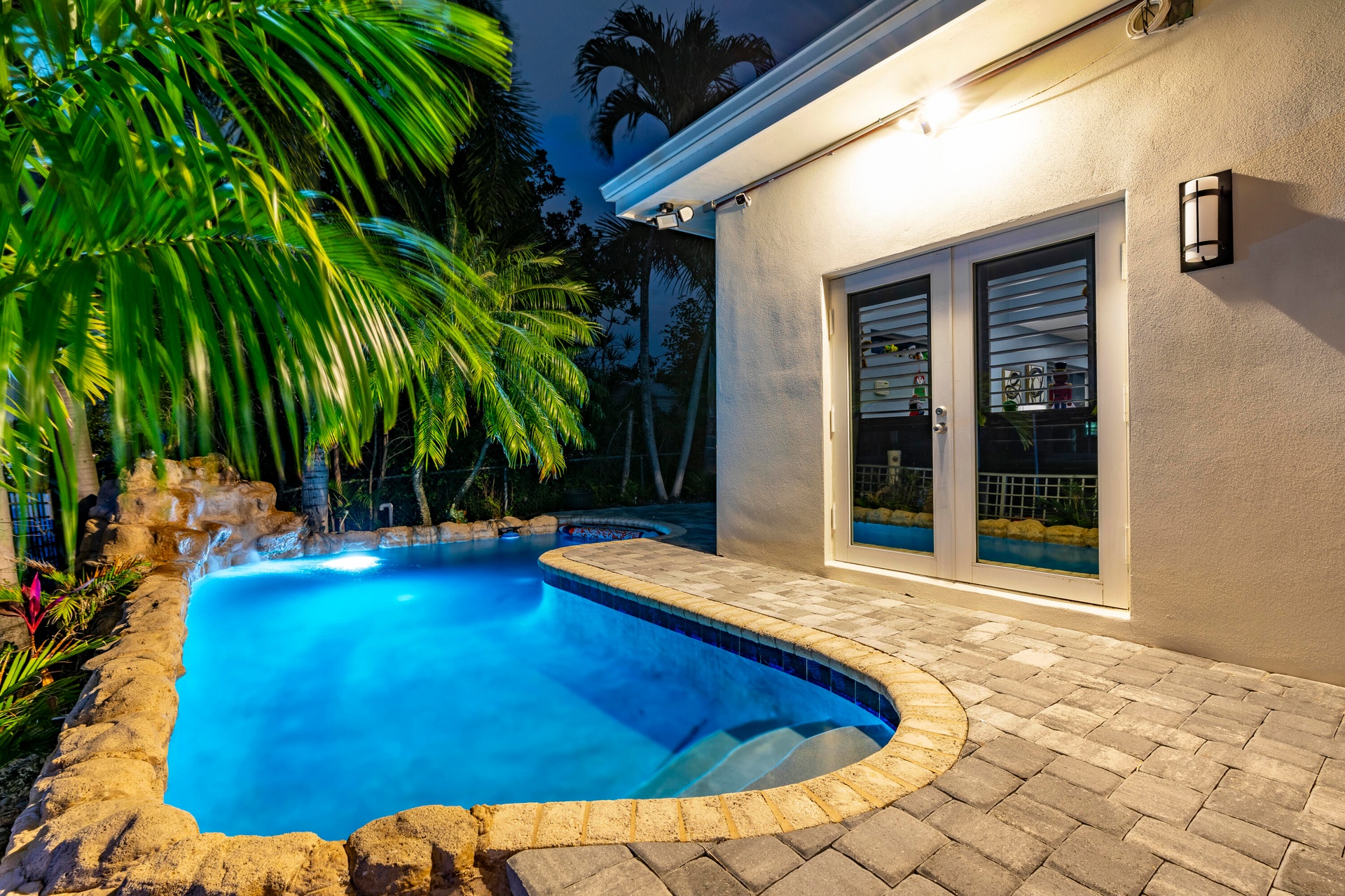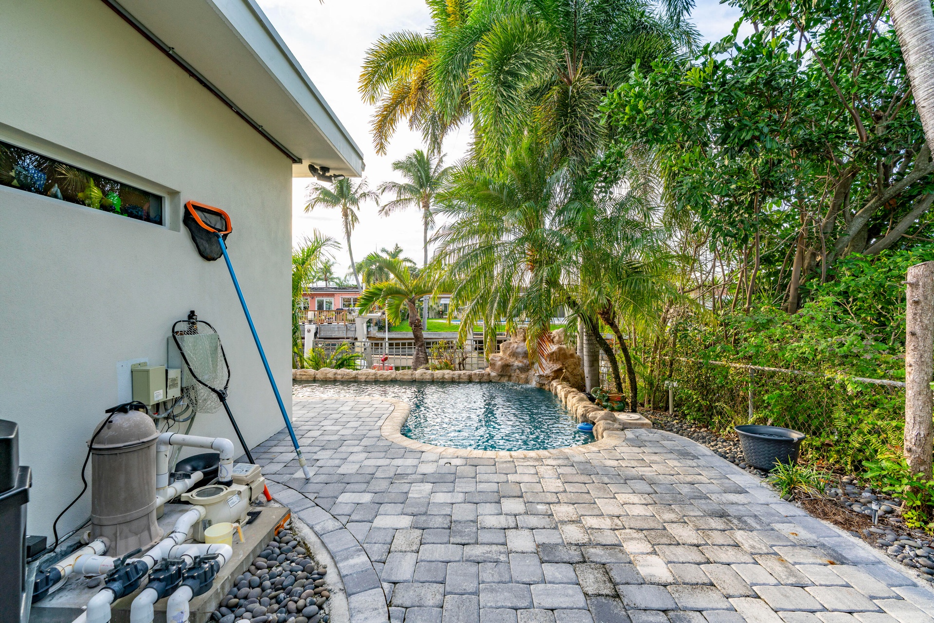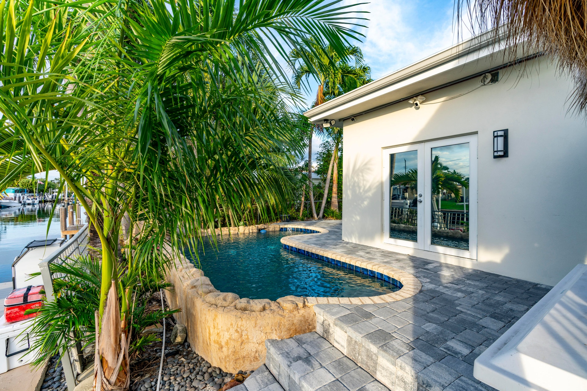 Surrounded by lush, professionally landscaped grounds with custom lighting, the lagoon-style saltwater pool with rock waterfall offers year-round enjoyment, enhanced by a new electric pool heater (2024). Dock lighting above and below the water ensures effortless nighttime navigation and fish visibility.