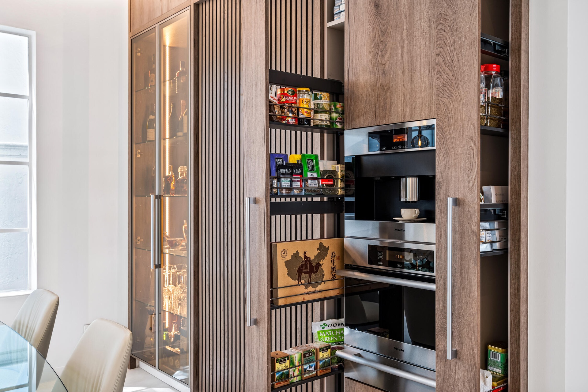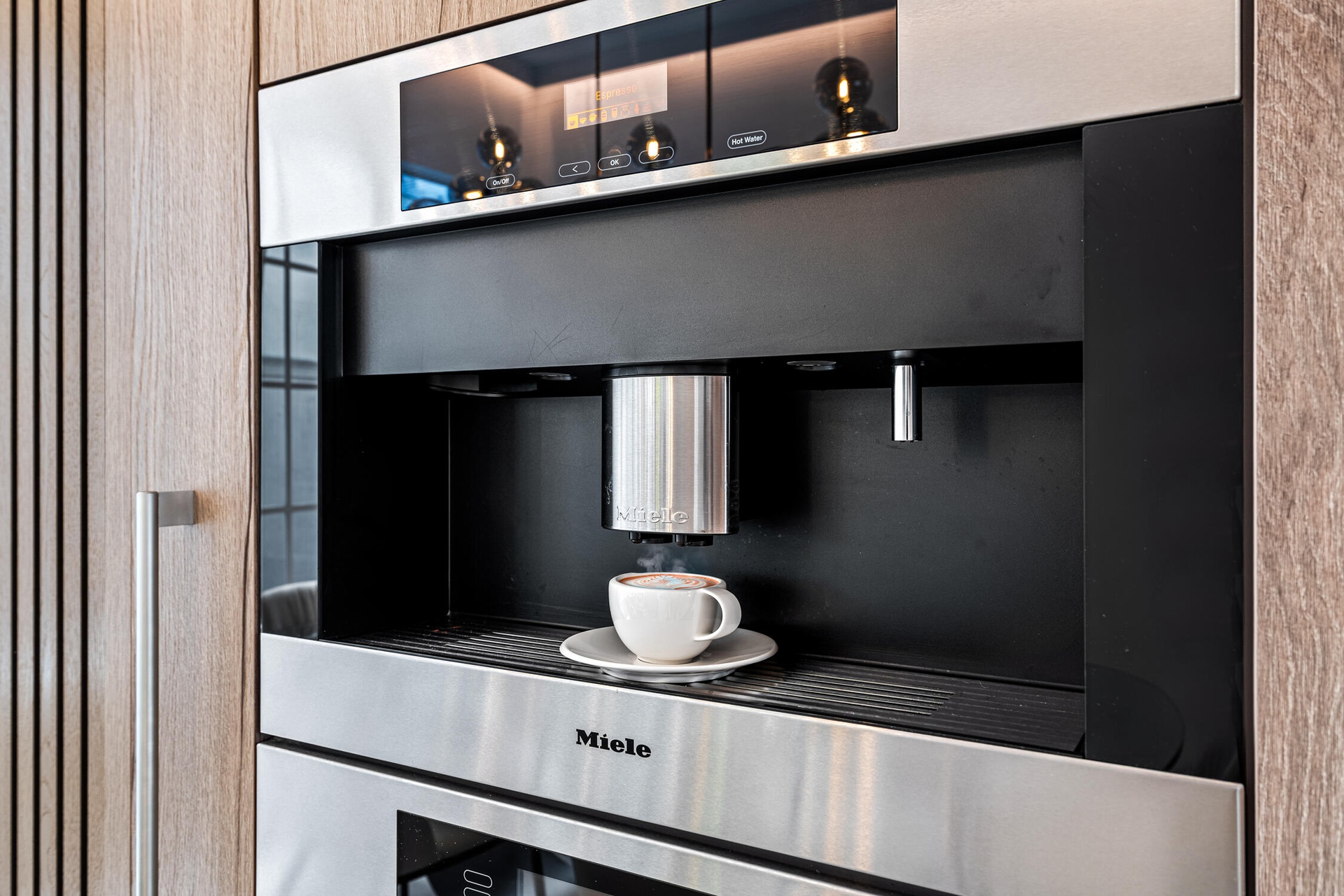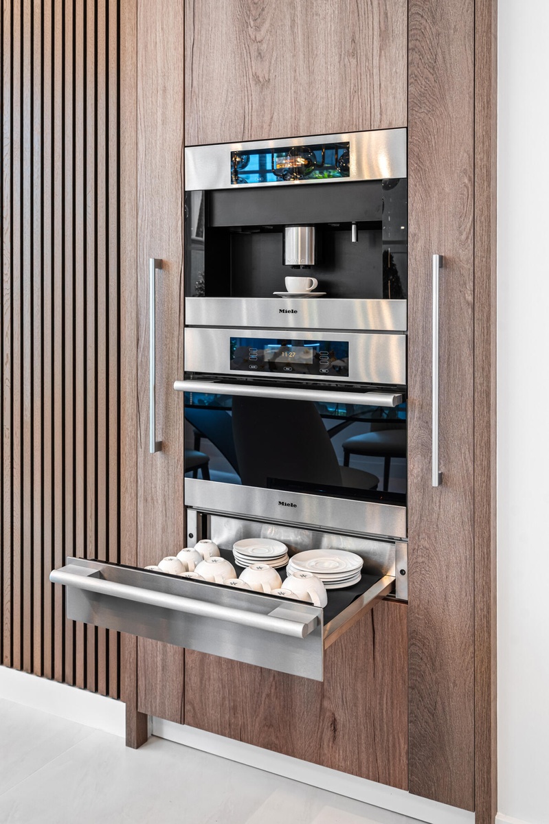 " Gourmet Kitchen: A chef's dream featuring top-of-the-line Miele appliances with touch controls, including a cooktop, double oven, built-in coffee machine, steamer oven, plate & cup warming drawer, and dishwasher. Complemented by a Fisher & Paykel refrigerator and Elica air extractor.