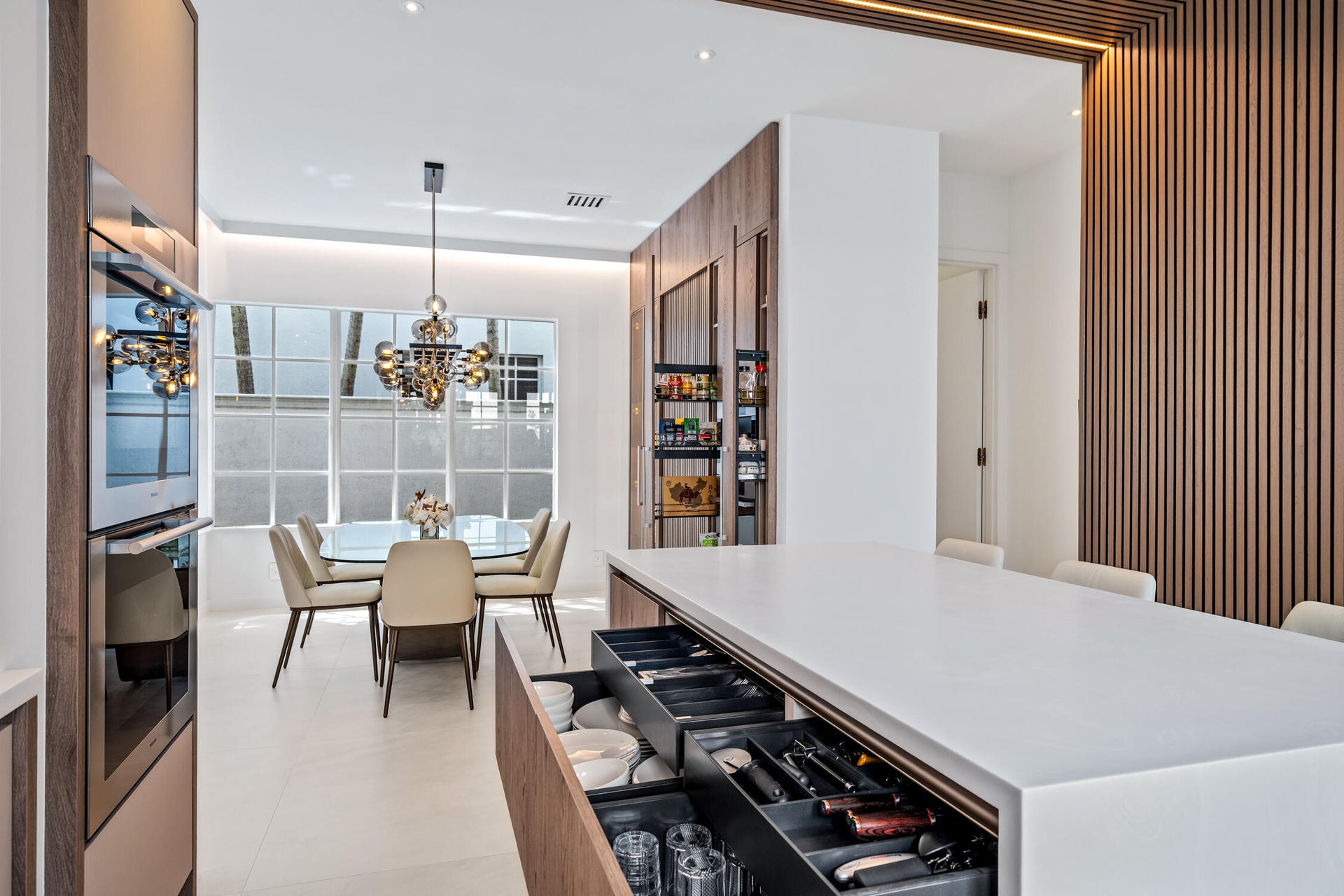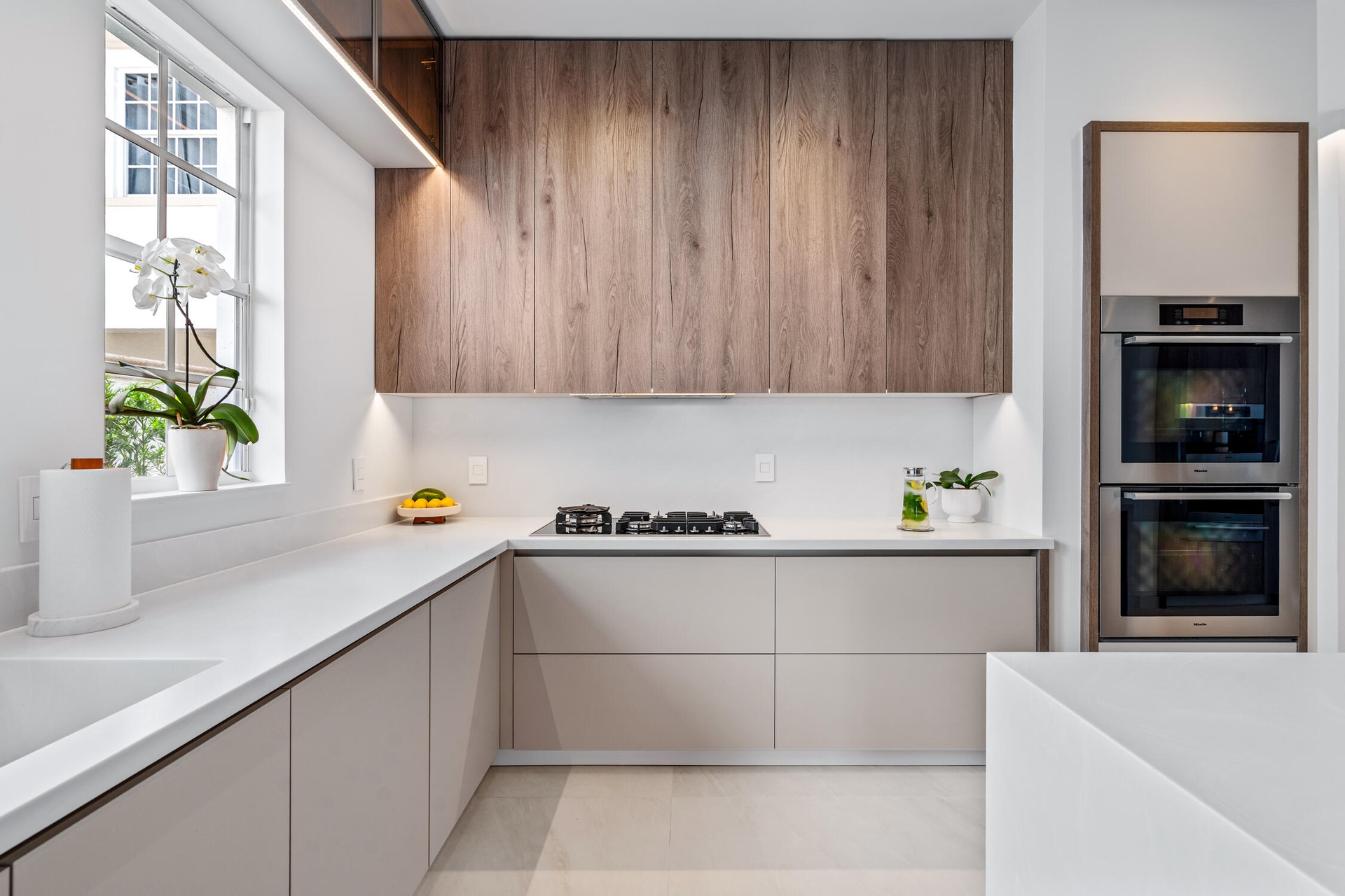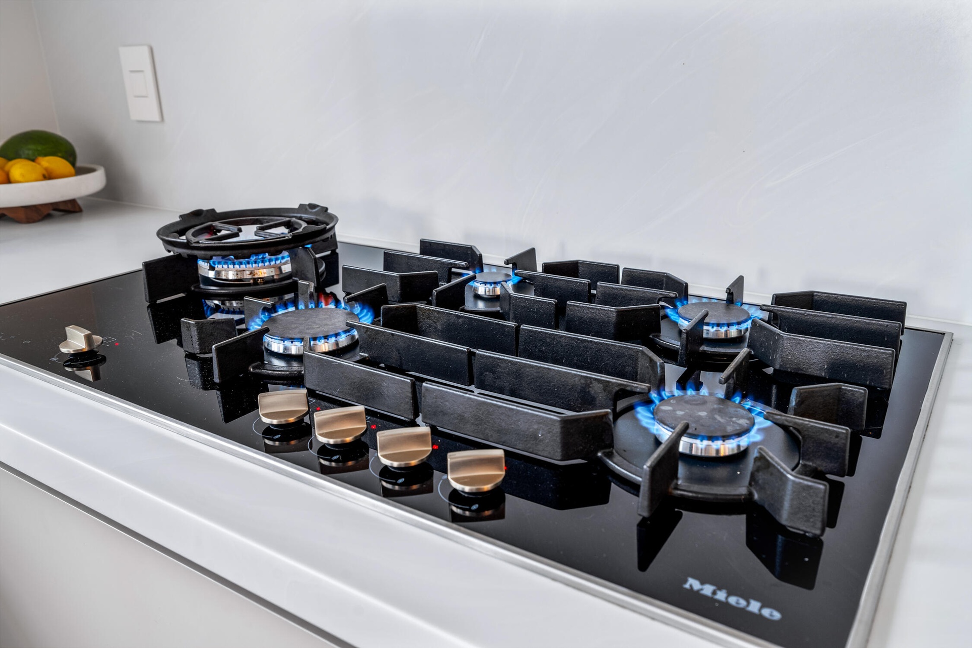 " Gourmet Kitchen: A chef's dream featuring top-of-the-line Miele appliances with touch controls, including a cooktop, double oven, built-in coffee machine, steamer oven, plate & cup warming drawer, and dishwasher. Complemented by a Fisher & Paykel refrigerator and Elica air extractor.