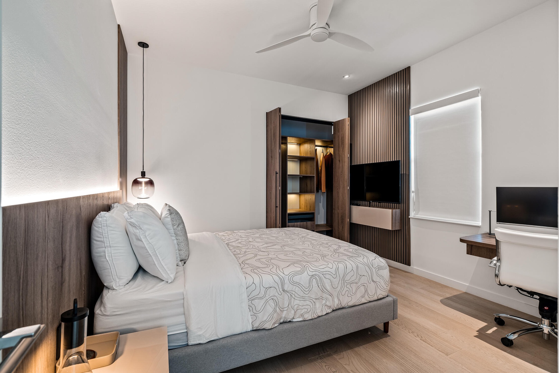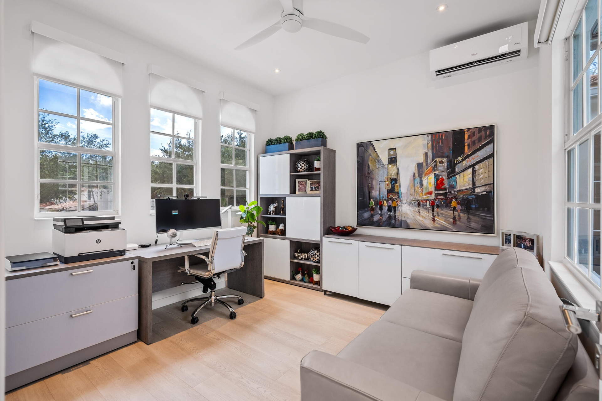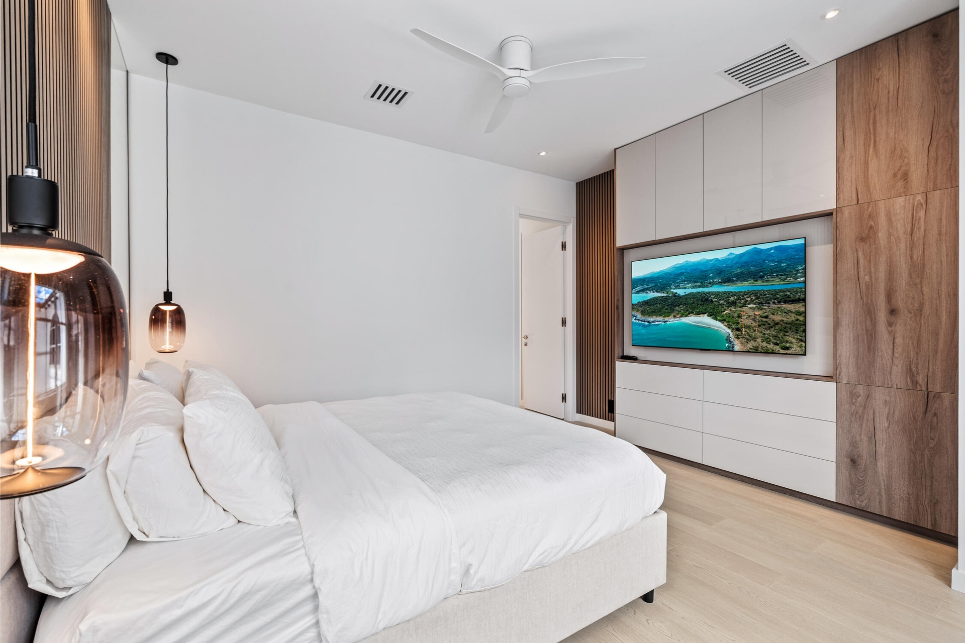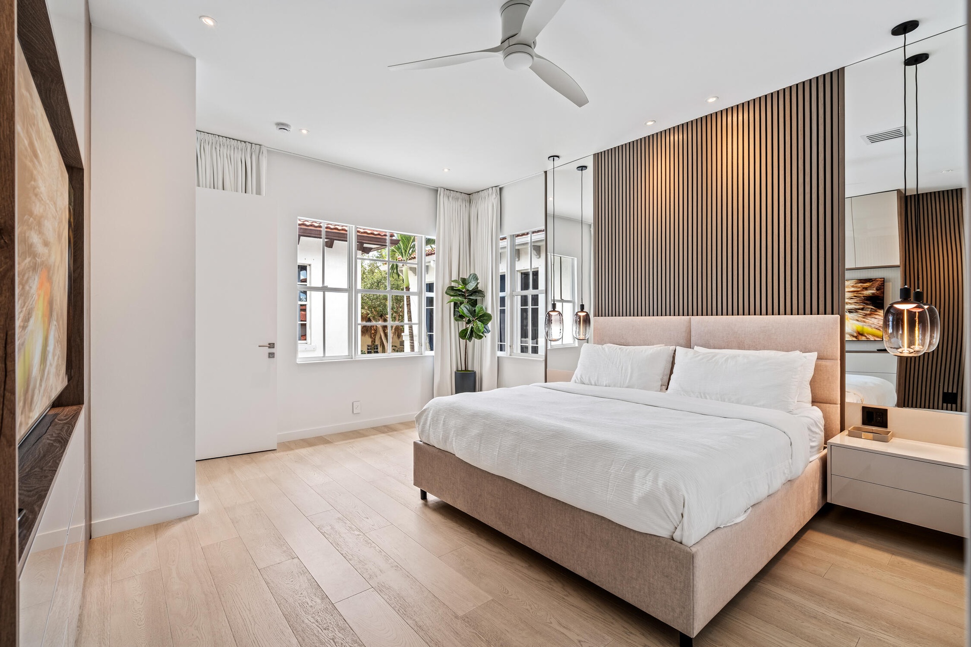" Modern Elegance: Italian-engineered wood flooring throughout the second floor and staircase, complemented by sleek glass railings. Custom recessed lighting integrated with a Legrand lighting system, along with contemporary ceiling fans in every upstairs room.