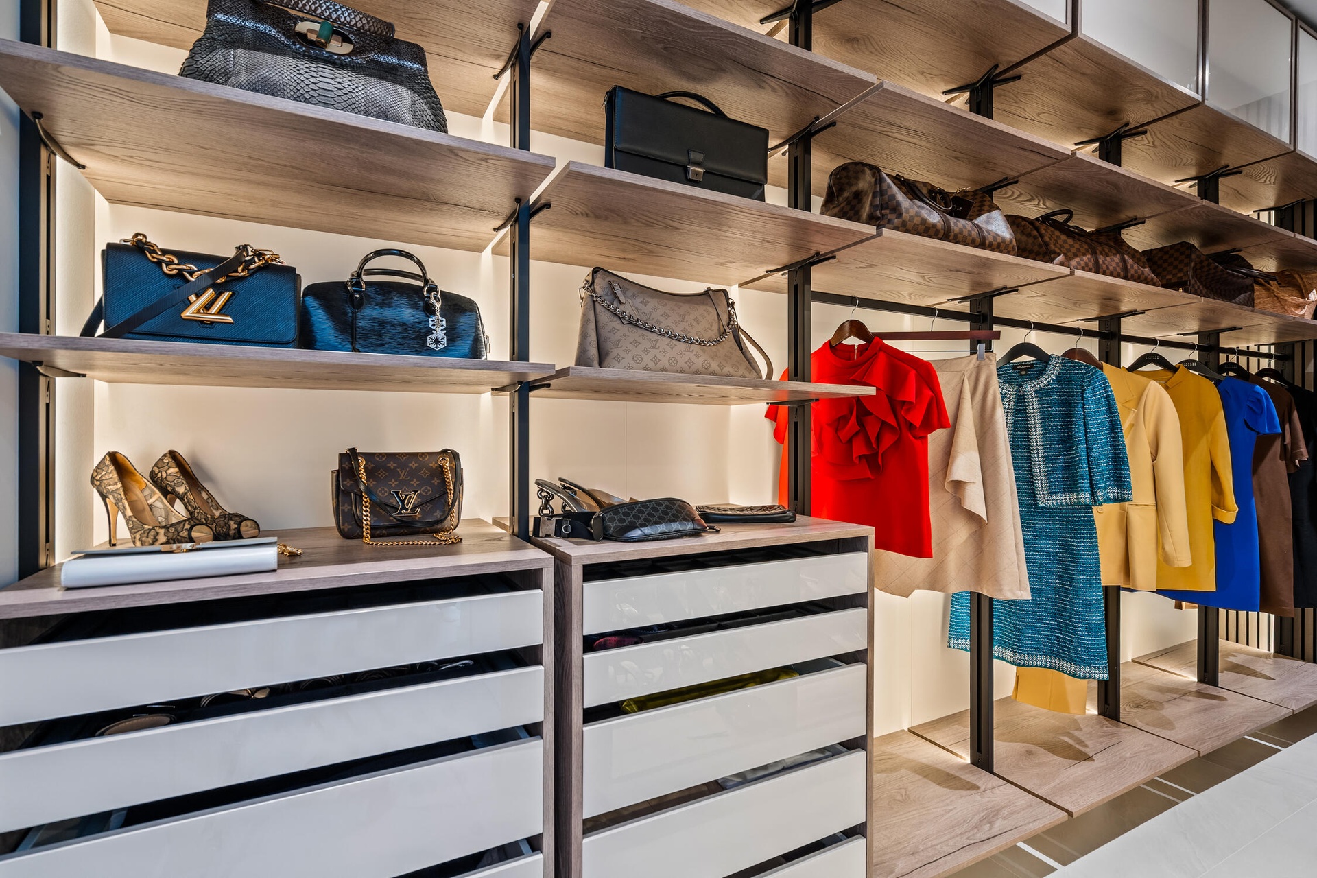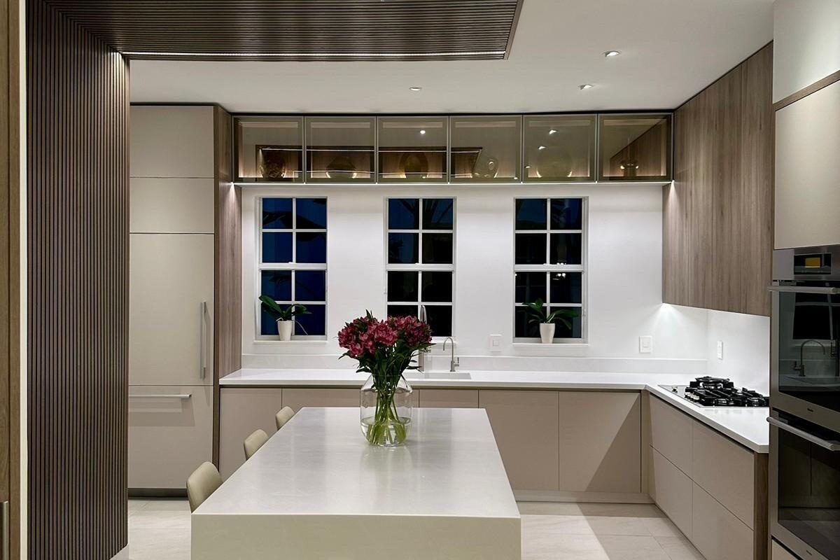 " Luxury Interiors: Custom-designed kitchen cabinets, bathroom vanities, and built-in bar with soft-closing mechanisms. Boutique-style walk-in closet and built-in closets in every bedroom. European soft-touch doors with hidden hinges and designer lighting fixtures throughout.
